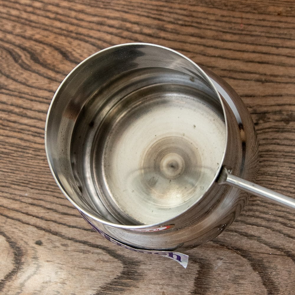インドのチャイ屋で必ず見かけるドヤです。日本でいう柄杓です。インドではお茶が入った鍋にこのドヤでミルクを入れ、そのまま混ぜたりします。せっかくチャイを作るのなら、ドヤも本場のものを使ってみてはいかがでしょうか?
