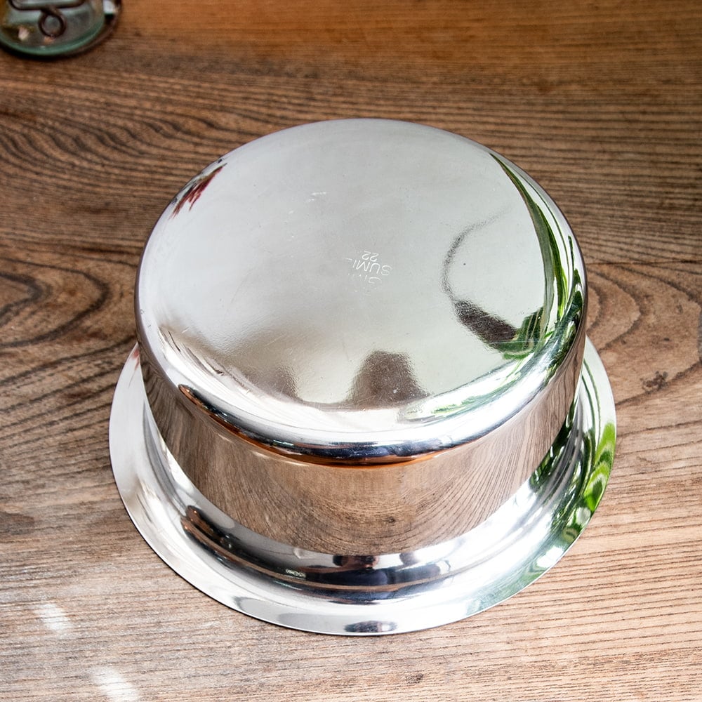 こちらはインド式の伝統の鍋で、バゴーナーといいます。丈夫なステンレスでできていて、見た目も小さいシルクハットのようでキュート。カレー鍋として使ったり、深さがあるので様々な料理に用いられる汎用性の高い鍋です。鍋には取手が付いていませんので、別売りのインドの鍋つかみをご使用ください。