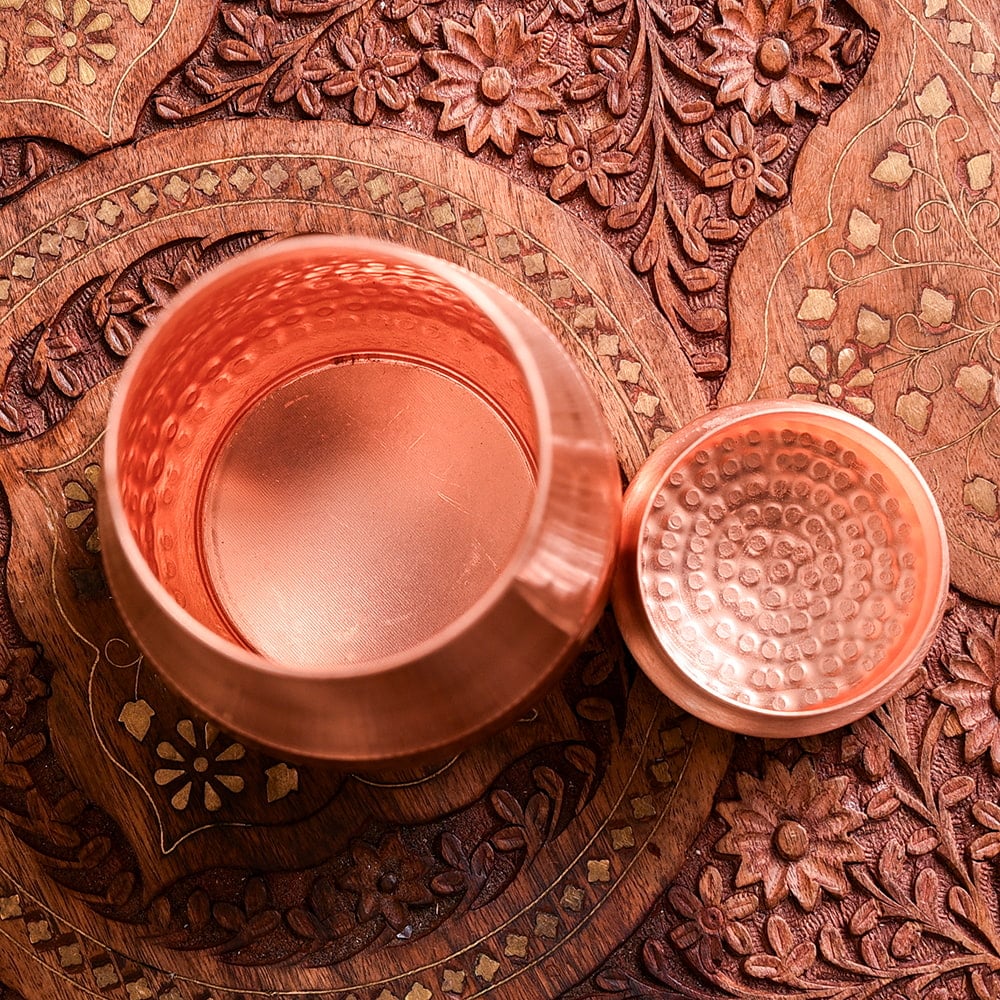 銅は人類が最初に利用し始めた金属とされています。古代から銅は、食器などへ用いられてきました。古代インドでも銅製品は使われており、紀元前300年ごろの『チャラカ・サンヒター』(Charaka Samhita)というアーユルヴェーダの医学書では、水を浄化するために銅製の鍋に水を貯蔵する方法が記述されていました。■お手入れ方法