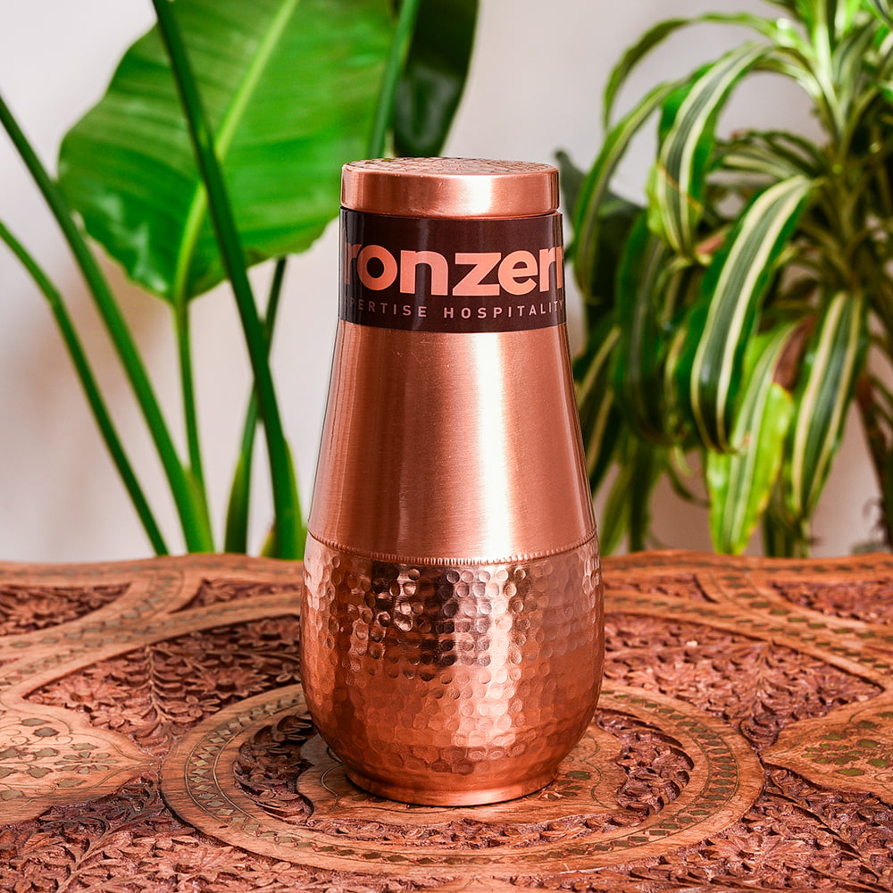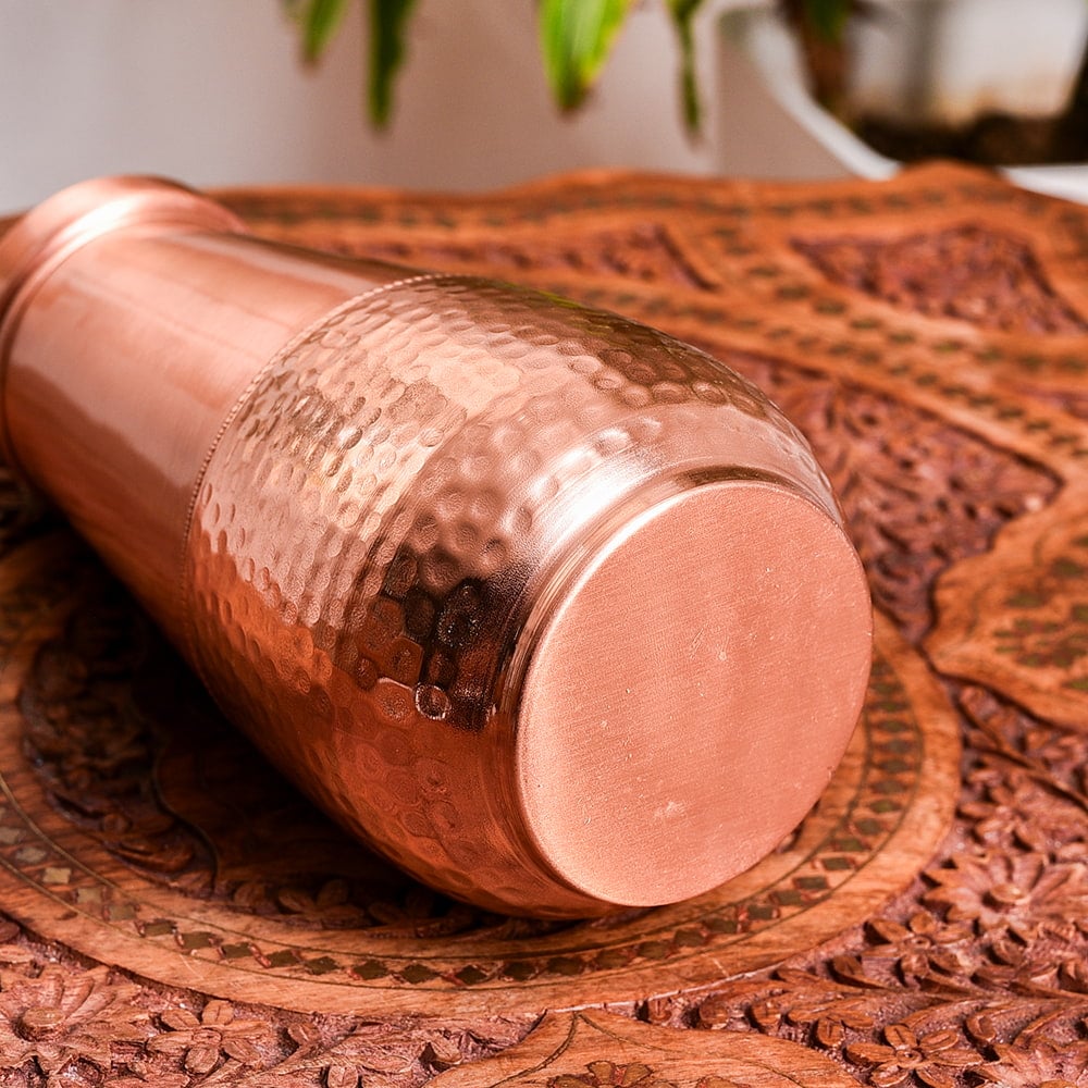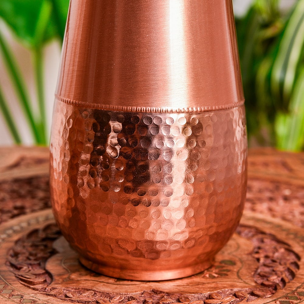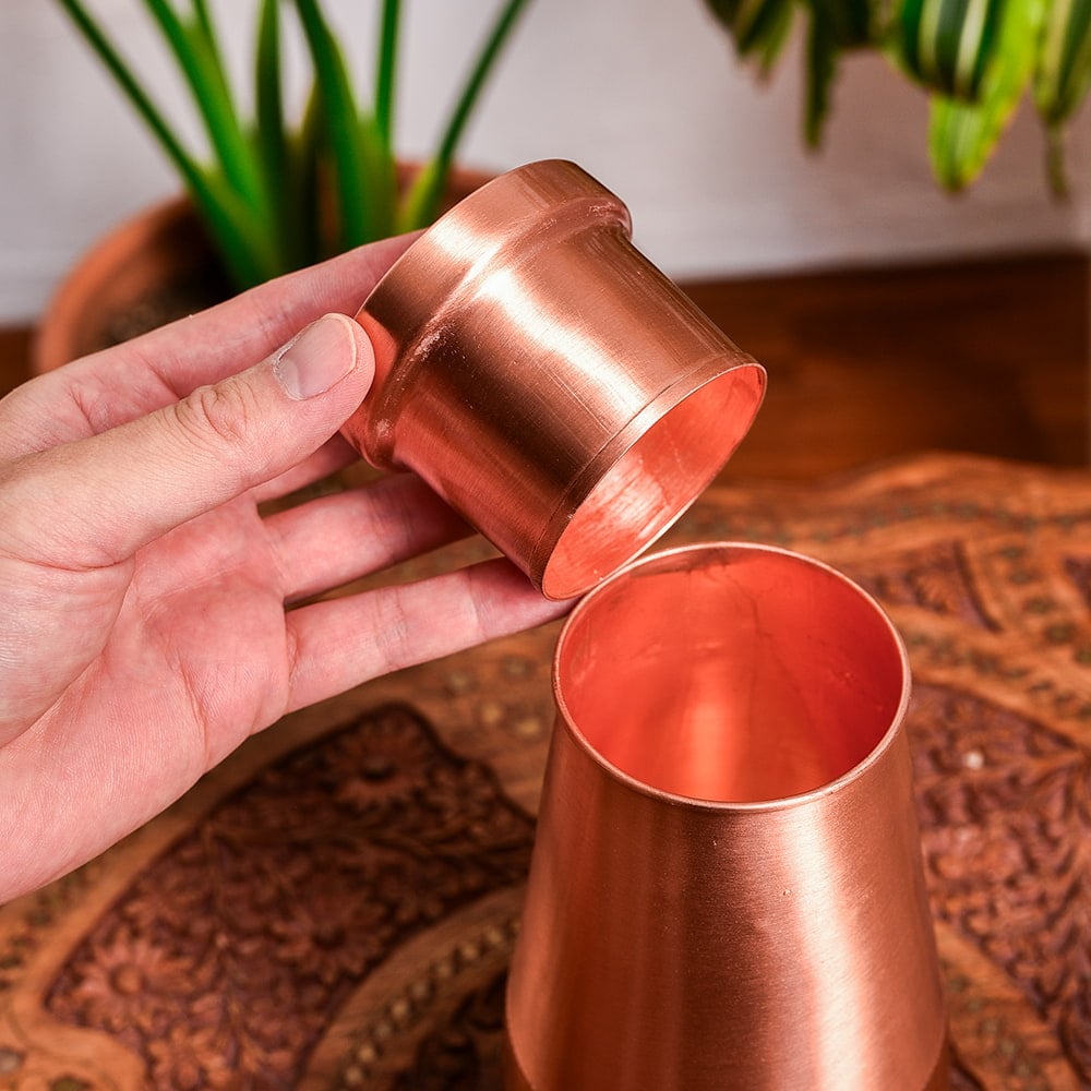 インドでは、アーユルヴェーダの影響があり、銅製品は大変人気があります。中にはメッキをした物など、ピンからキリまでさまざまな物があるのですが、こちらの水差しは美しく装飾された高級仕様。見た目の美しさに加え、99%以上のピュアな銅で作られており、実用面と美しさを両立させております。銅製ボトルや水差しは、一般的に無地の物が多いですが、こちらは美しく装飾されているので、インテリアとしても大変見栄えがよく、気持ちよく使うことができます。