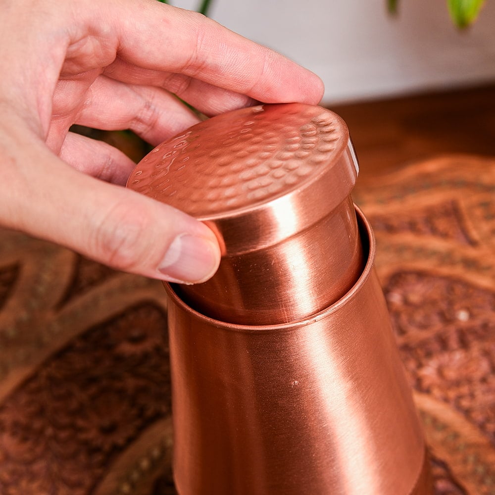 こちらは、卓上で使える銅製の水差しです。美しいボトルの曲線に加え、見る角度によって表情が変わる綺麗な槌目模様が施されています。滑り止めの役目にもなっていて、持ちやすさも魅力です。上部の蓋はコップになっているので、すぐに注ぐことができます。また、卓上用なのですぐに注げるようコップはネジ等で留まっておりません。水筒のように持ち運びはできない仕様なので、ご留意ください。