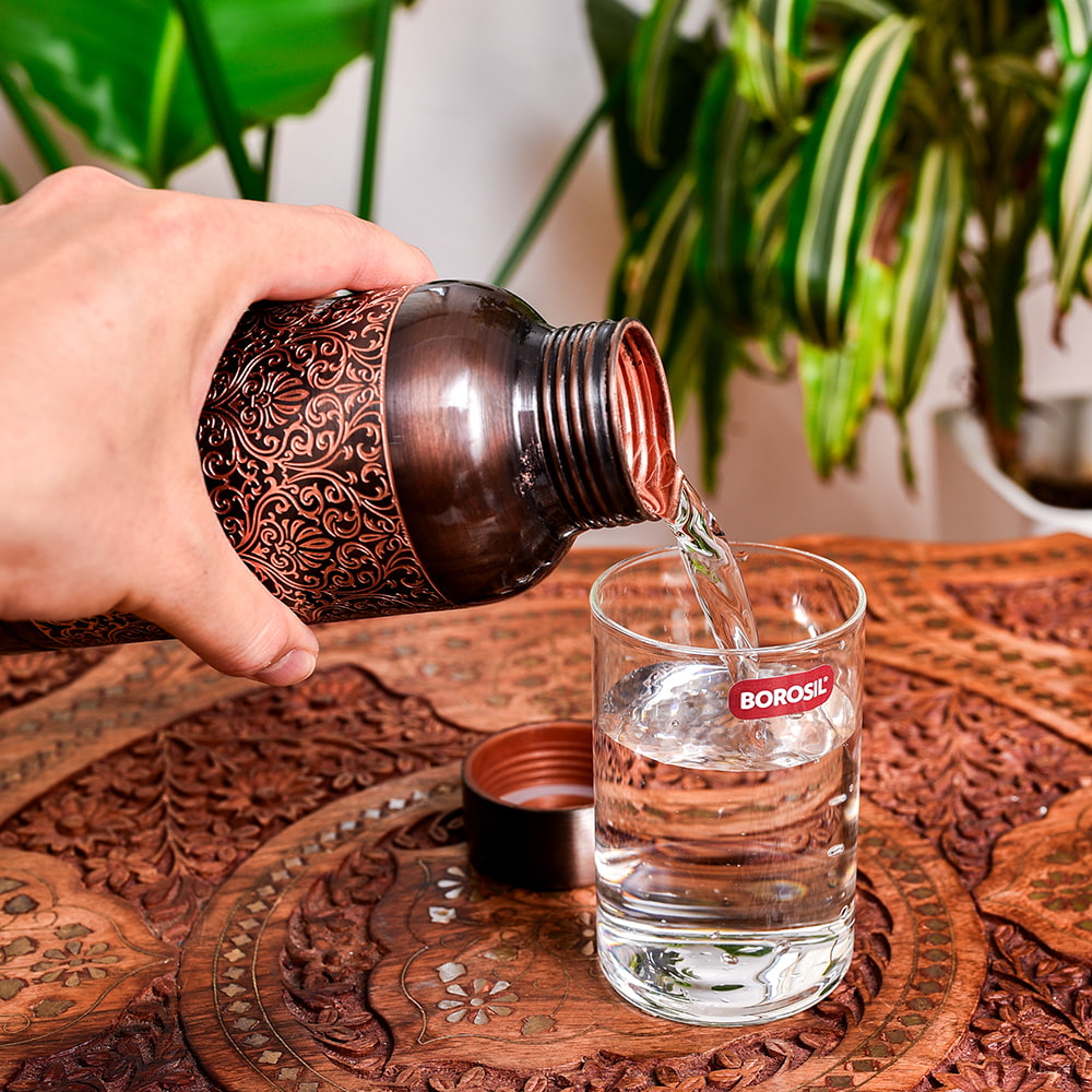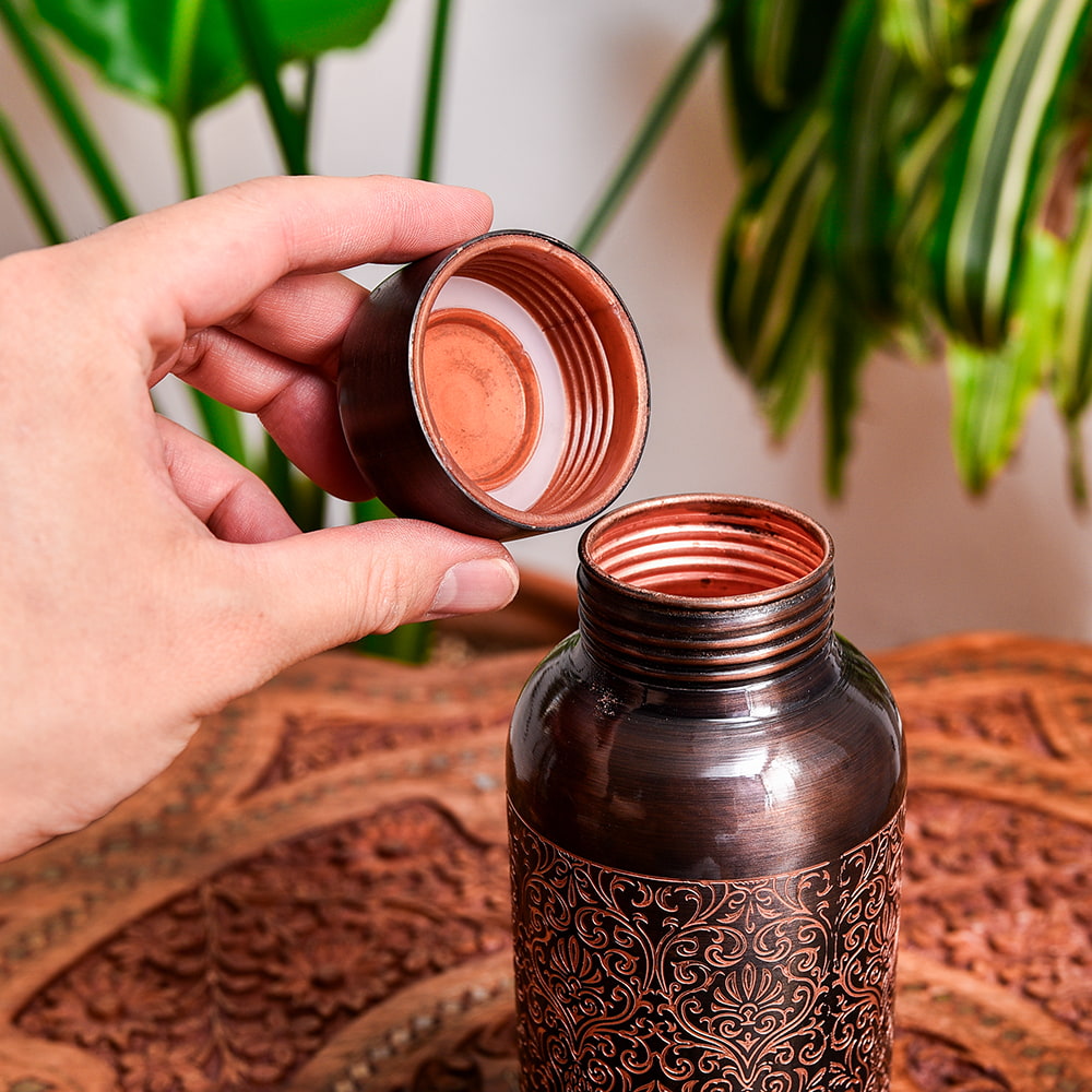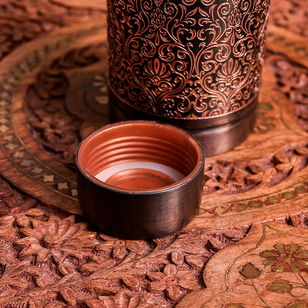 インドでは、アーユルヴェーダの影響があり、銅製品は大変人気があります。中にはメッキをした物など、ピンからキリまでさまざまな物があるのですが、こちらの水差しは美しく装飾された高級仕様。見た目の美しさに加え、99%以上のピュアな銅で作られており、実用面と美しさを両立させております。銅製ボトルや水差しは、一般的に無地の物が多いですが、こちらは美しく装飾されているので、インテリアとしても大変見栄えがよく、気持ちよく使うことができます。