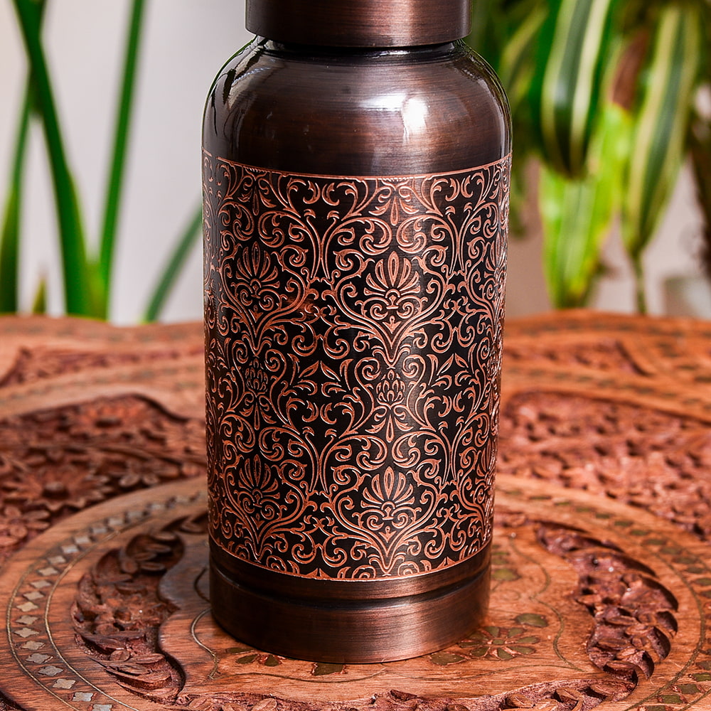 こちらは、卓上で使える銅製の水筒です。美しいボトルのダマスク模様が施されています。模様は彫り込みになっており、滑り止めとしても機能するため、持ちやすいのも魅力です。■しっかりとした作りの高級仕様