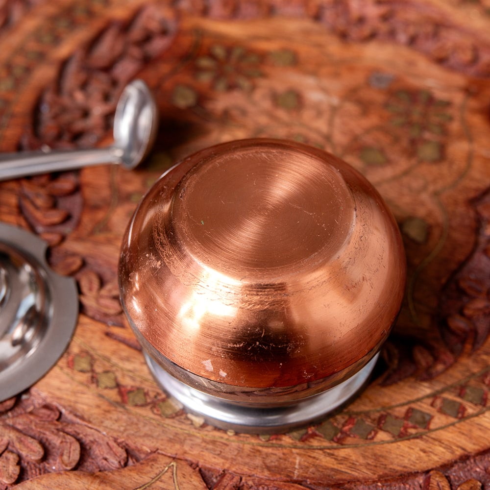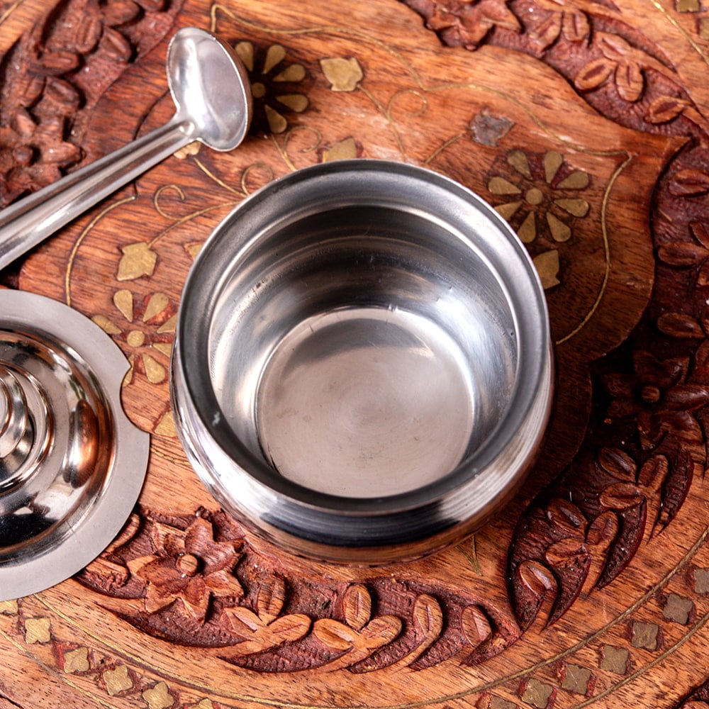 インドにおけるもっとも神聖なオイル、ギーをサーブするための小さなポットです。インドのご家庭や高級なレストランで食事をいただくと、このようなポットに温めたギーが供されます。これは大切なお客様へのおもてなし意味します。温めたギーをチャパティやご飯にかけると格段に風味があがり、大変嬉しいものです。もちろん、ギー以外にも砂糖を入れたり、さまざまな用途へご使用いただけます。