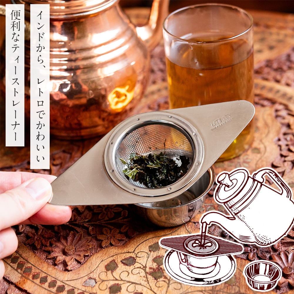 インドでチャイを作る際に使われている茶こし器です。持ちやすく、コップに引っ掛けておけるのでとっても使いやすいです。チャイの他、緑茶やハーブティーなど、さまざまなお茶を淹れる際に使うことができます。英国のヴィンテージ品であるOld Hallのシリーズを彷彿とさせる、スタイリッシュながらレトロでクラシカルなデザイン。実用的に作られているからこそ、機能美によるシンプルで美しいフォルムです。