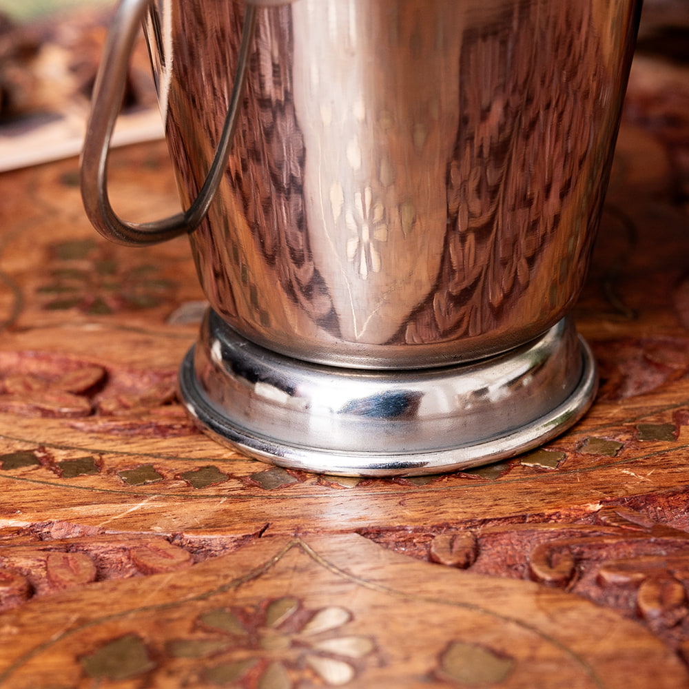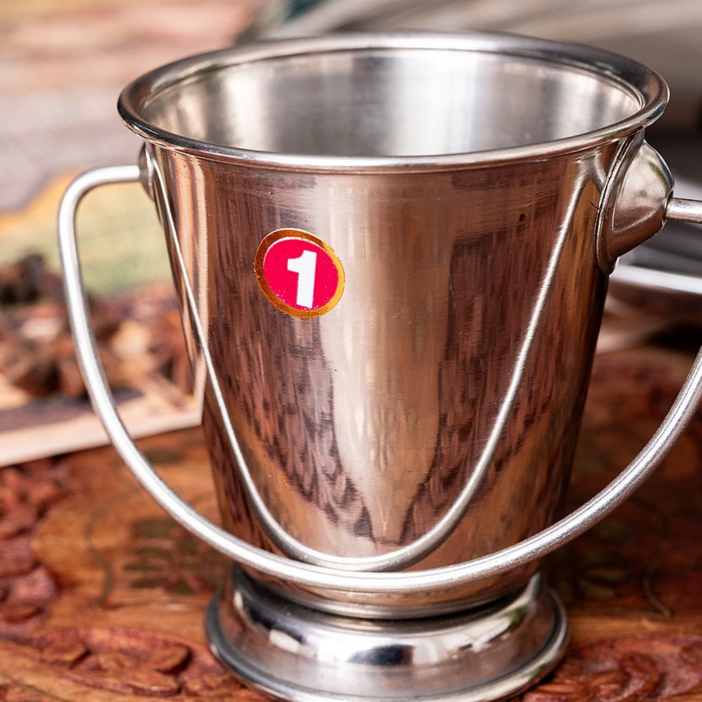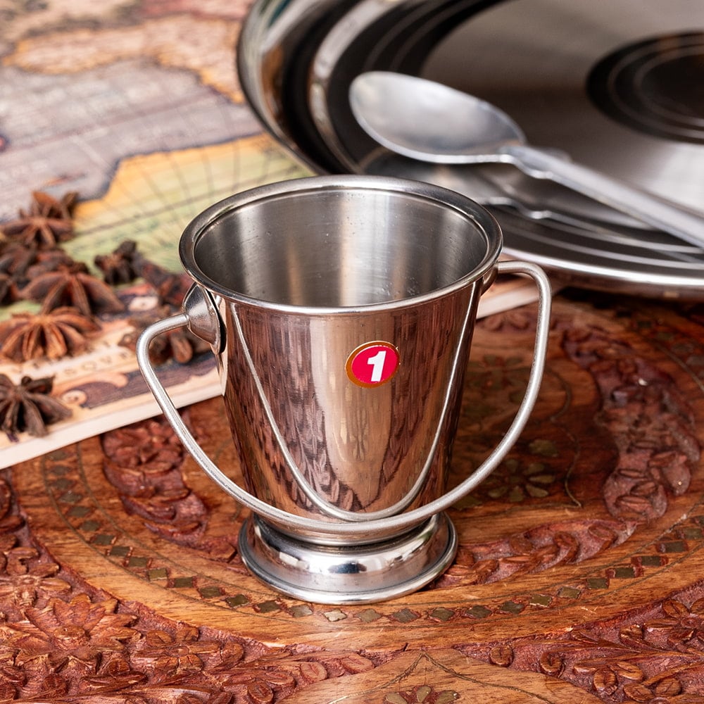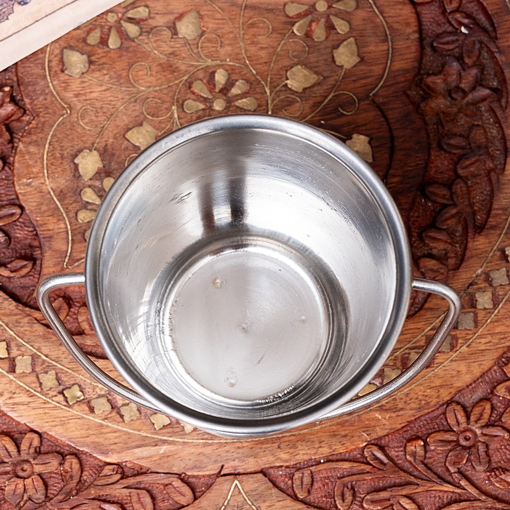 インドの雰囲気が素敵な、ステンレス製のバケツ型の容器です。取っ手がついていて、見た目もとてもかわいいです。〔No.1〕の小さめの物は、チャトニなどのソース類を入れる、ソースポットとして良いサイズです。より大きい〔No.2〕や〔No.3〕は、サンバルやラッサムといった少なめのカレーのおかわりをサーブする、カレーサーバーとして現地で使われています。もちろん、チャトニやカレーだけではなく、さまざまな食材を入れることができます。欧米では、ケチャップを入れたり、少し大きめの長めのポテトや、オニオンリングを提供するときにも使われています。野菜スティックなどにも良さそうですね。