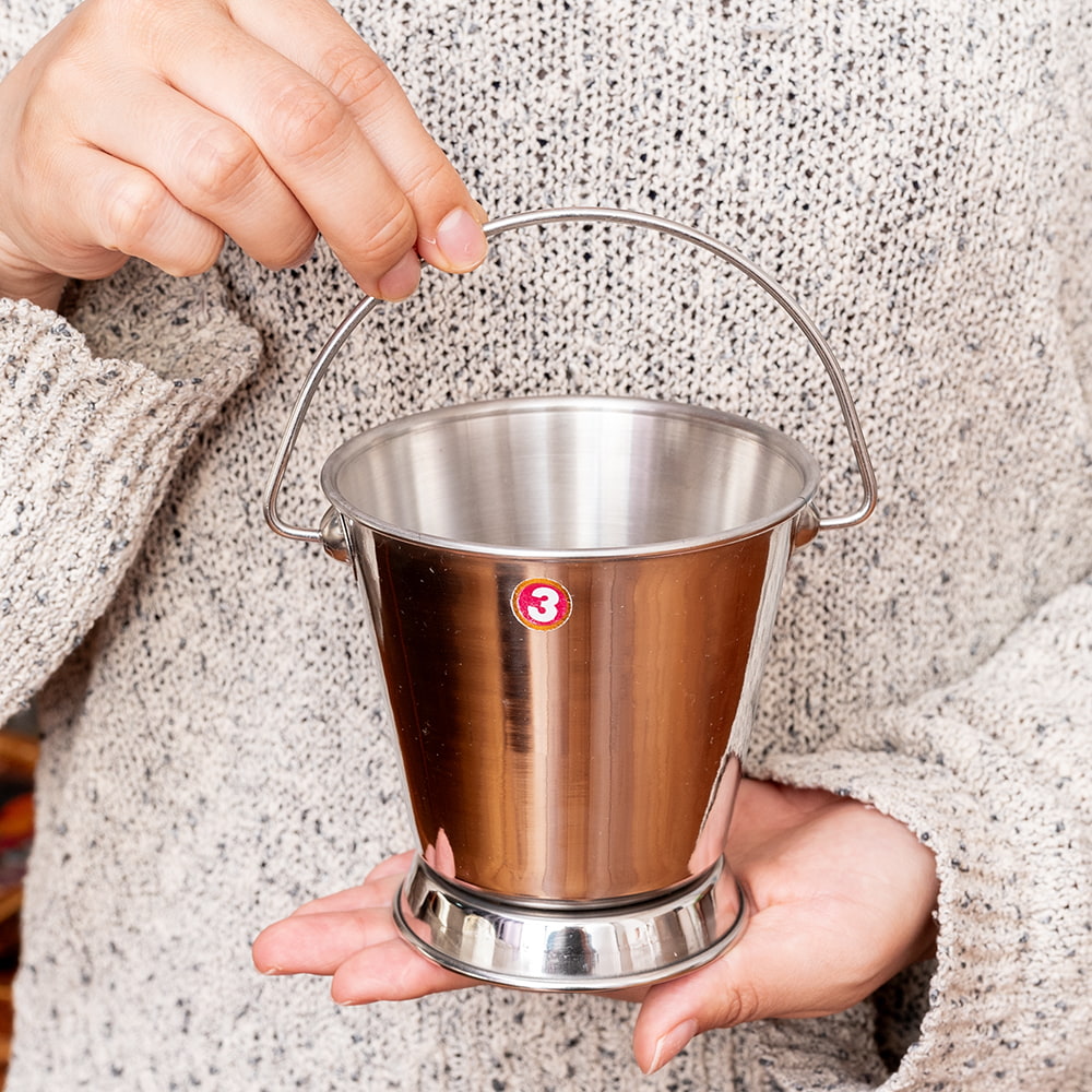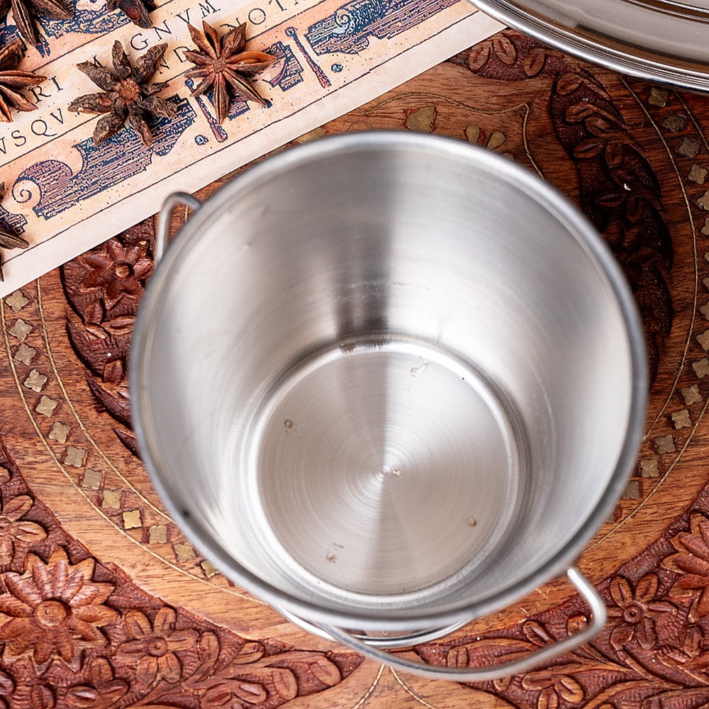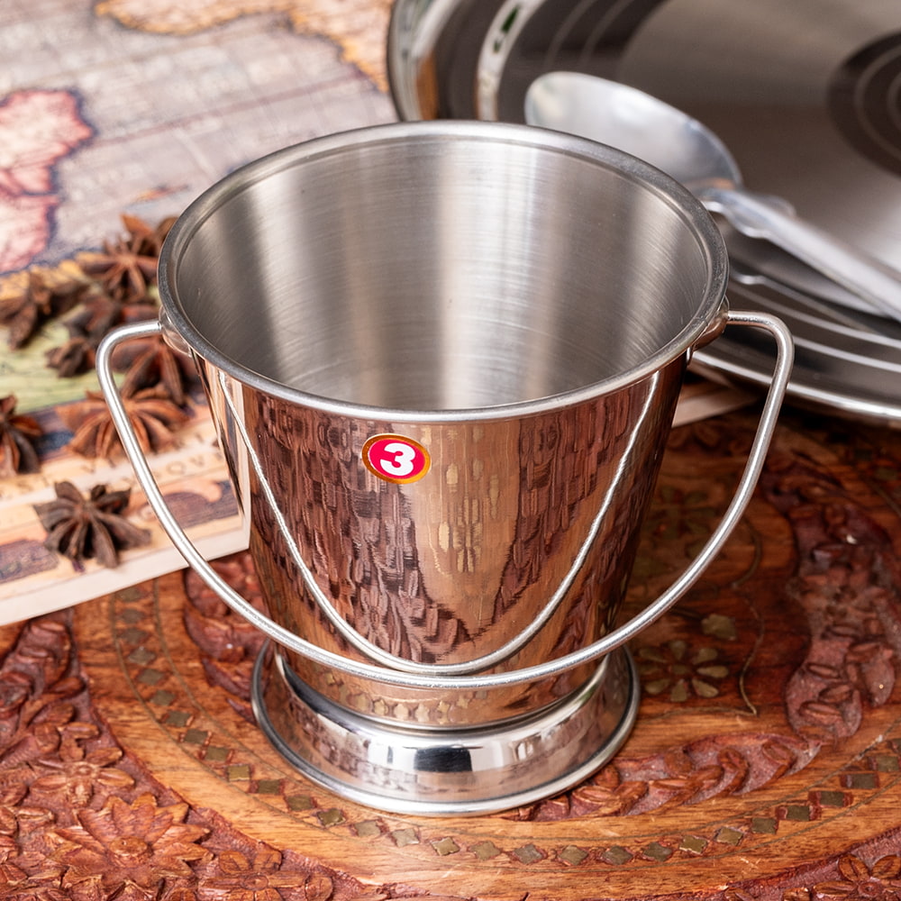 インドの雰囲気が素敵な、ステンレス製のバケツ型の容器です。取っ手がついていて、見た目もとてもかわいいです。〔No.1〕の小さめの物は、チャトニなどのソース類を入れる、ソースポットとして良いサイズです。より大きい〔No.2〕や〔No.3〕は、サンバルやラッサムといった少なめのカレーのおかわりをサーブする、カレーサーバーとして現地で使われています。もちろん、チャトニやカレーだけではなく、さまざまな食材を入れることができます。欧米では、ケチャップを入れたり、少し大きめの長めのポテトや、オニオンリングを提供するときにも使われています。野菜スティックなどにも良さそうですね。