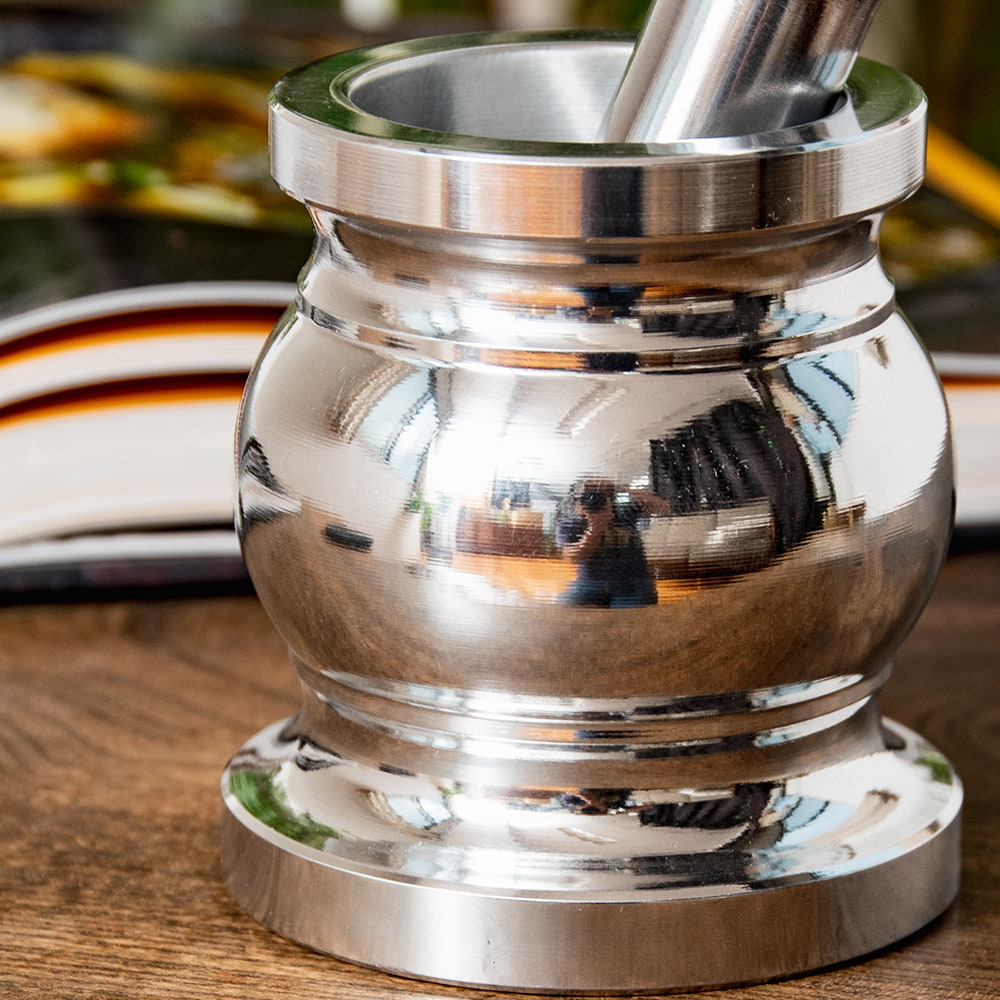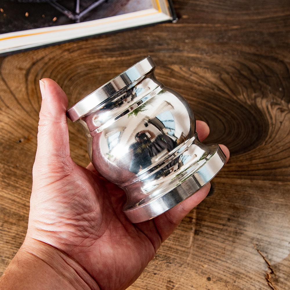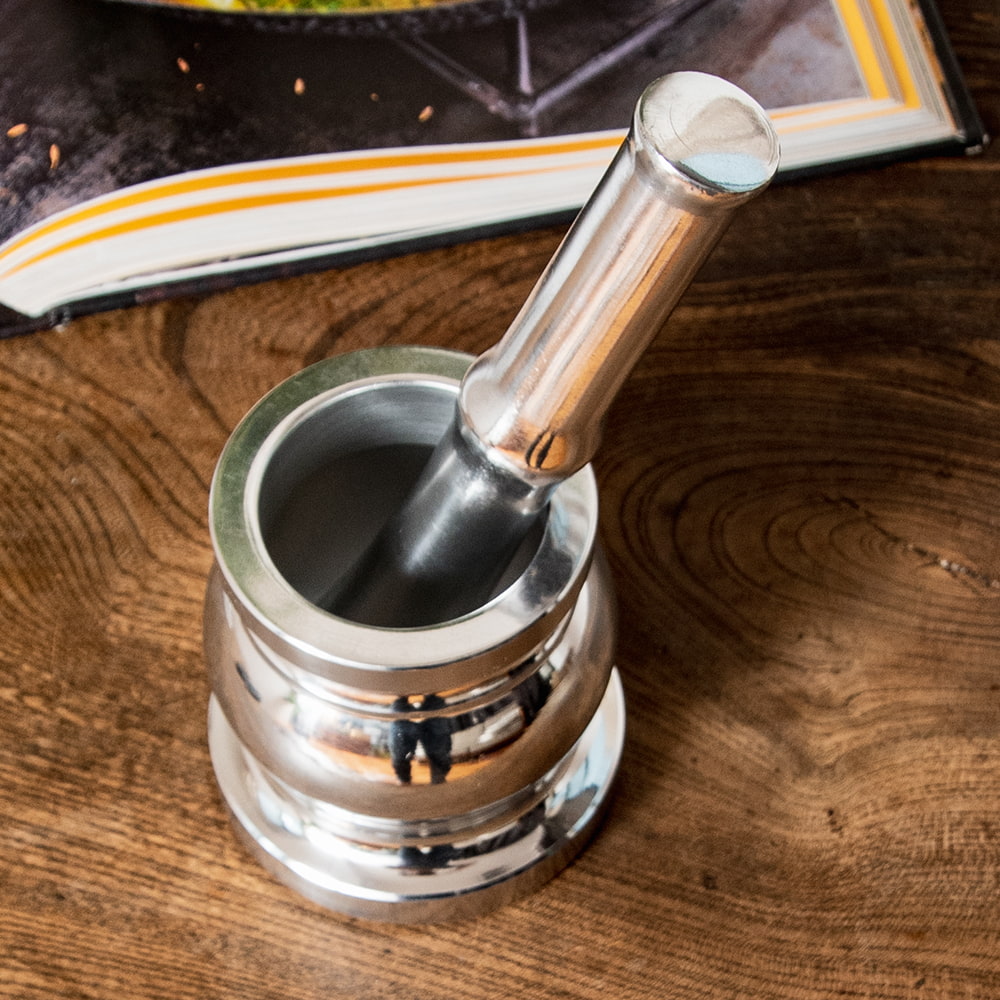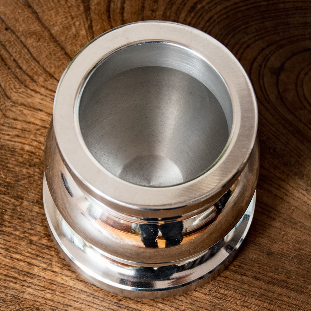 インド・デリーから届いたエレガントなアルミ製のスパイスグラインダーです。伝説の料理人のキッチンにありそうなグラマラスな造形が素晴らしいですね。単なる調理器具の域を越えて、飾るだけでも空間がキリリと引き締まる素敵な一品です。お値段は決して安くありませんがスパイス料理・マサラ料理を愛好する人ならぜひ身の回りに置いておきたいアイテムですね。■スパイスを自分でパウダーに!