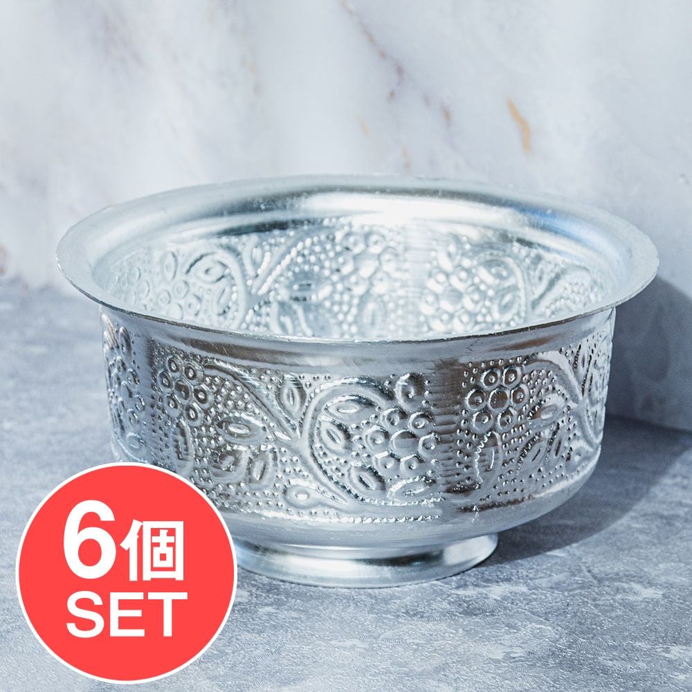 【6個セット】インド伝統唐草エンボスの脚付きアルミボウル 水盆 直径13cm 通販店