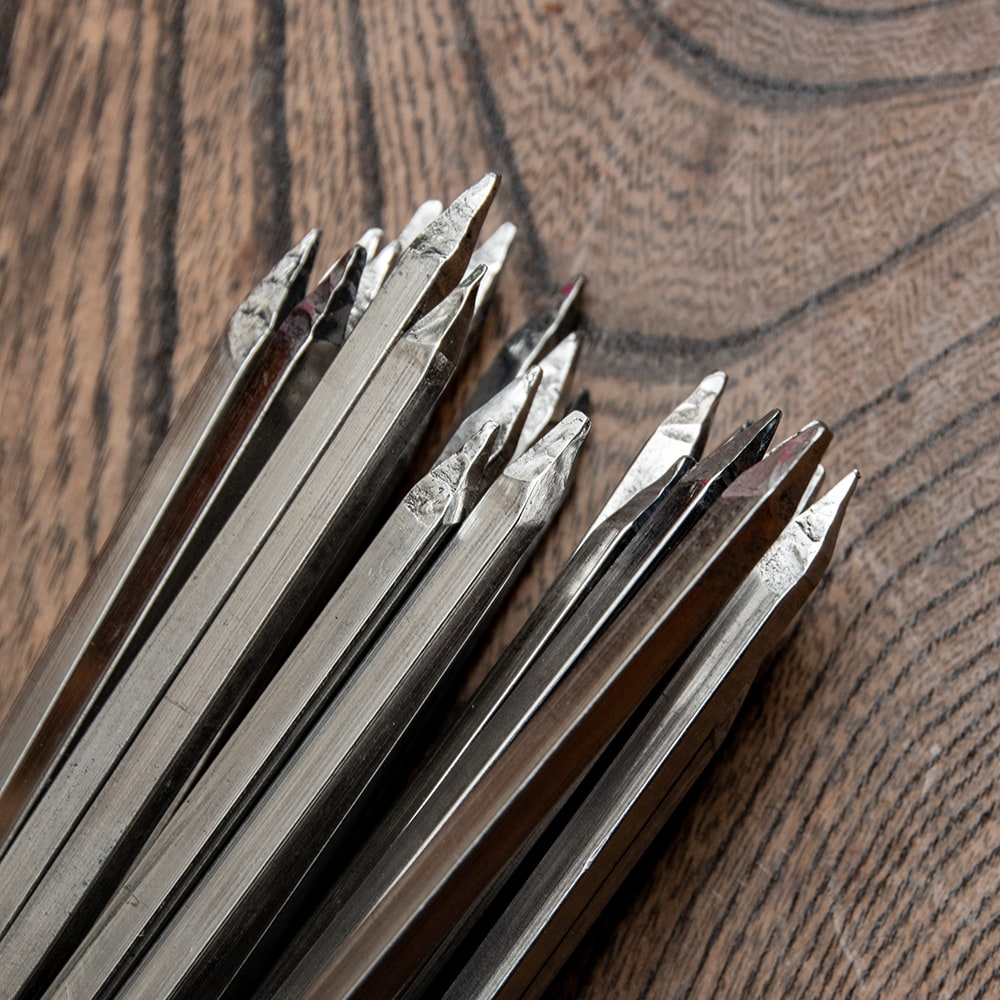 インドの名物料理、チキンティッカやパニールティッカ、タンドリーチキンといった串焼きに使われる鉄串です。長さ60cmほどもあり無骨な作りはまさに現地仕様。ジャマー・マスジット周辺など、インドの屋台が多く見られる地域ではチキンティッカがこの串に刺さった状態でズラリと炙られているのです。ひき肉を巻いて「シークケバブ」を作ったり、キャンプで串焼きを楽しんだり、使い道は様々。先端が尖っているので怪我にはご注意!