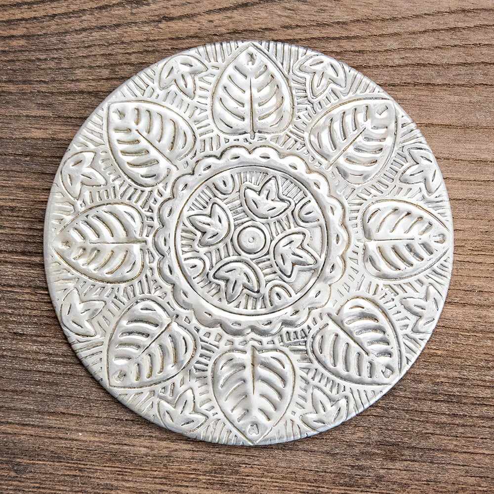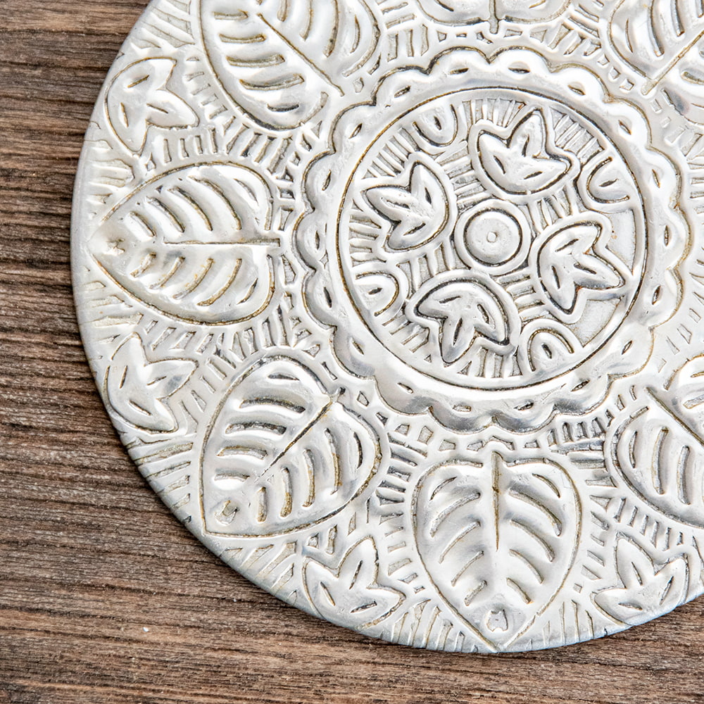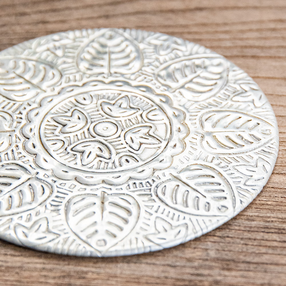 デリーから6時間ほど離れたところにあるイスラム街モラダバードから、手仕事の光る上品な金属製コースターが届きました。唐草模様や槌目、筋目加工が施されたコースターは鈍く光る金属の質感と相まってテーブルまわりを美しく飾ってくれます。職人による手仕事のため、一つ一つが微妙に異なった仕上がりになっています。ハンドメイドならではのデザインのゆらぎが生き生きとした質感を感じさせます。使い込むにつれて風合いが増していきますので、長く楽しむのにおすすめの一品です。