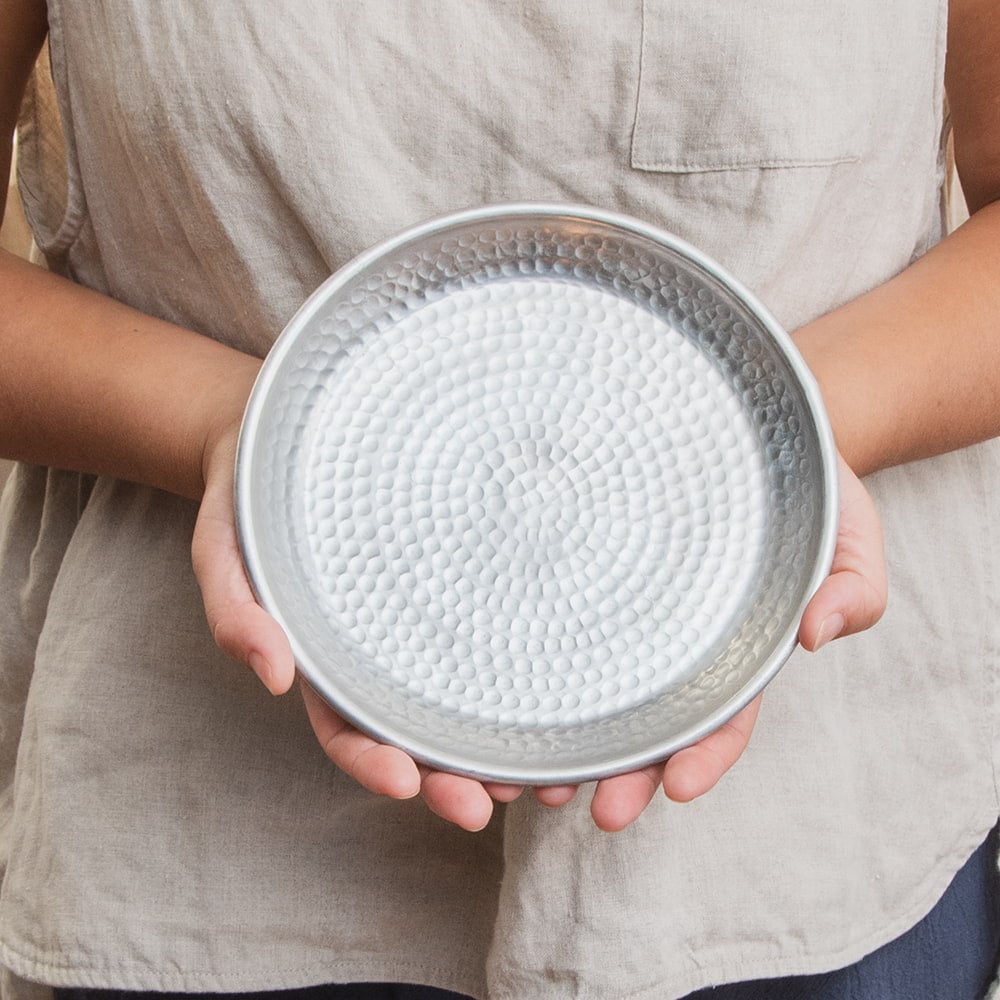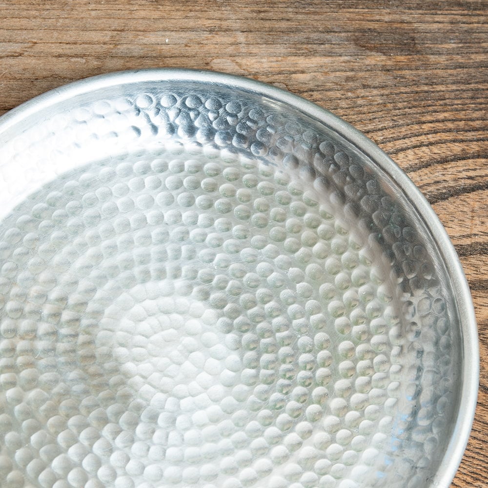 鎚で丁寧に手打ちして作られた高級感のある円形のお皿です。槌目により立体感が出て、光の加減で表情を変えてくれるので、とても見た目が良いです。お皿に触れると、微かに槌目の凹凸を感じることができます。こちらはデリーから6時間ほど離れたところにあるイスラム街モラダバードの産品。ムスリム職人の手仕事が光る上品なアルミ製のお皿です。アンティーク感のある渋い光沢感がテーブルまわりを美しく飾ってくれます。