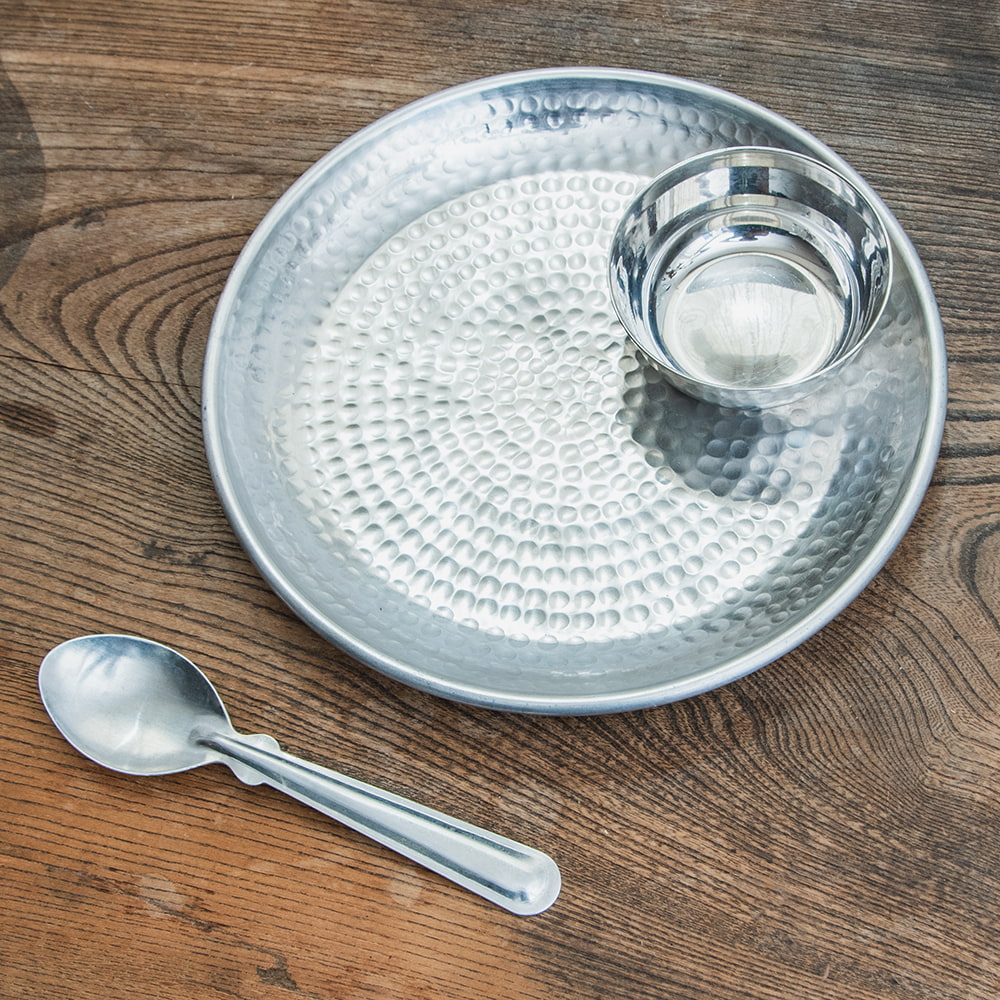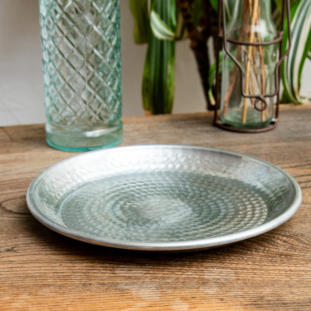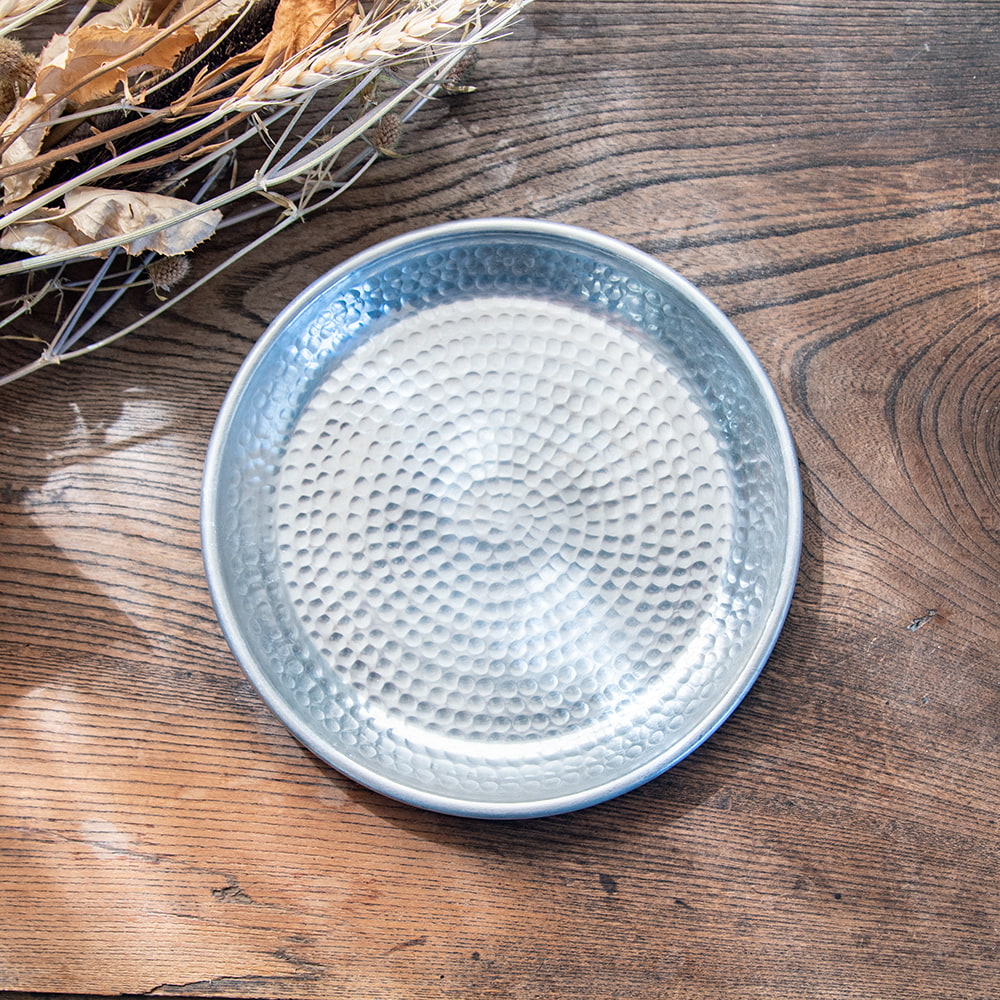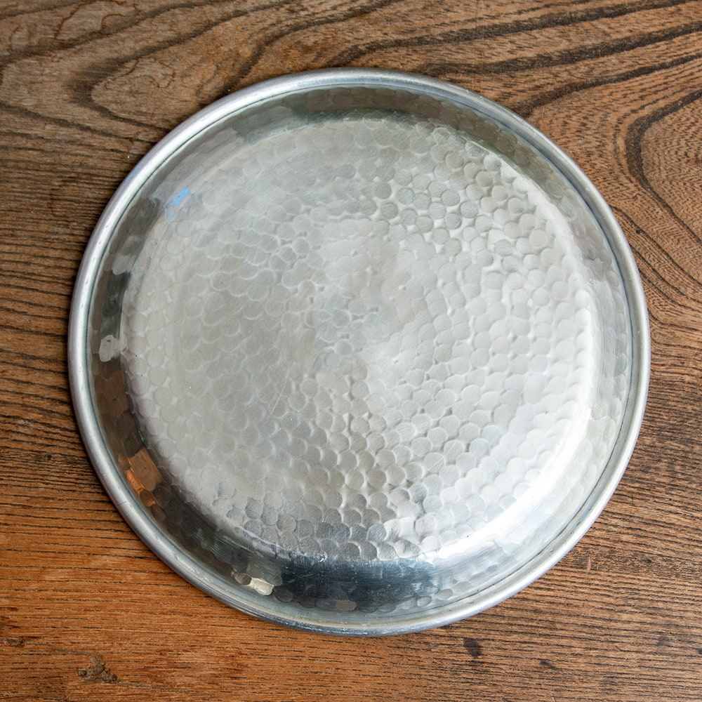 鎚で丁寧に手打ちして作られた高級感のある円形のお皿です。槌目により立体感が出て、光の加減で表情を変えてくれるので、とても見た目が良いです。お皿に触れると、微かに槌目の凹凸を感じることができます。こちらはデリーから6時間ほど離れたところにあるイスラム街モラダバードの産品。ムスリム職人の手仕事が光る上品なアルミ製のお皿です。アンティーク感のある渋い光沢感がテーブルまわりを美しく飾ってくれます。