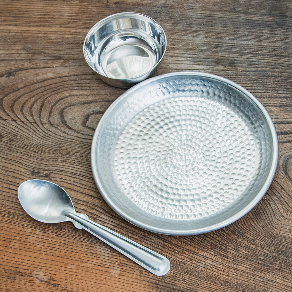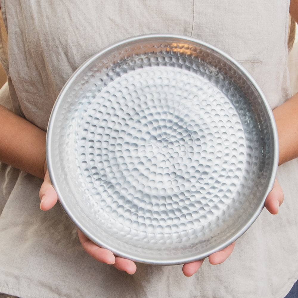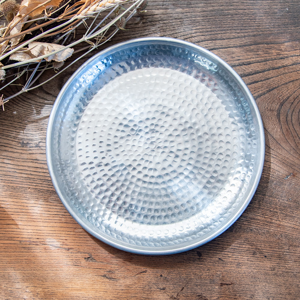 鎚で丁寧に手打ちして作られた高級感のある円形のお皿です。槌目により立体感が出て、光の加減で表情を変えてくれるので、とても見た目が良いです。お皿に触れると、微かに槌目の凹凸を感じることができます。こちらはデリーから6時間ほど離れたところにあるイスラム街モラダバードの産品。ムスリム職人の手仕事が光る上品なアルミ製のお皿です。アンティーク感のある渋い光沢感がテーブルまわりを美しく飾ってくれます。
