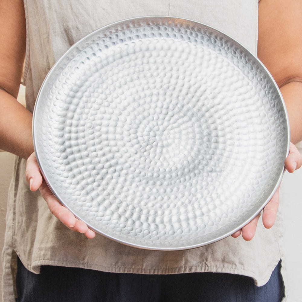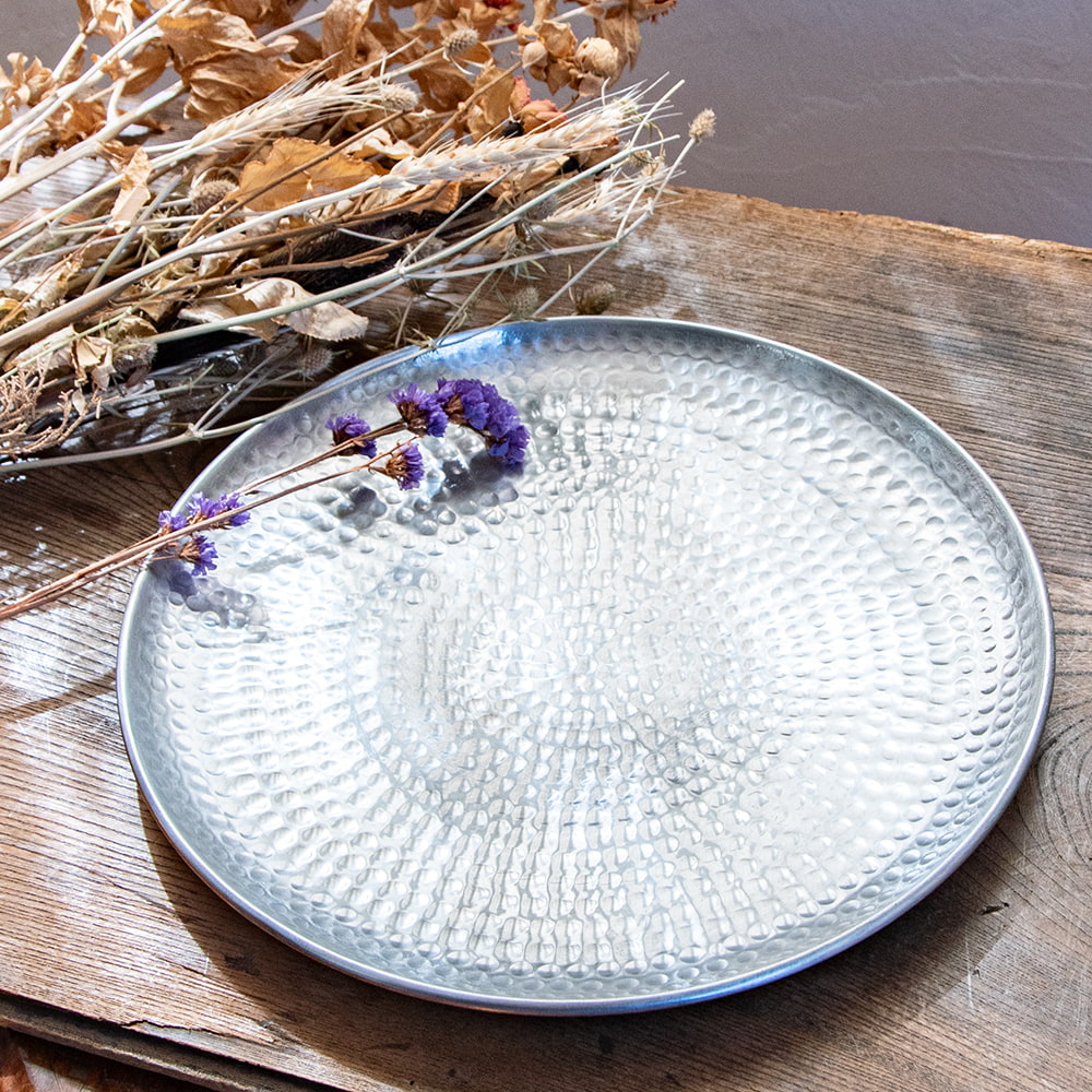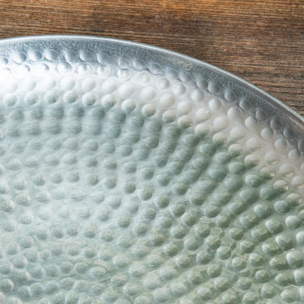 鎚で丁寧に手打ちして作られた高級感のある円形のお皿です。槌目により立体感が出て、光の加減で表情を変えてくれるので、とても見た目が良いです。お皿に触れると、微かに槌目の凹凸を感じることができます。こちらはデリーから6時間ほど離れたところにあるイスラム街モラダバードの産品。ムスリム職人の手仕事が光る上品なアルミ製のお皿です。アンティーク感のある渋い光沢感がテーブルまわりを美しく飾ってくれます。