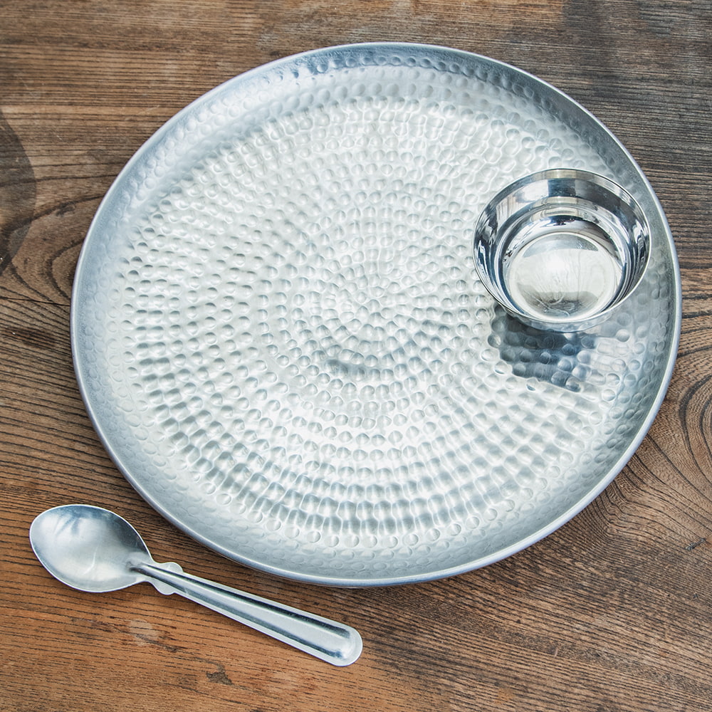 槌目仕上げのラウンドターリー アンティーク調のアルミ皿 ミールスターリー 直径:約32cm x 2個