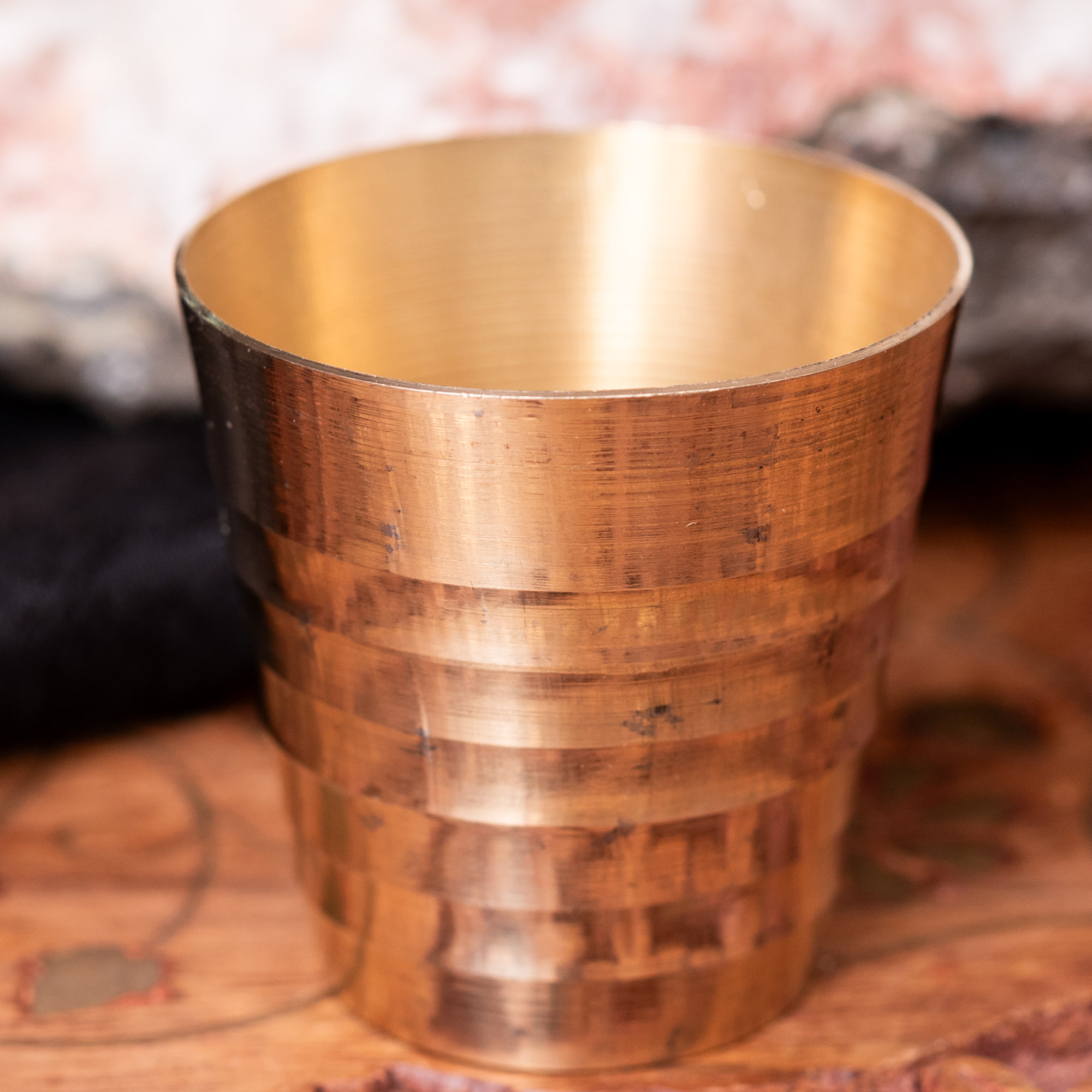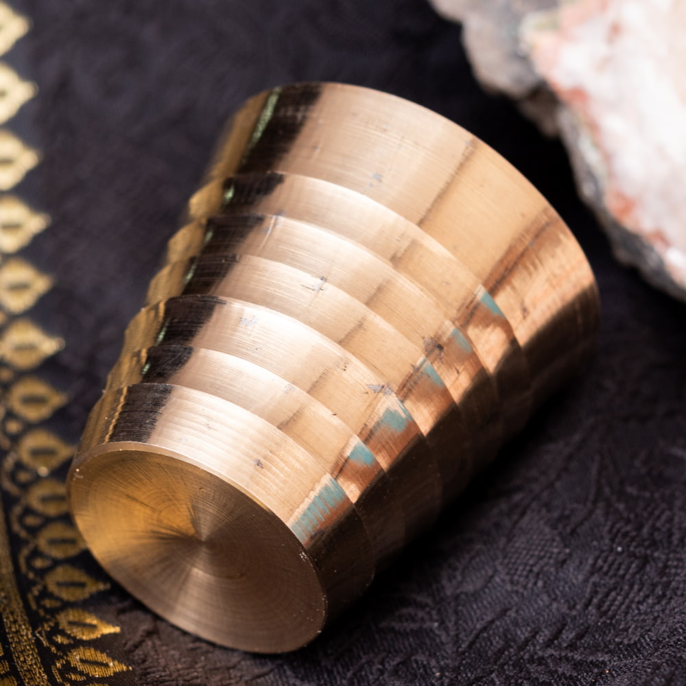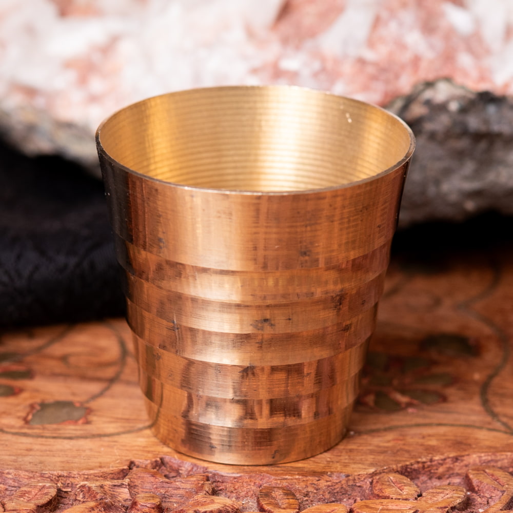 インド現地では礼拝を行う時にガンジス河の水を入れたり、神様への捧げ物の容器として主に使用されるブラスのカップです。古来よりインドではブラスは高級な金属とされ、仏像を作るのに使われたり、宗教用品にはほぼ必ず銅か、ブラスが使われてきました。手のひらに収まる小ぶりな、かわいらしいサイズ感のブラスカップ。模様として入っている横ラインは持つときの滑り止めにもなり、見た目の美しさと実用性を兼ねています。