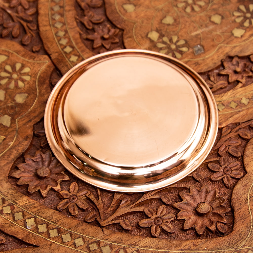 インドでは、ヒンドゥー教の宗教用品として、おかずを盛り付けるために使用されている小皿です。銅はインドでは神聖な金属とされ、宗教的な場所などでよく使われています。ティラキタスタッフもガネーシャの大好物モーダカというお菓子をお供えしていたり、ガンジス河の水をいれていたりする風景を見たことがあります。■お手頃価格な銅仕上げ