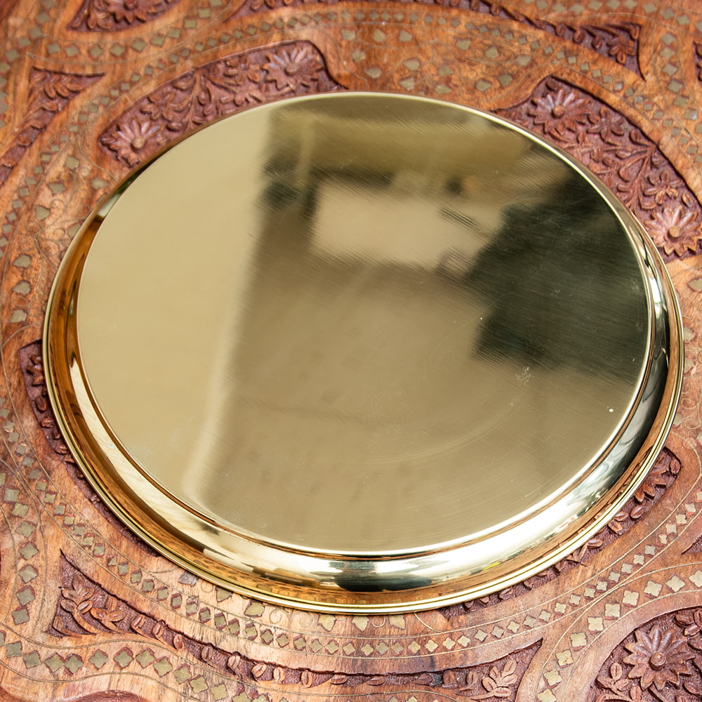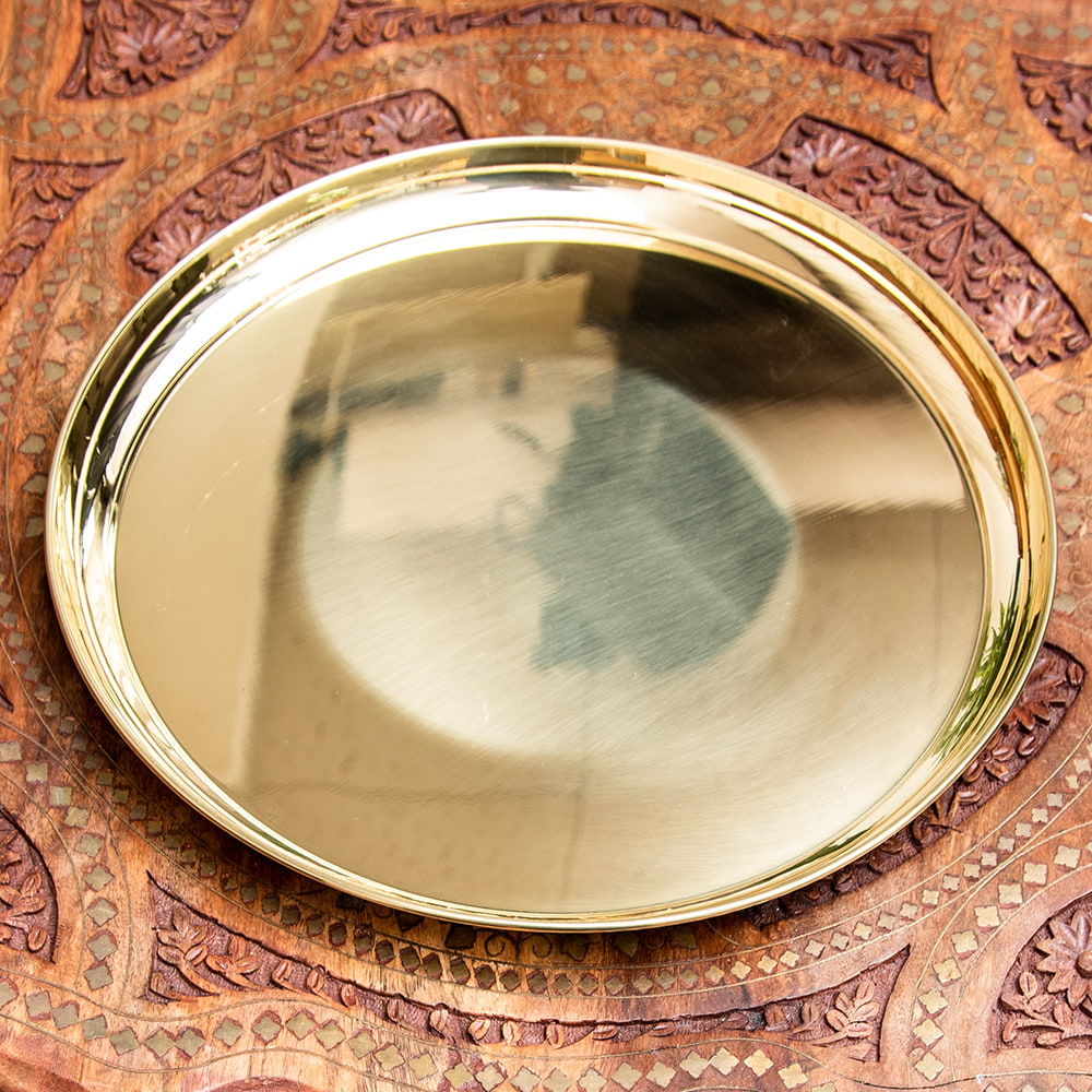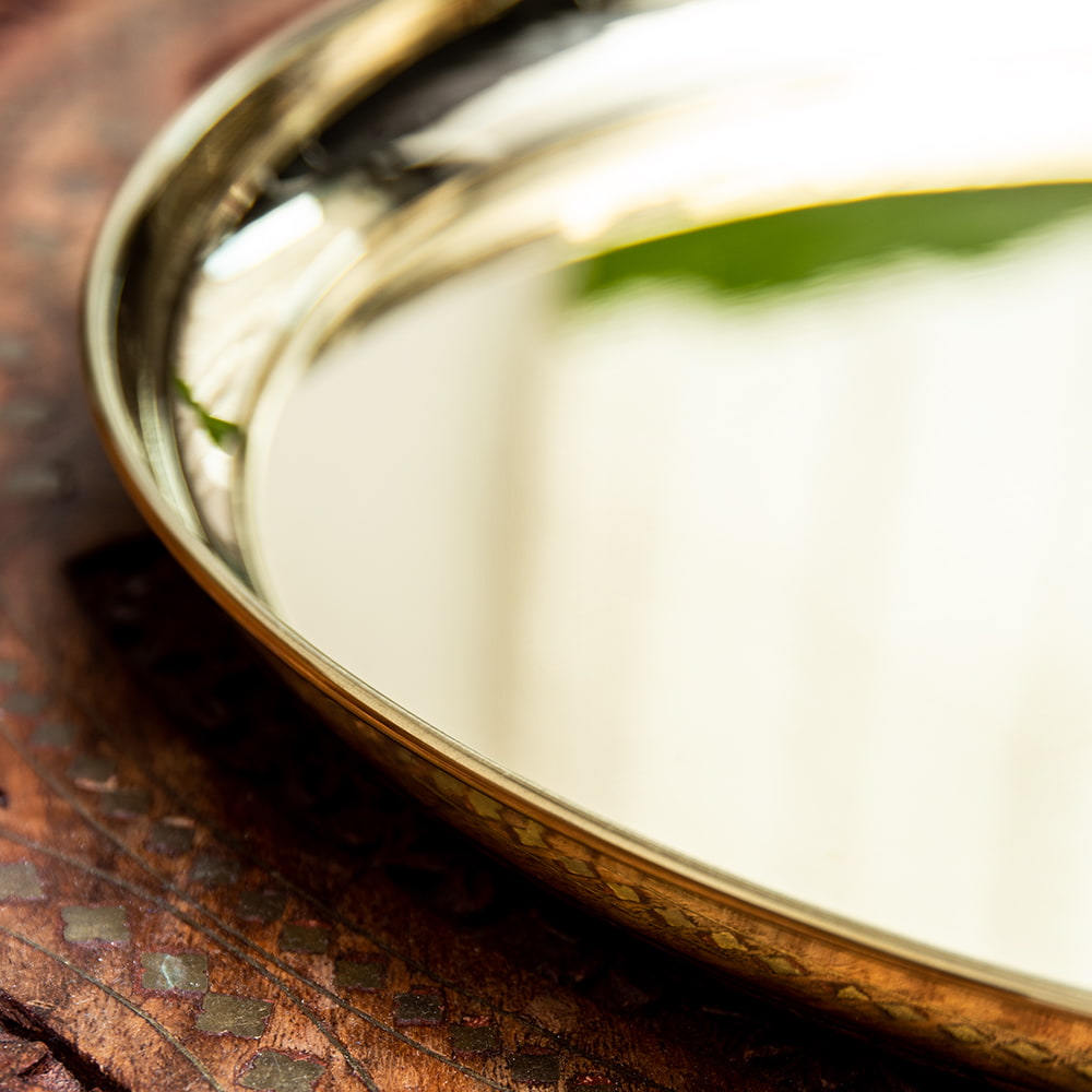 インドでは、ヒンドゥー教の宗教用品として、おかずを盛り付けるために使用されているお皿です。宗教的な場所などでよく使われています。ティラキタスタッフもガネーシャの大好物モーダカというお菓子をお供えしていたり、ガンジス河の水をいれていたりする風景を見たことがあります。■周囲を華やかに