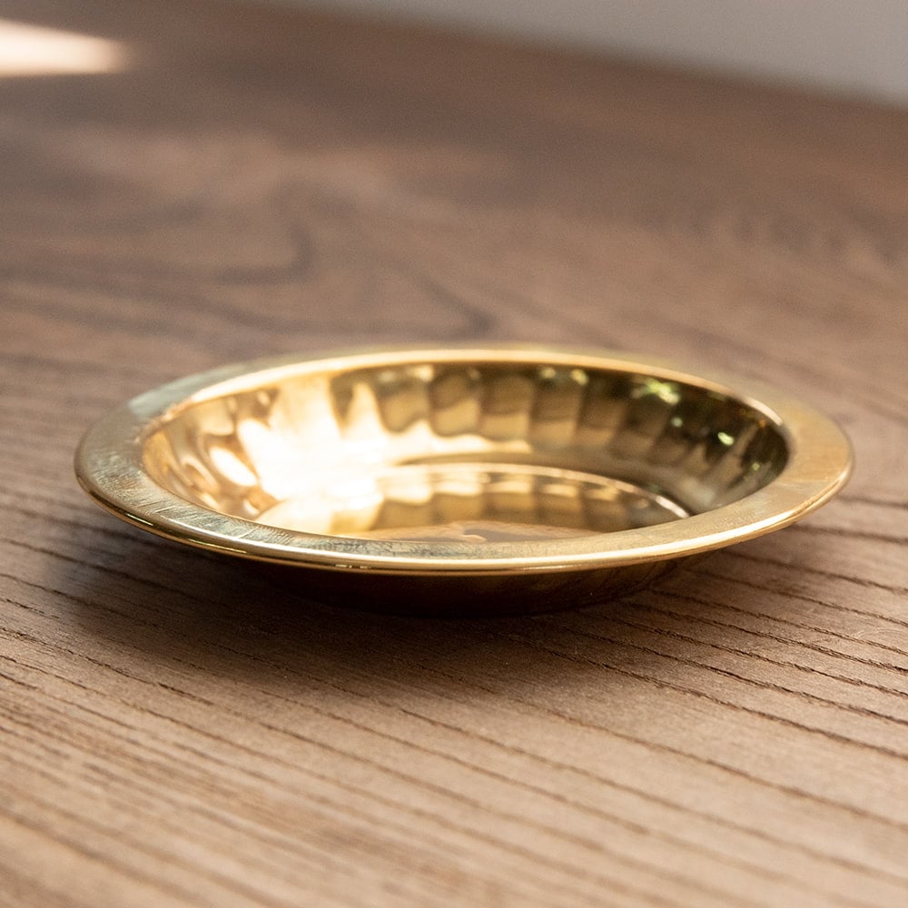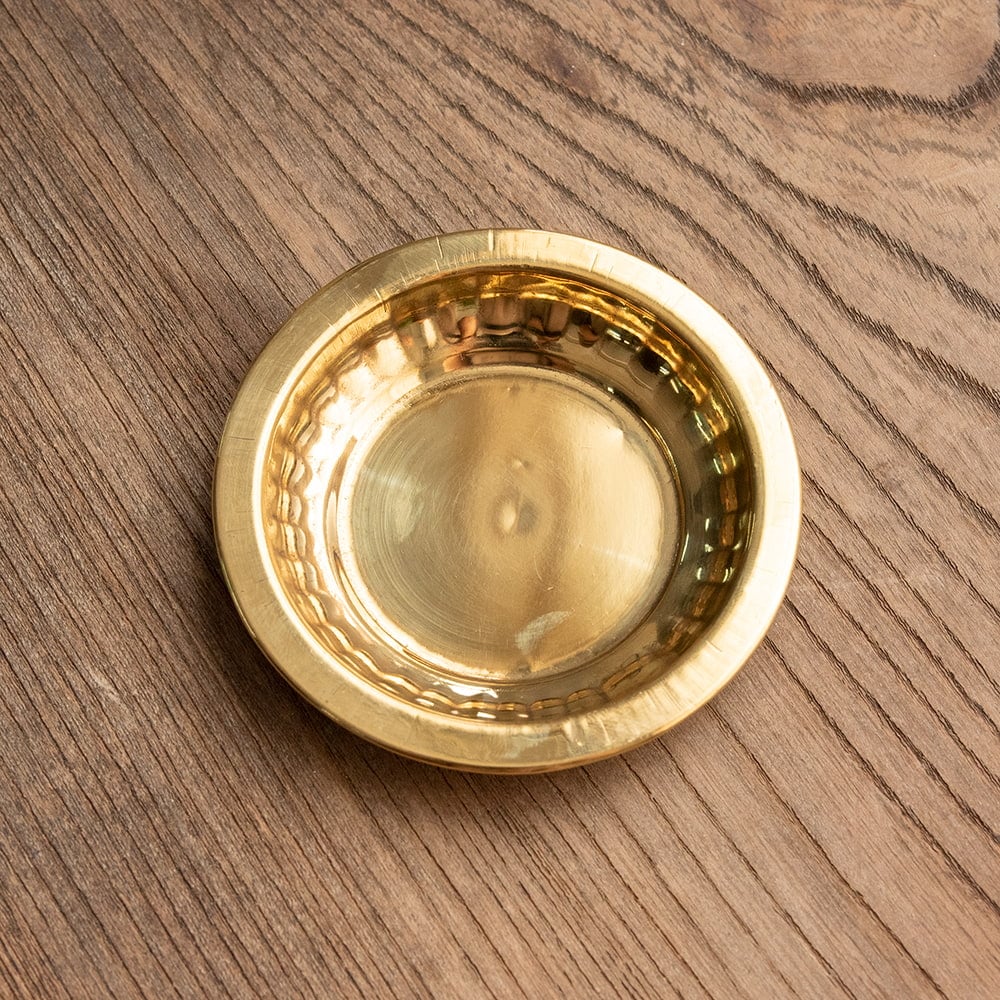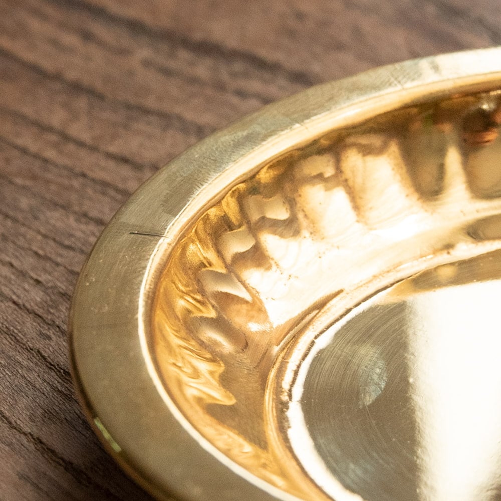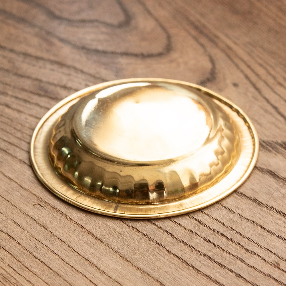 インドでは、ヒンドゥー教の宗教用品として、おかずを盛り付けるために使用されている小皿です。ティラキタスタッフもガネーシャの大好物モーダカというお菓子をお供えしていたり、ガンジス河の水をいれていたりする風景を見たことがあります。祭壇用の装飾器具や身の回りをエスニックに飾るのにお楽しみください。こちらの商品はインド人が大好きステンレスに、ブラス風のメッキを施したものです。ブラスよりも軽くて取り回しやすくなっています。渋みのある輝きをもつブラスカラーの食器はインドで広く普及しており、宗教的な場所などでもよく使われています。
