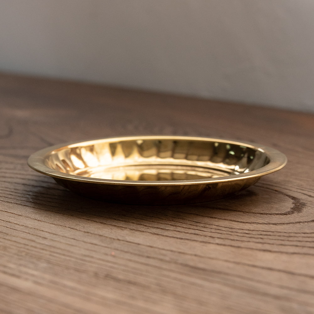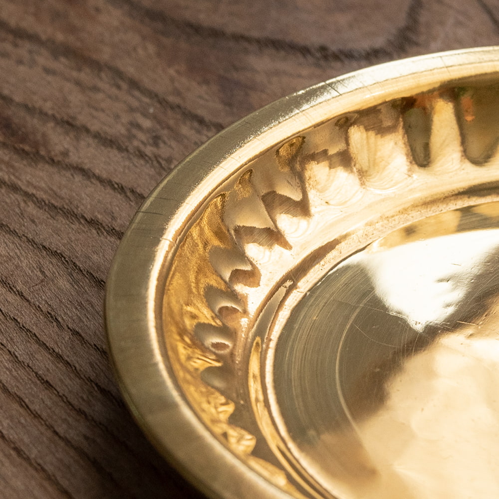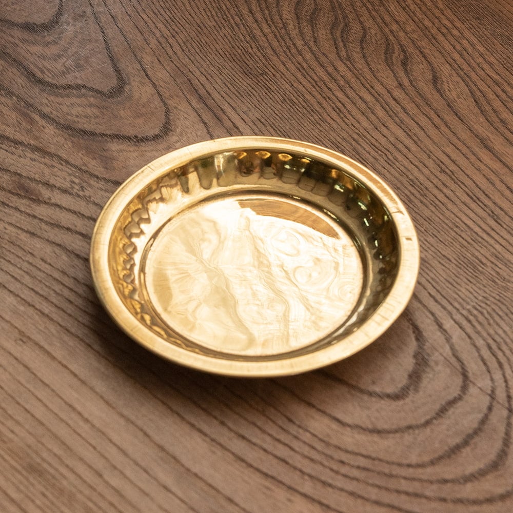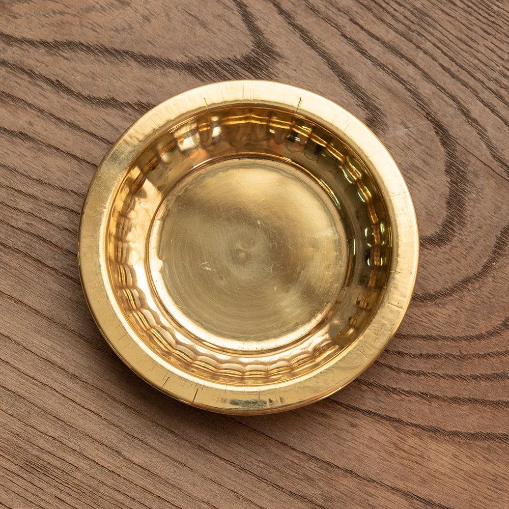 インドでは、ヒンドゥー教の宗教用品として、おかずを盛り付けるために使用されている小皿です。ティラキタスタッフもガネーシャの大好物モーダカというお菓子をお供えしていたり、ガンジス河の水をいれていたりする風景を見たことがあります。祭壇用の装飾器具や身の回りをエスニックに飾るのにお楽しみください。こちらの商品はインド人が大好きステンレスに、ブラス風のメッキを施したものです。ブラスよりも軽くて取り回しやすくなっています。渋みのある輝きをもつブラスカラーの食器はインドで広く普及しており、宗教的な場所などでもよく使われています。