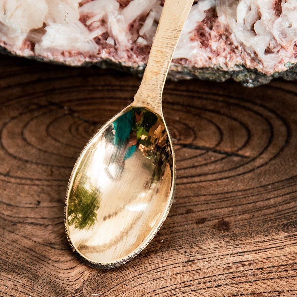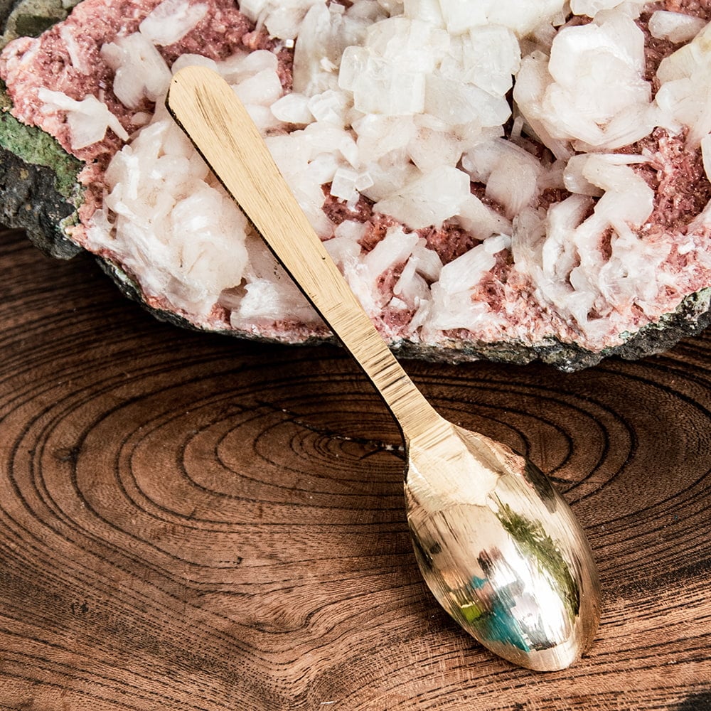 信仰心の篤いインドではどのご家庭にも神像が飾ってあります。ガネーシャやラクシュミといった神様へのお祈りは日々の生活にとって欠くことのできない場面です。こちらのスプーンはそんな神様像へ水やギーを注いでお祈りを捧げる際に用いる礼拝用のスプーンです。■風格のあるブラス製