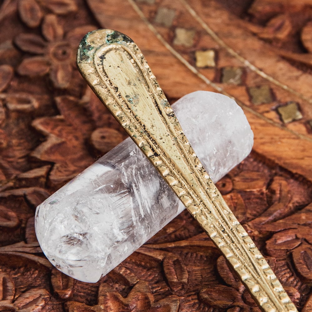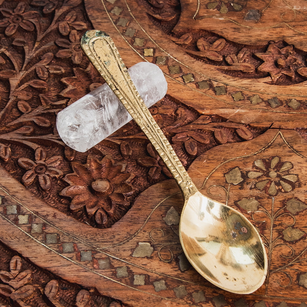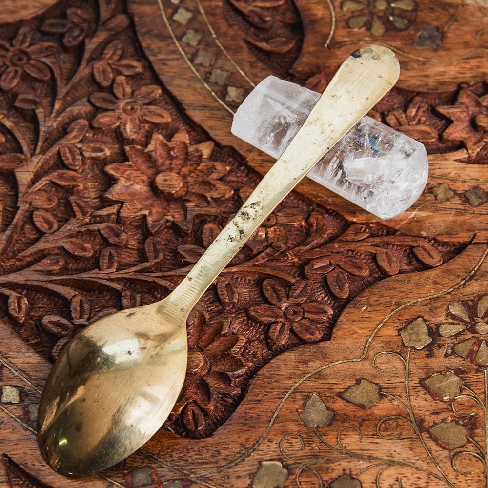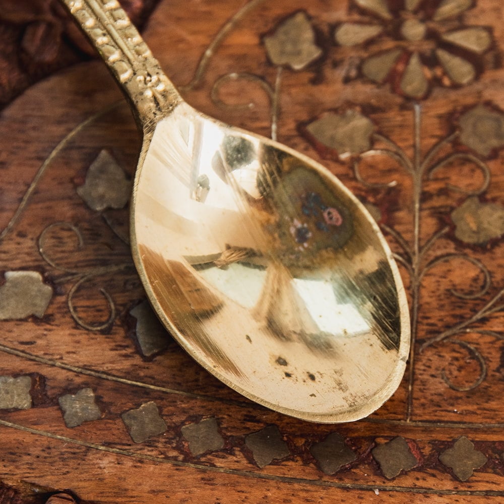 信仰心の篤いインドではどのご家庭にも神像が飾ってあります。ガネーシャやラクシュミといった神様へのお祈りは日々の生活にとって欠くことのできない場面です。こちらのスプーンはそんな神様像へ水やギーを注いでお祈りを捧げる際に用いる礼拝用のスプーンです。■風格のあるブラス製