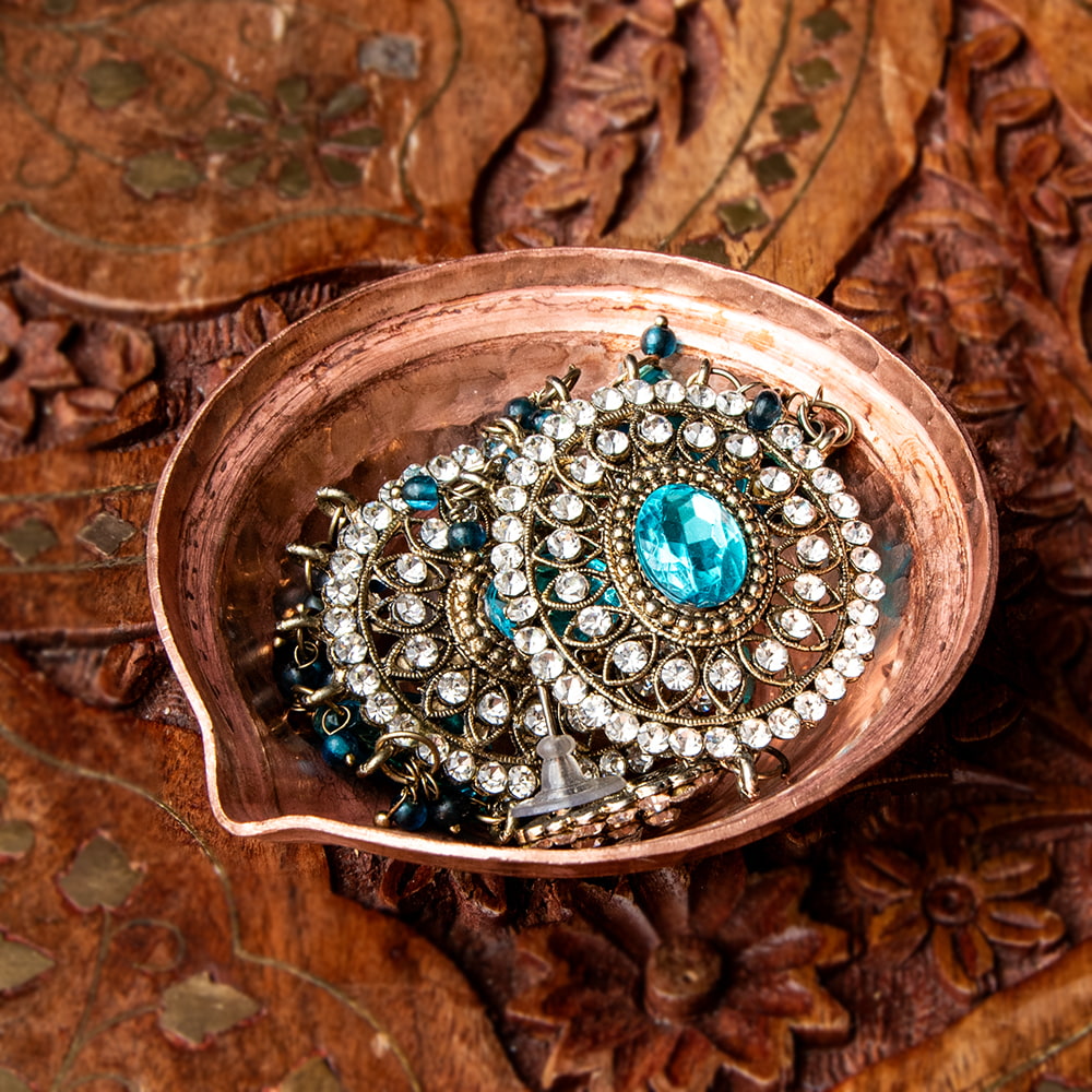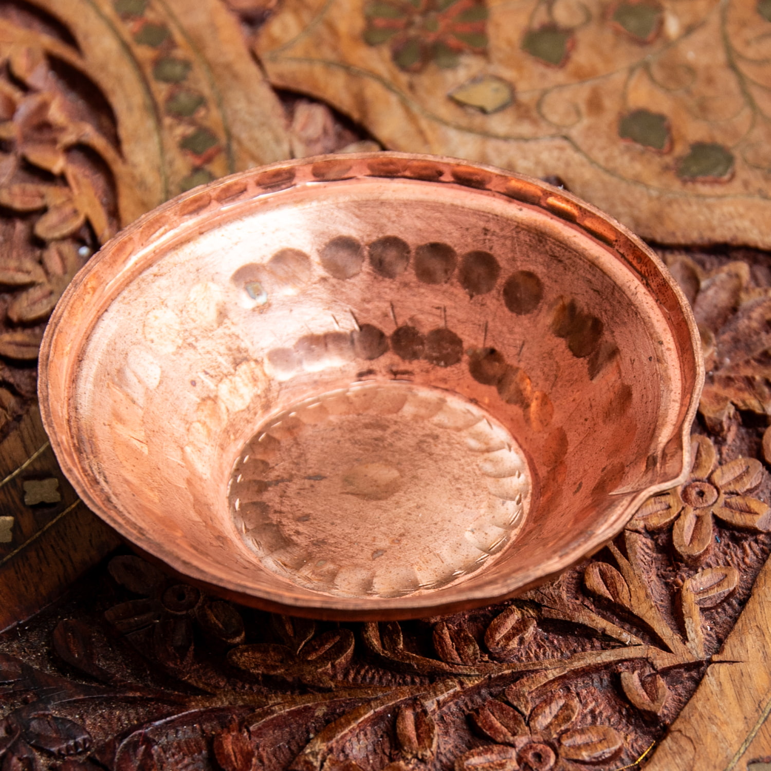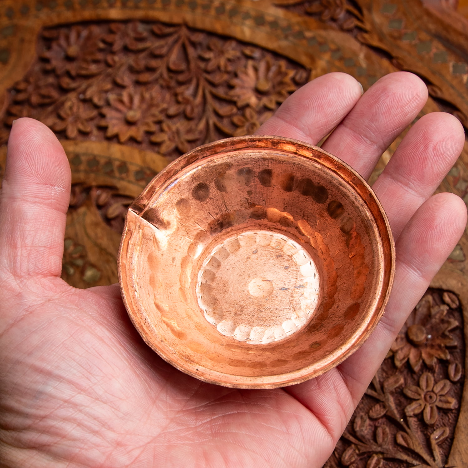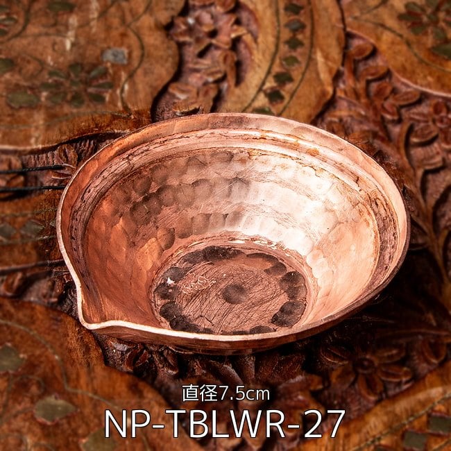 ネパールから届いた銅のボウル。機械で曲げたのではなくハンマーで地道に叩いて作り上げた、手仕事のうかがえる仕上がりです。アーユルヴェーダで清浄なものとして扱われる銅製です。肉厚の銅が贅沢に用いられており、見た目以上にしっかり・ずっしりした一枚になっています。手のひらに載る大きさ、適度な重量感、そして宗教用具の 独特な雰囲気が魅力的な一品です。手にすっぽりと納まるサイズが何ともいえず、愛着がわく一品です。■小物入れやオイルランプとしても