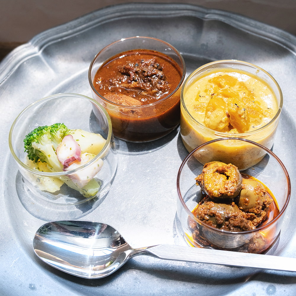小皿はインドのターリーの上に並べるのもおすすめです。透明な小皿なので、明るいステンレスのターリーの輝きを受けて、料理も明るく美味しそうに見えます。