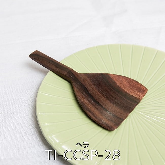 こちらのヘラは手のひらに載るようなミニサイズで、とても薄く作られています。もんじゃ焼きのヘラにそっくりですね。インドネシアや東南アジアでは、小さなフライパンで香味野菜をサッと炒めつける時や、屋台で鉄板焼きのお菓子を作る時などに、こういった形状のヘラが使われるんだそうです。日常で使うなら、焼き菓子やケーキを切り分ける時や、小さな前菜をのせる、ミニプレートとしても。実用性と、絵になる素敵な雰囲気とが共存する、小さな台所道具です。