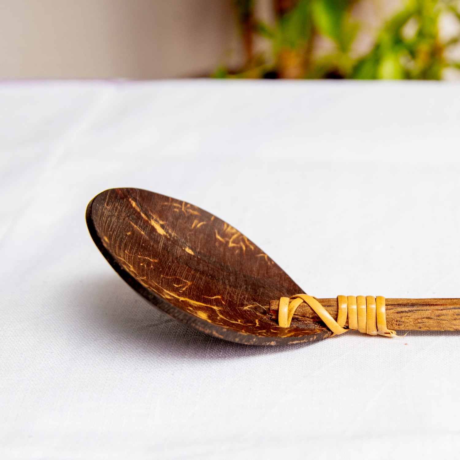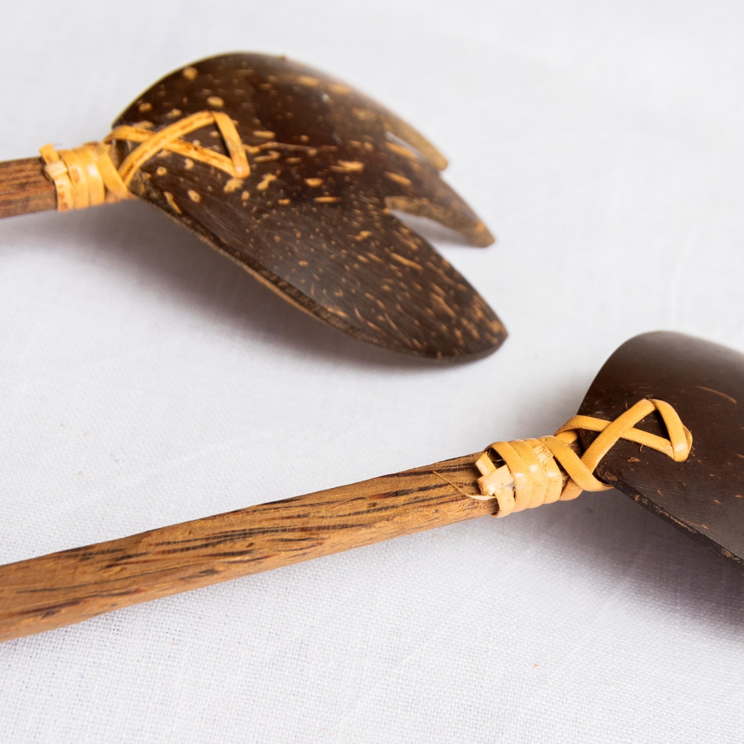 こちらのカトラリーは、持ち手は丈夫な木材を、スプーン・フォークの各部分は風合いが素敵なココナッツの殻(ココナッツ・シェル)を使用して作られています。持ち手と先端部分の接合部分も、自然素材のツルを使っているナチュラルさ。がっちりと結わえられていて、頑丈に作られているのが分かりますね。
