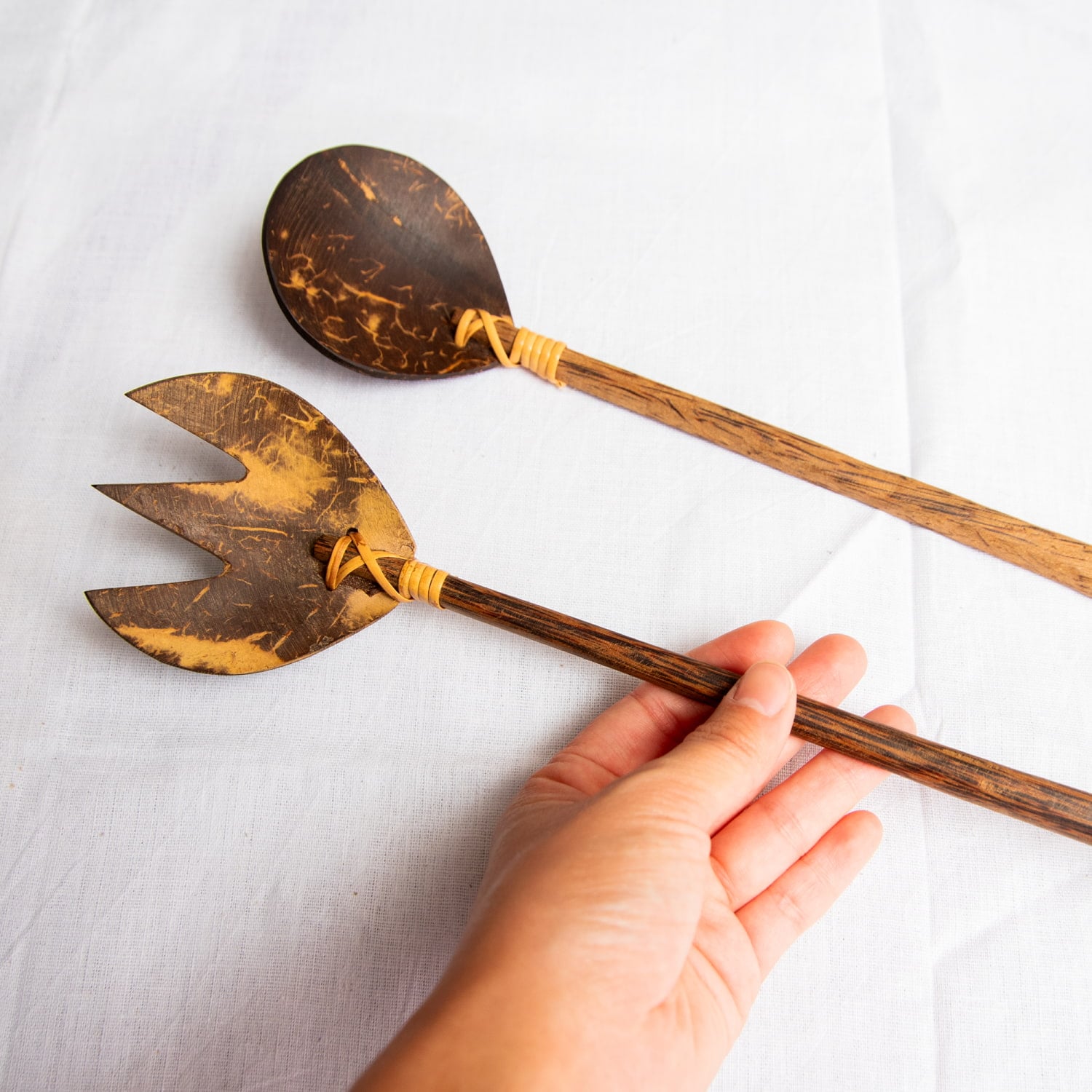 自然豊かなバリの風土から、ココナッツ材を使用した大きなスプーンとフォークのセットがやってきました。サラダなどの大皿料理を取り分けるのにとっても便利なカトラリーセット。日常の一コマを素敵に彩ってくれます。