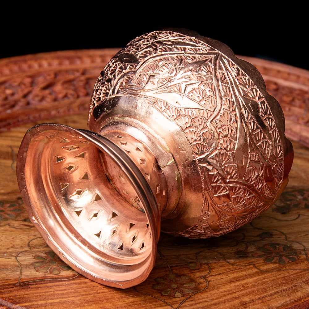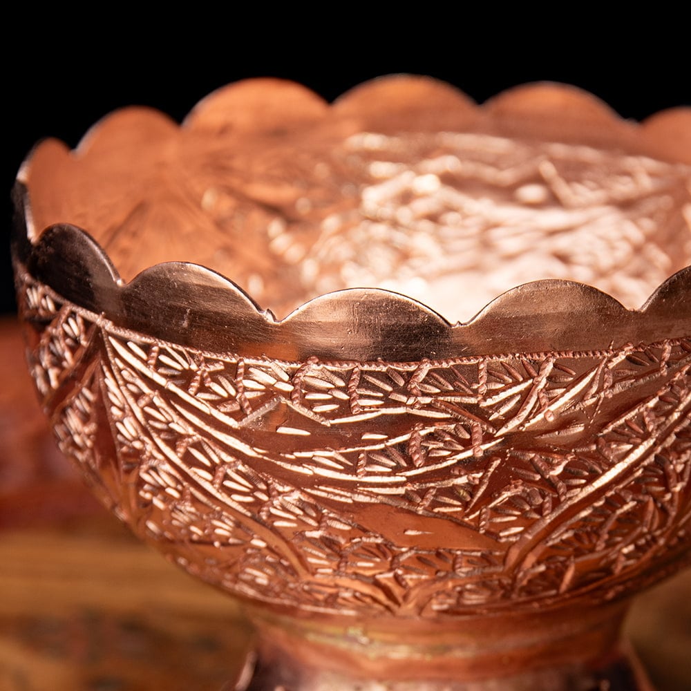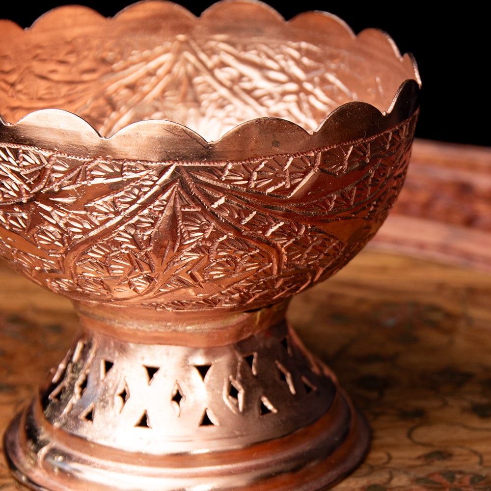インド極北の地・カシミールから手彫りのキッチンウェアが届きました。肉厚な金属が用いられ、見た目以上にどっしりとした存在感がある一品です。偶像崇拝を禁止しているイスラーム文化には、自然や幾何学模様の中に美を見出し、モスクなどを装飾してきた伝統があります。こちらのカップもそんな歴史を感じさせる、確かな手仕事の息づく仕上がりになっています。お値段は決して安くはありませんが、一生物のテーブルウェアとしてぜひお手元にどうぞ。