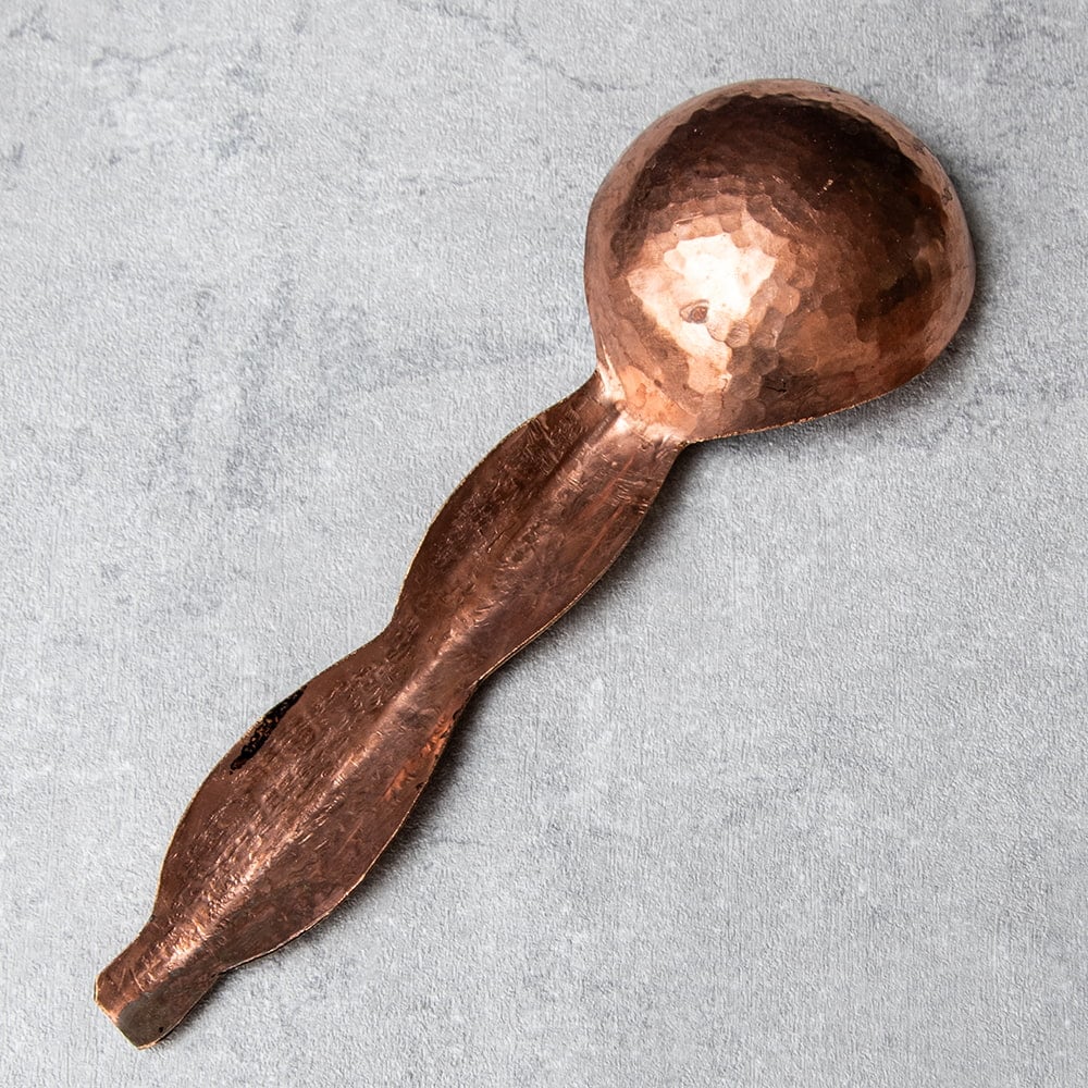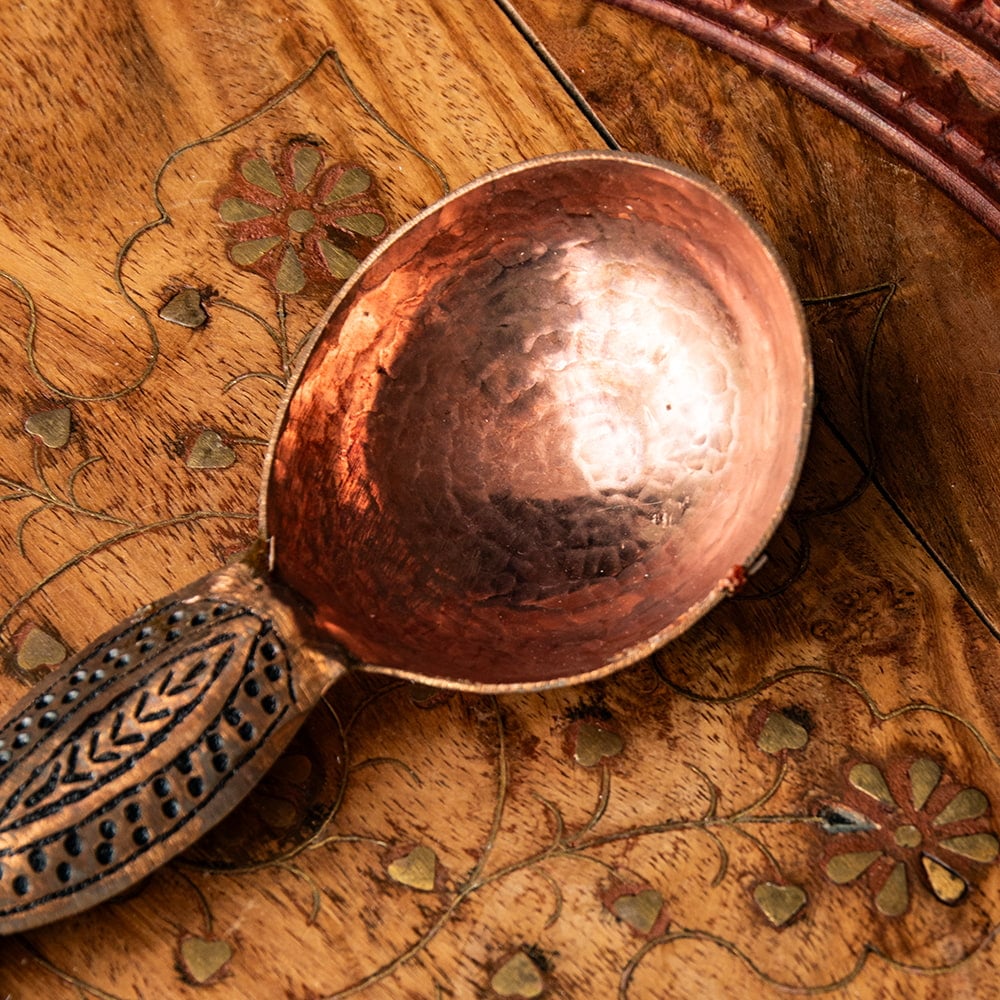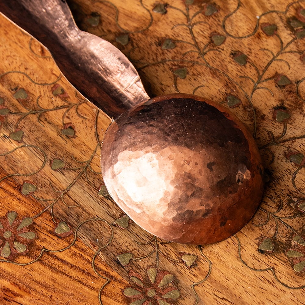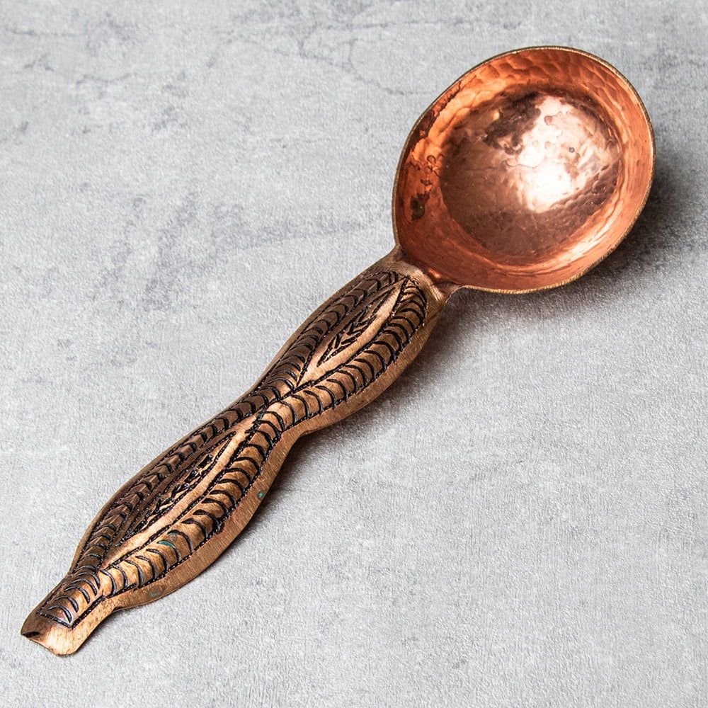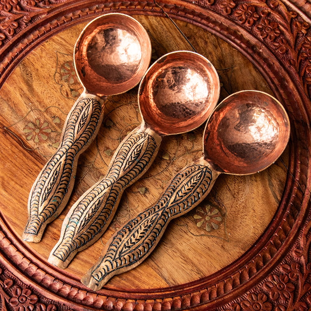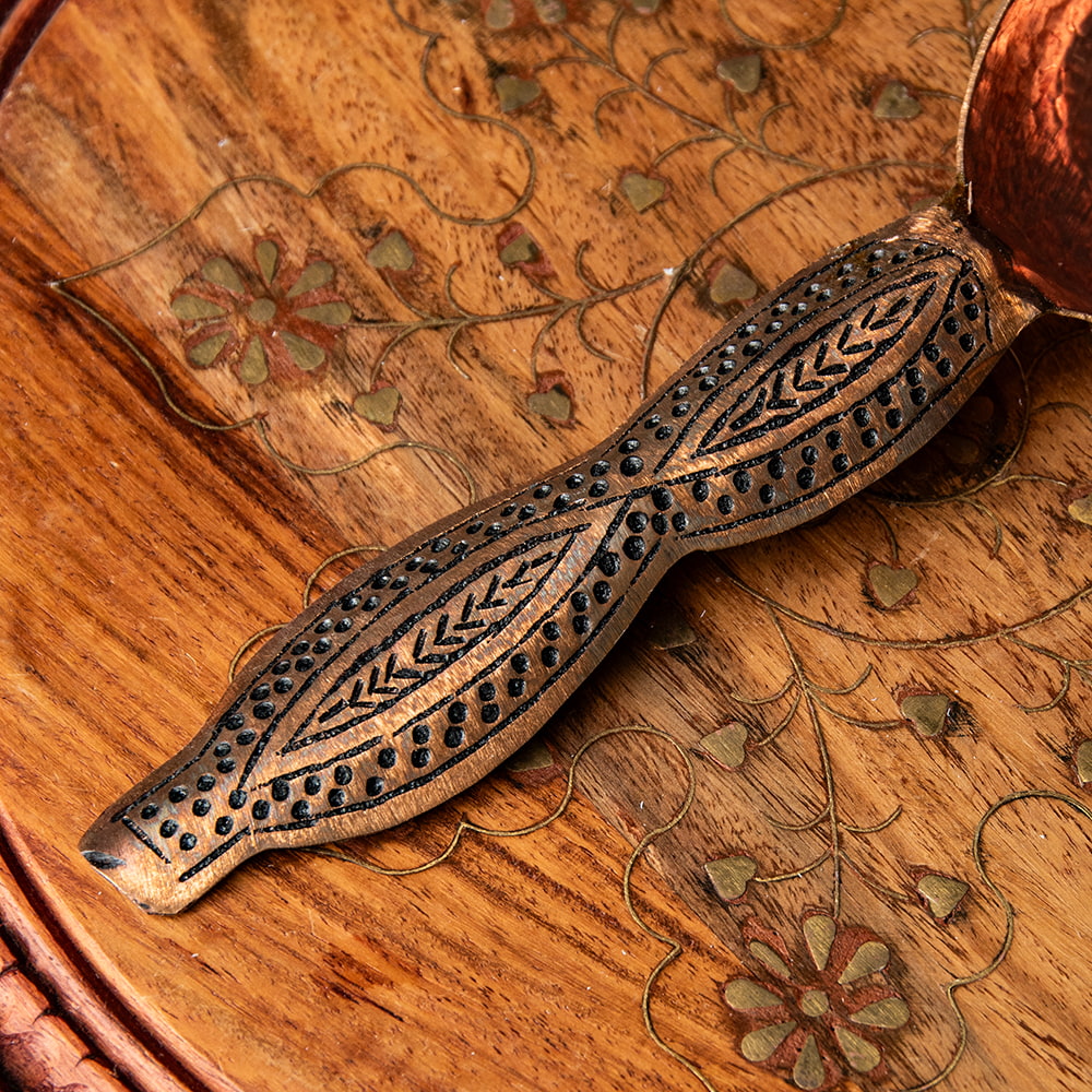 インド極北の地・カシミールから手彫りのキッチンウェアが届きました。肉厚な金属が用いられ、見た目以上にどっしりとした存在感がある一品です。偶像崇拝を禁止しているイスラーム文化には、自然や幾何学模様の中に美を見出し、モスクなどを装飾してきた伝統があります。こちらのスプーンもそんな歴史を感じさせる、確かな手仕事の息づく仕上がりになっています。お値段は決して安くはありませんが、一生物のテーブルウェアとしてぜひお手元にどうぞ。