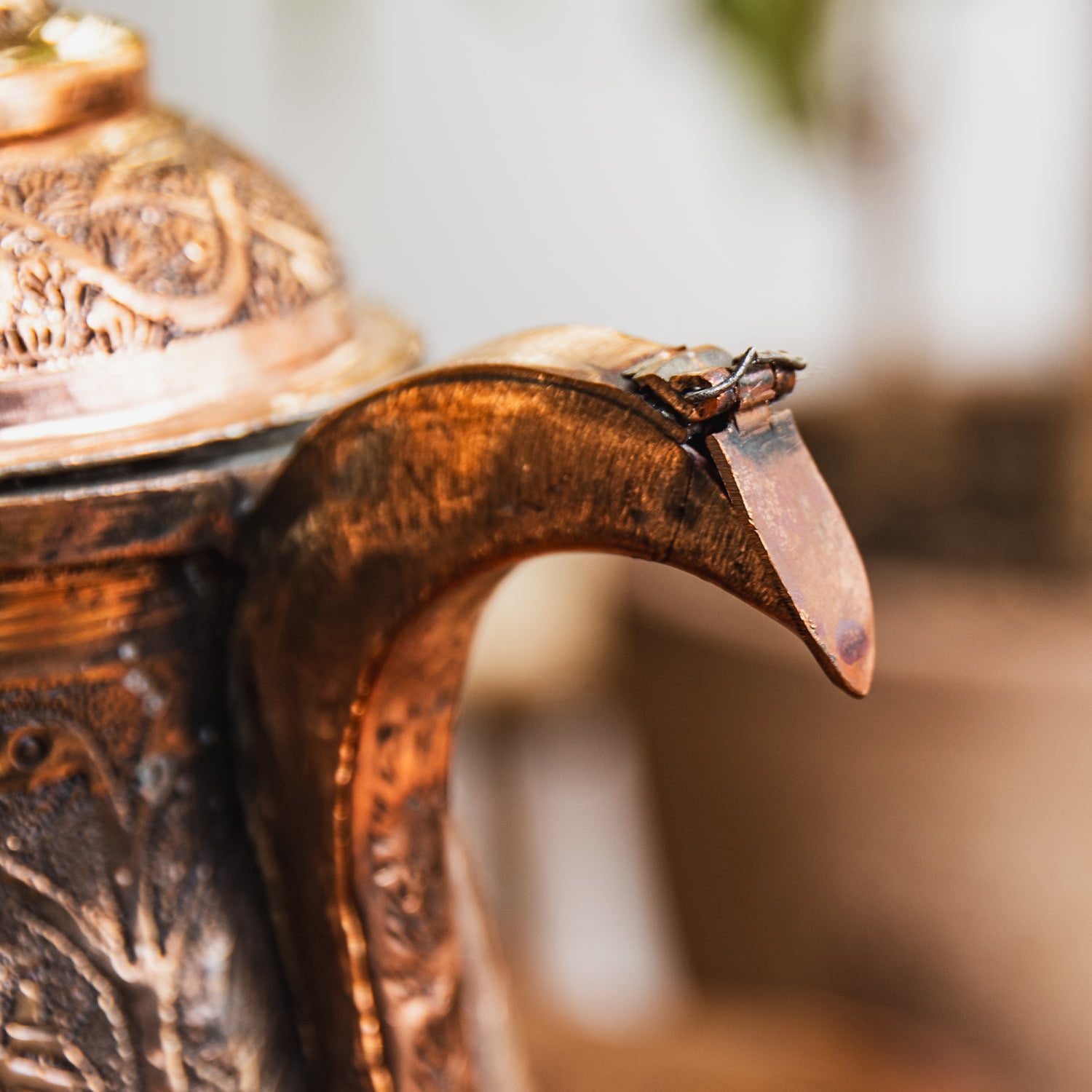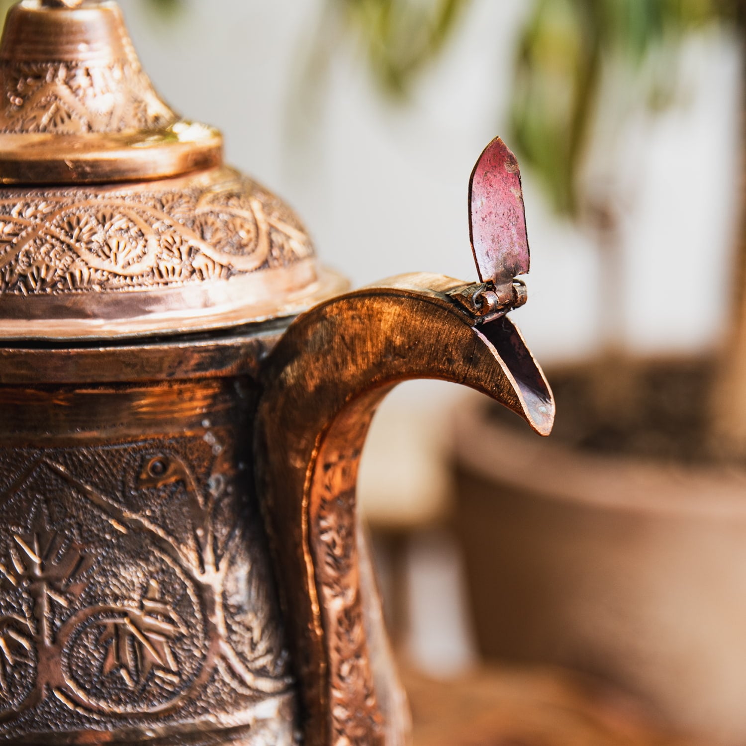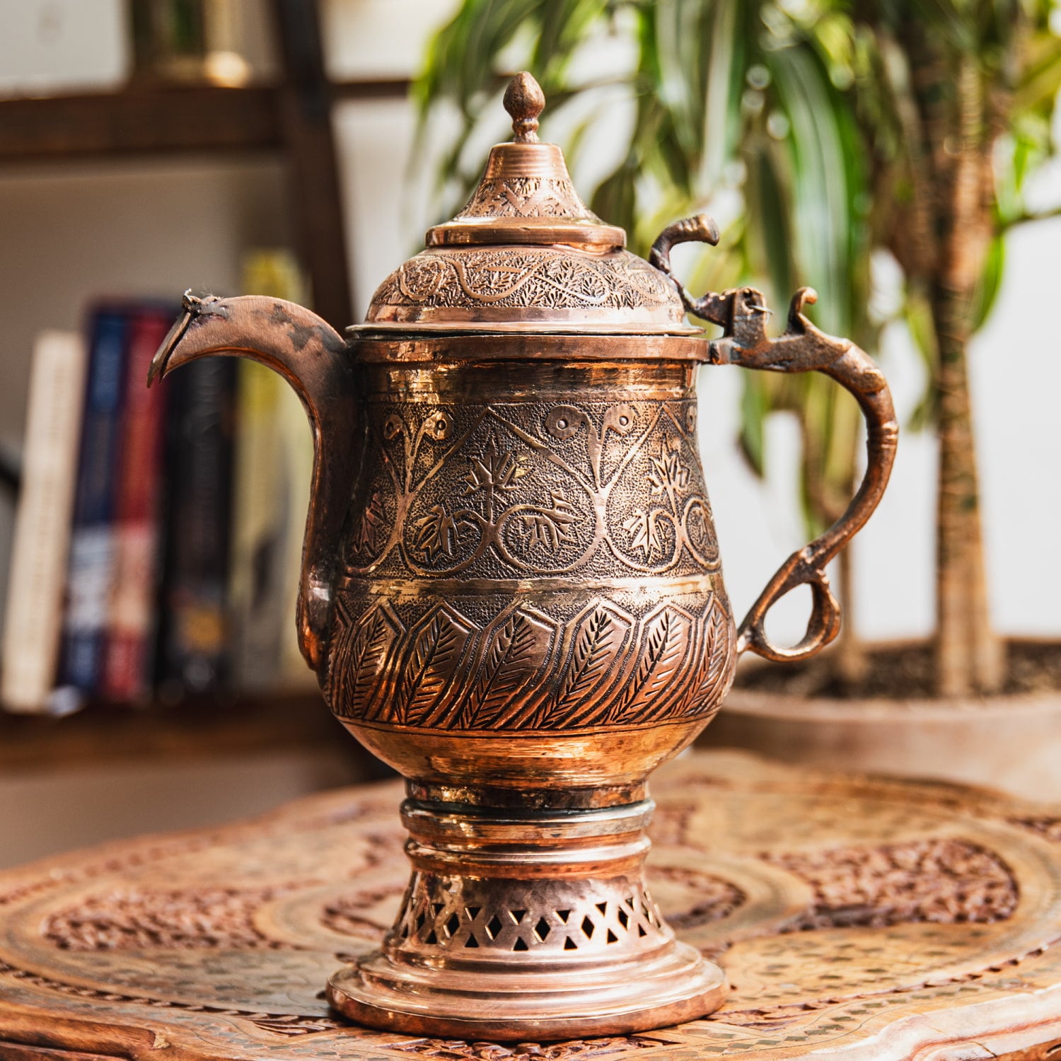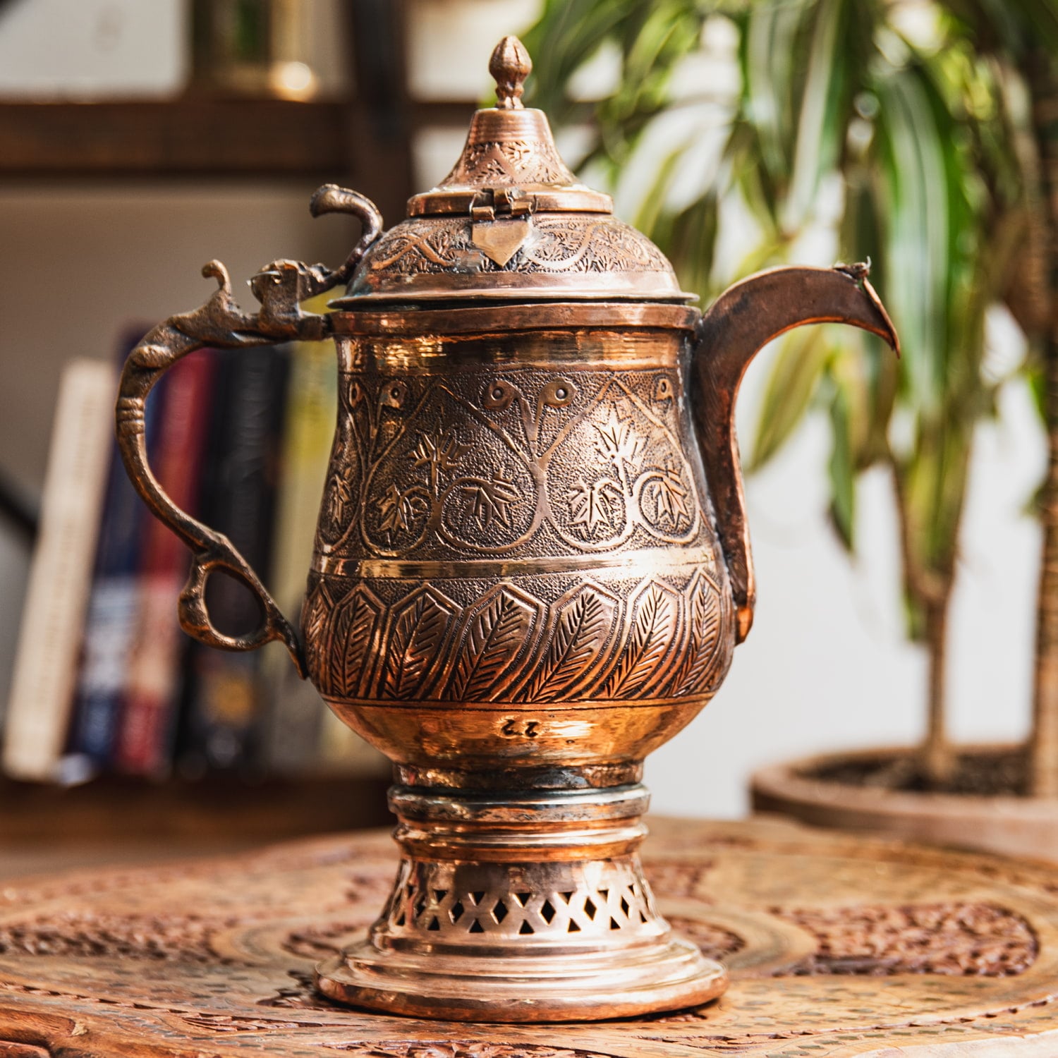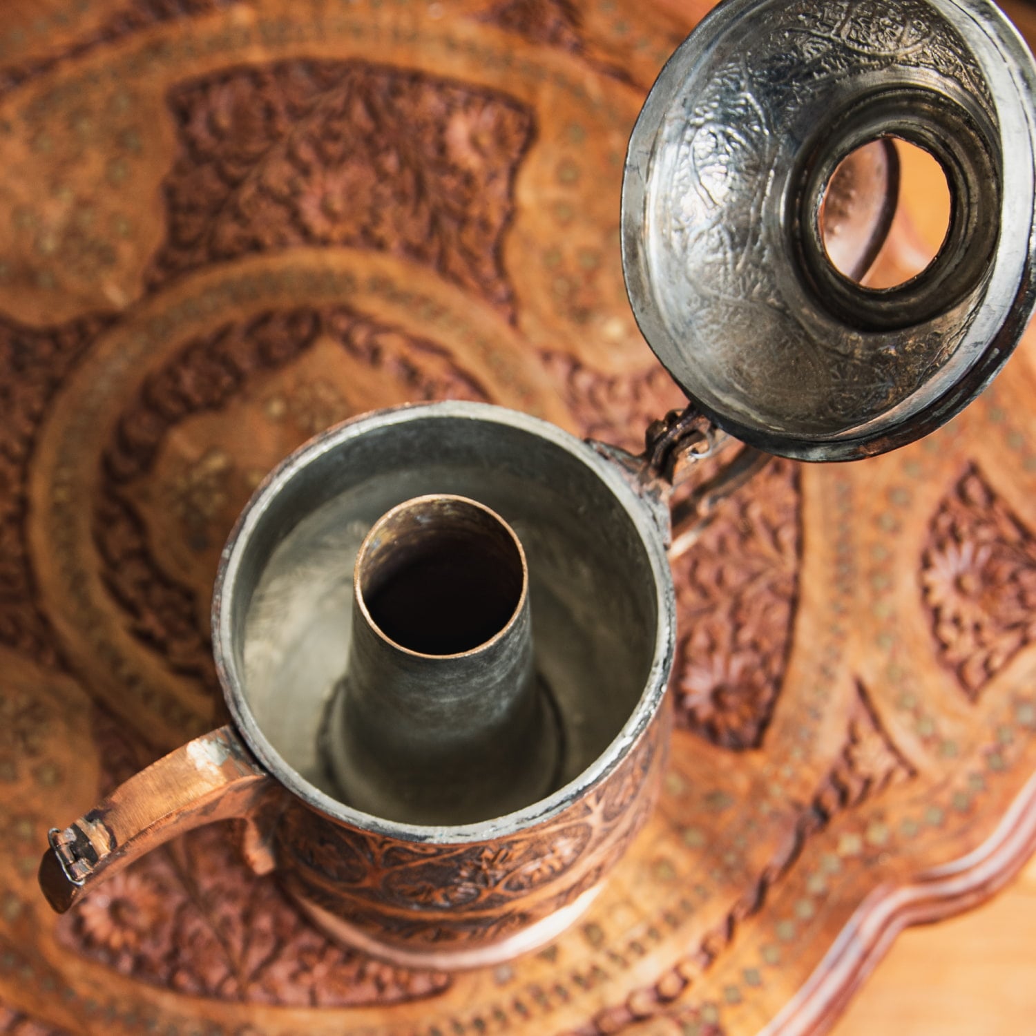 インド全土で広く飲まれている「チャイ」とは異なる、無発酵のサフラン緑茶「カワ」を楽しむのがカシミールの過ごし方。こちらのサモワールはそんなカシミールならではの茶道具で、ポットの中央に炭を入れてお茶を沸かし続けてそれをゆったり飲むのです。サモワールはロシアなど広範な地域で見られるものですが、各地でそれぞれの文化を反映した作りになっており、カシミールのサモワールはイスラム文化を感じさせるデザインになっています。蝶番パーツは釘を折り曲げて留めてあるなどかなりワイルドな作り。現地感たっぷりです。お値段は決して安くはありませんが、一生物のテーブルウェアとしてぜひお手元にどうぞ。