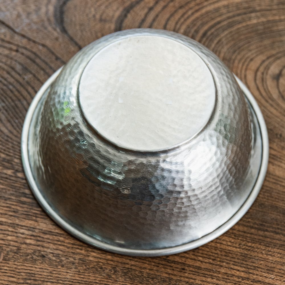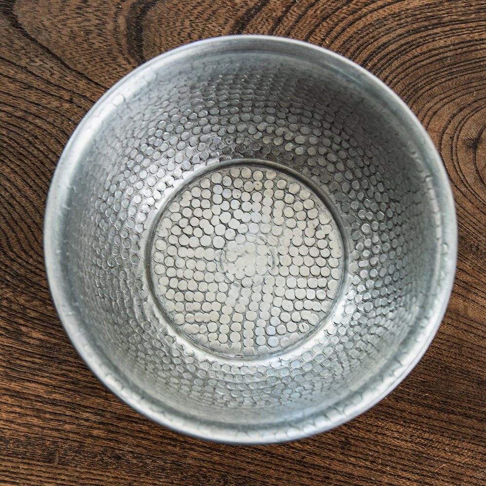 デリーから6時間ほど離れたところにあるイスラム街モラダバードから、手仕事の光る上品なアルミ製のミニボウルが届きました。アンティーク感のあるボウルは鈍く光る金属の質感と相まってテーブルまわりを美しく飾ってくれます。職人による手仕事のため、一つ一つが微妙に異なった仕上がりになっています。ハンドメイドならではのデザインのゆらぎが生き生きとした質感を感じさせます。使い込むにつれて風合いが増していきますので、長く楽しむのにおすすめの一品です。
