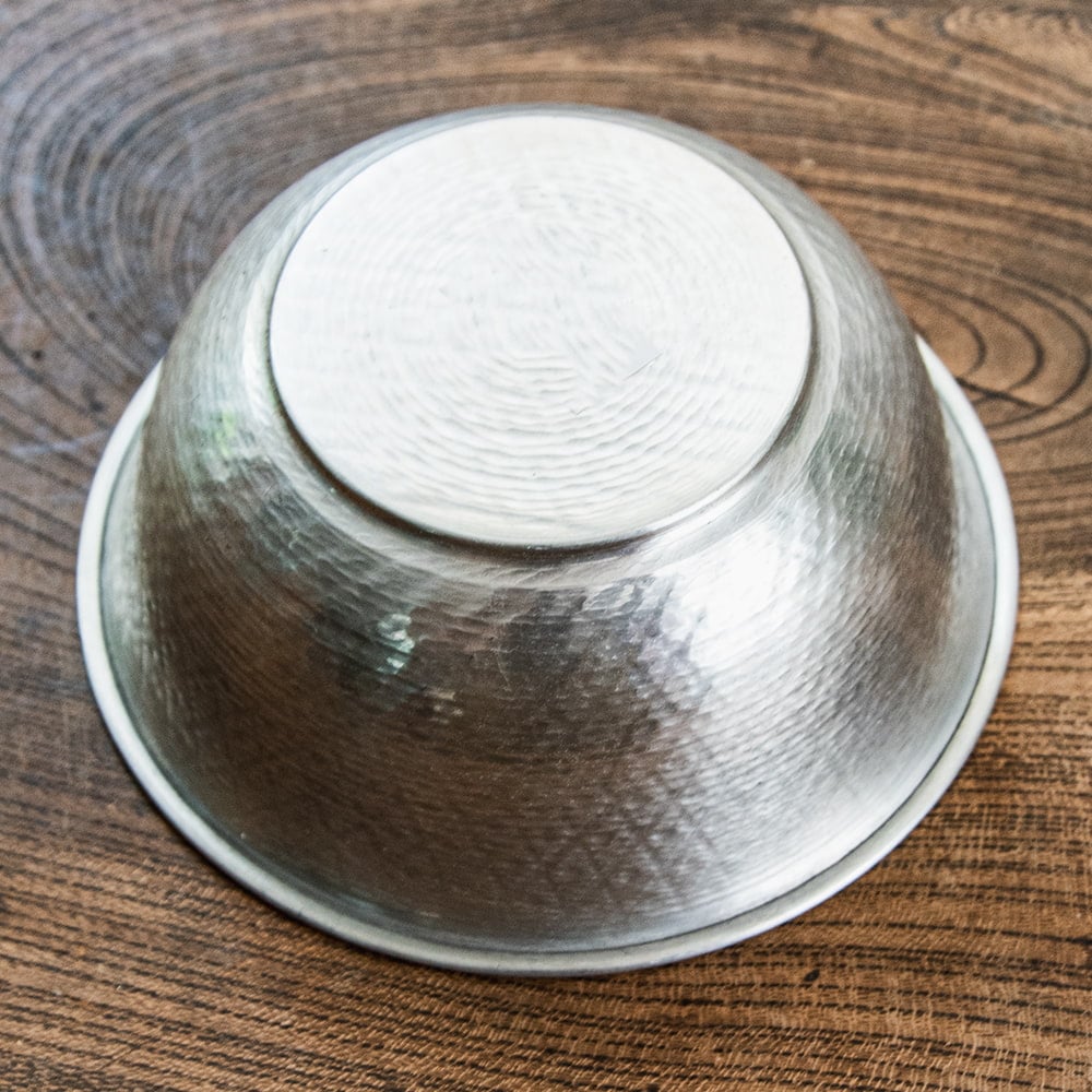 デリーから6時間ほど離れたところにあるイスラム街モラダバードから、手仕事の光る上品なアルミ製のミニボウルが届きました。アンティーク感のあるボウルは鈍く光る金属の質感と相まってテーブルまわりを美しく飾ってくれます。職人による手仕事のため、一つ一つが微妙に異なった仕上がりになっています。ハンドメイドならではのデザインのゆらぎが生き生きとした質感を感じさせます。使い込むにつれて風合いが増していきますので、長く楽しむのにおすすめの一品です。