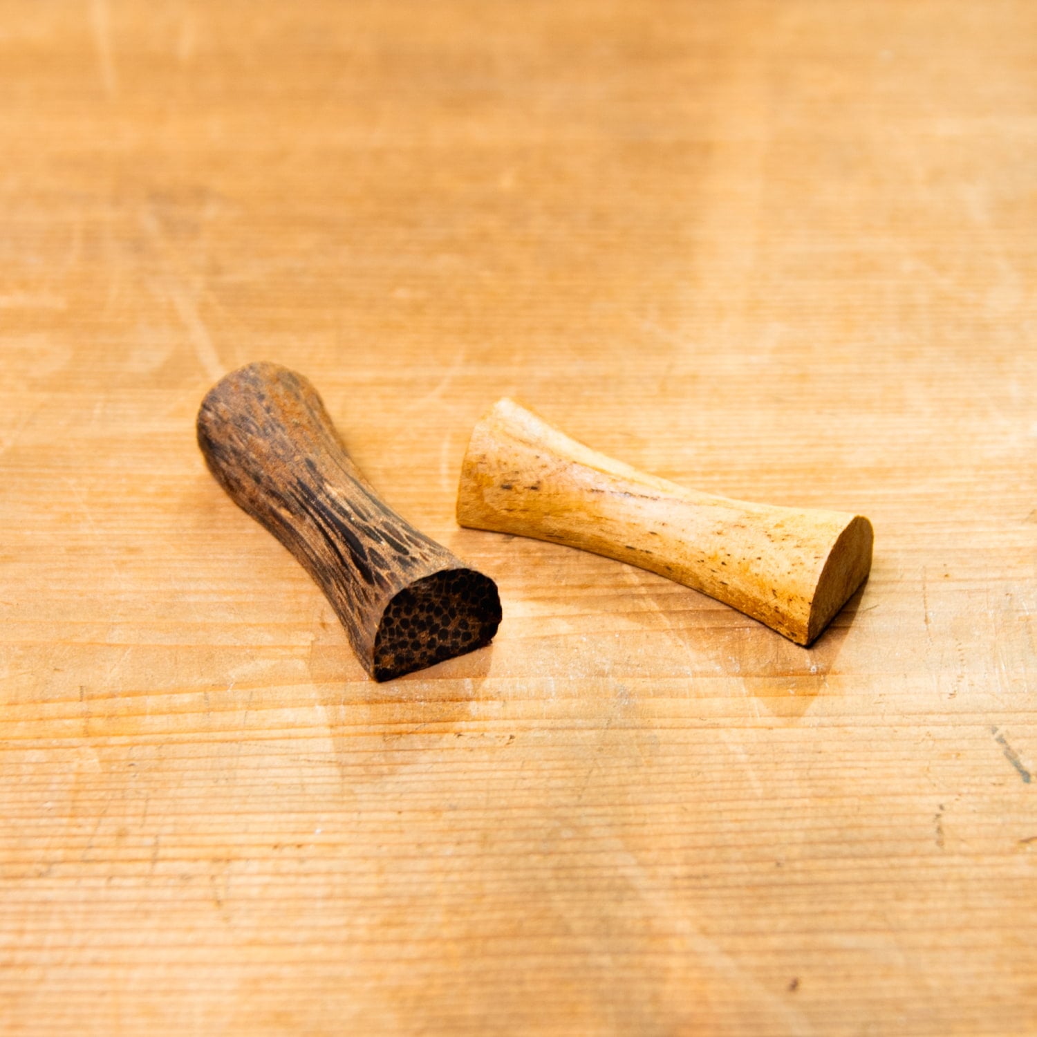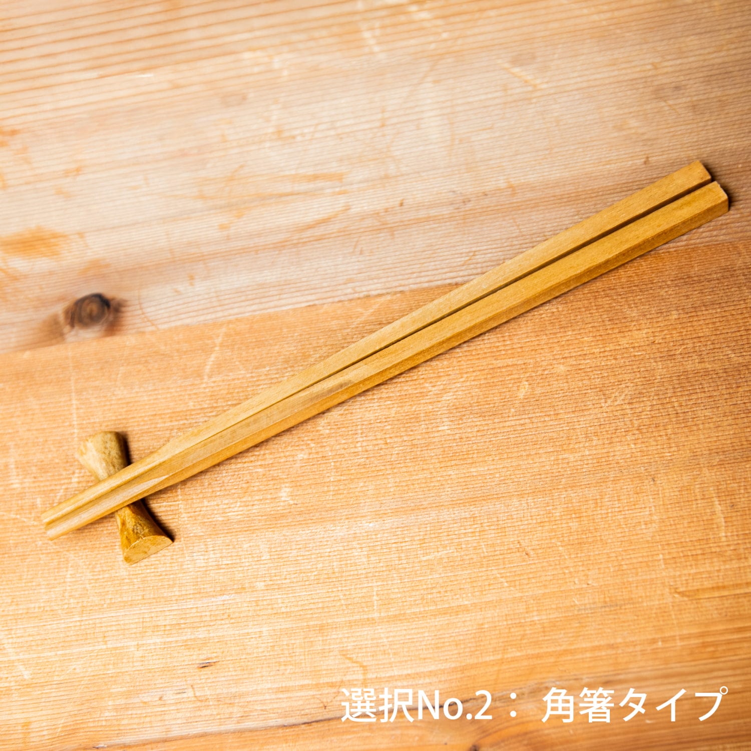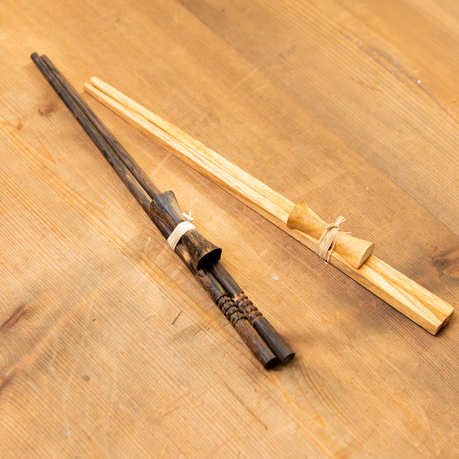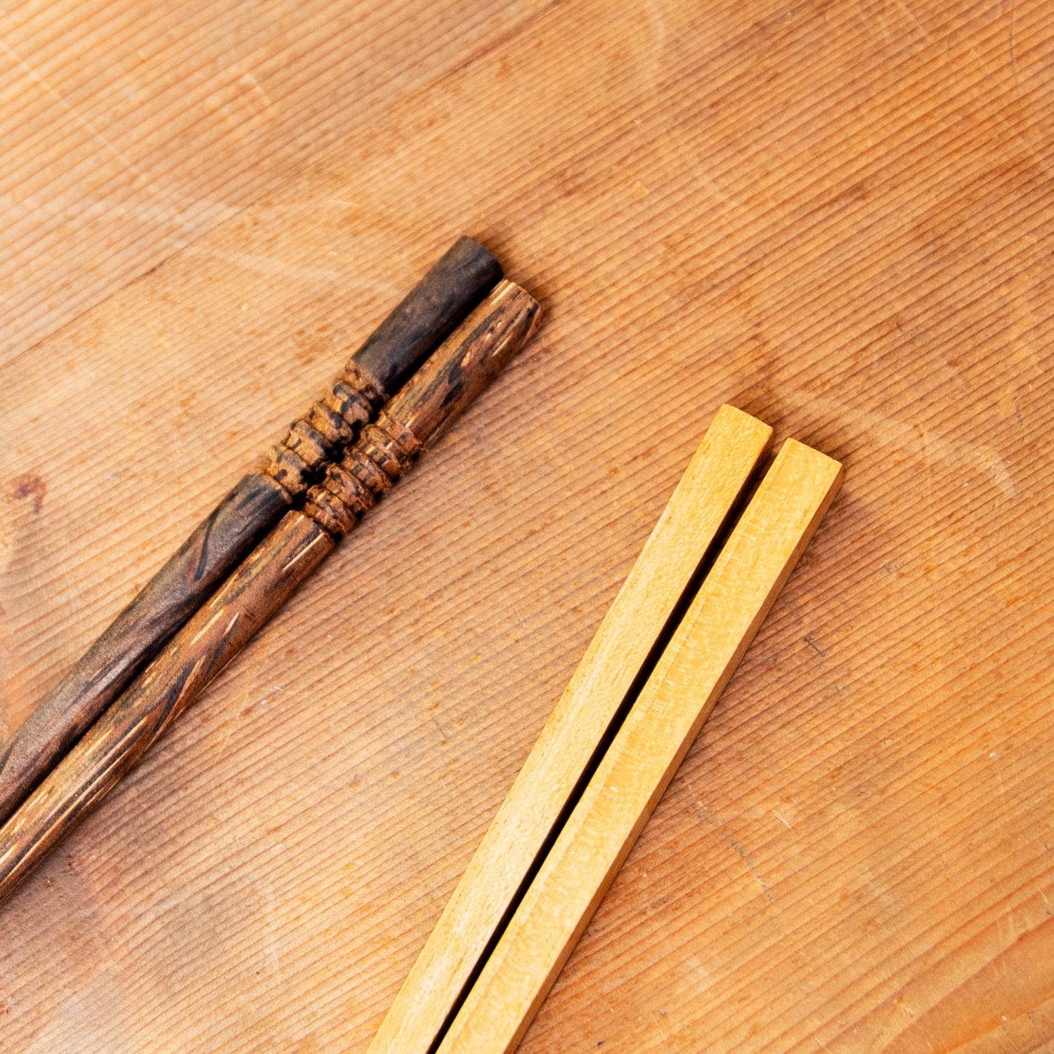 こちらのお箸は2種類のデザインからお選びいただけます。丸箸タイプはダークな色調の木を使用し、持ち手側にはリング模様の彫刻が施されています。角箸タイプは明るめの色合いで、ちょっと無骨な形ながらも箸先は使いやすいラウンド型に削られています。手の大きな男性にもおすすめです。
