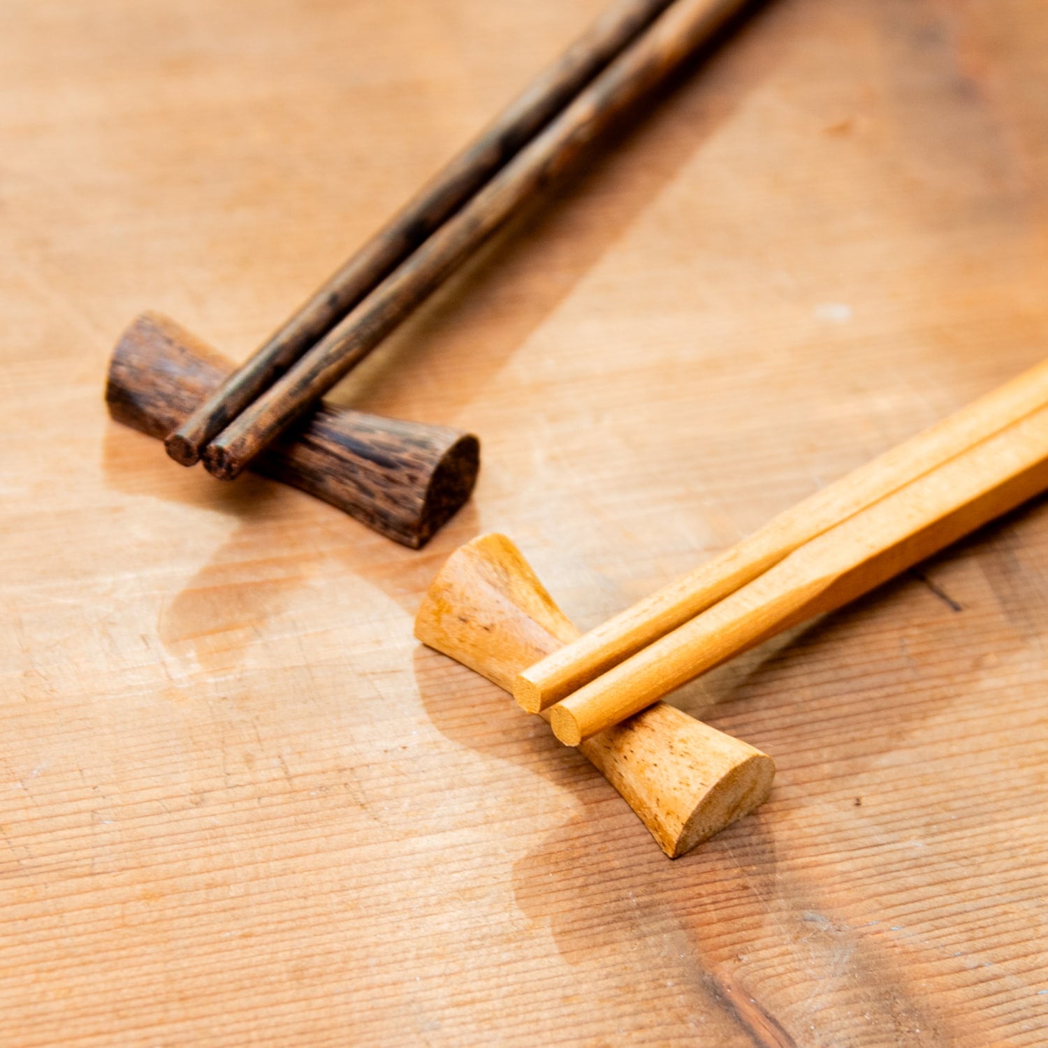 こちらのお箸は共木で作られた箸置きがセットになっています。箸が転がりにくいようにカーブを描いた枕型の箸置きは、デザイン性でも実用面でもすぐれものですね。箸置きと箸本体が結わえられた状態でお届けします。来客用セットや引っ越し祝いなどのギフトとしても、もちろんご家族分をお揃いで揃えていただくにもぴったりです。