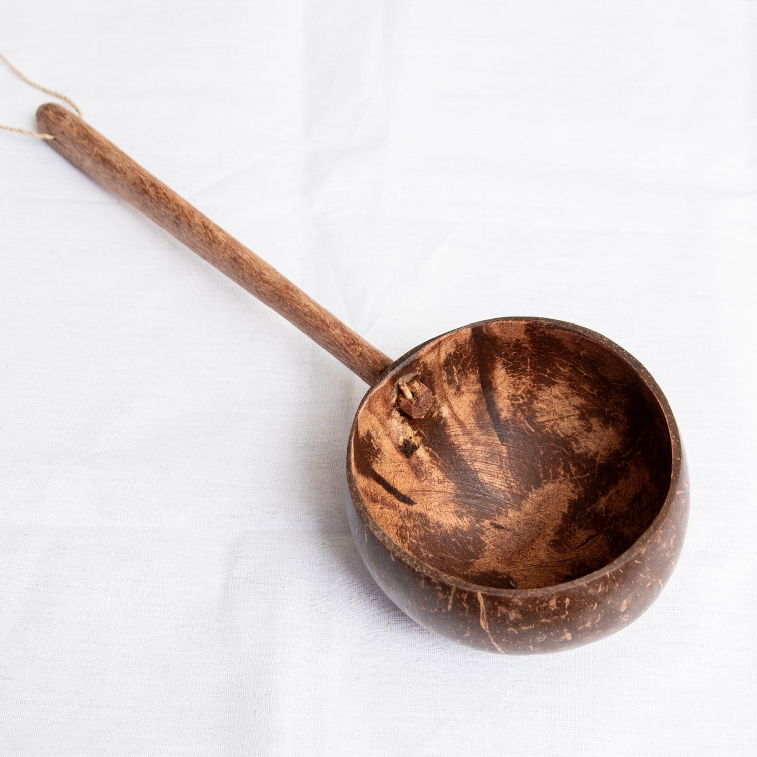 水漏れしにくく堅いことで知られるココナッツの殻を、半分に切ってお玉の形に仕上げています。贅沢かつシンプルな作りのツールといえます。お椀たっぷりのスープやシチューなども、ひと掬いでよそうことができます。パーティーなどで飲み物を振る舞うときに使っても、雰囲気が出ますね。