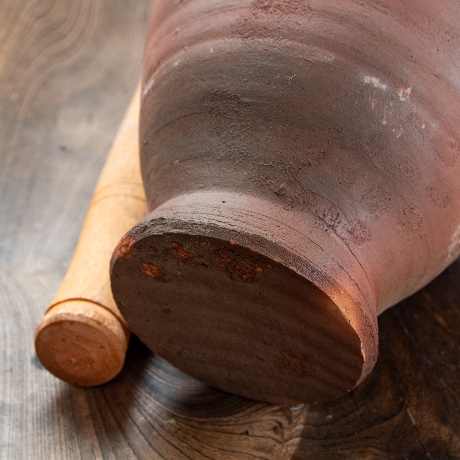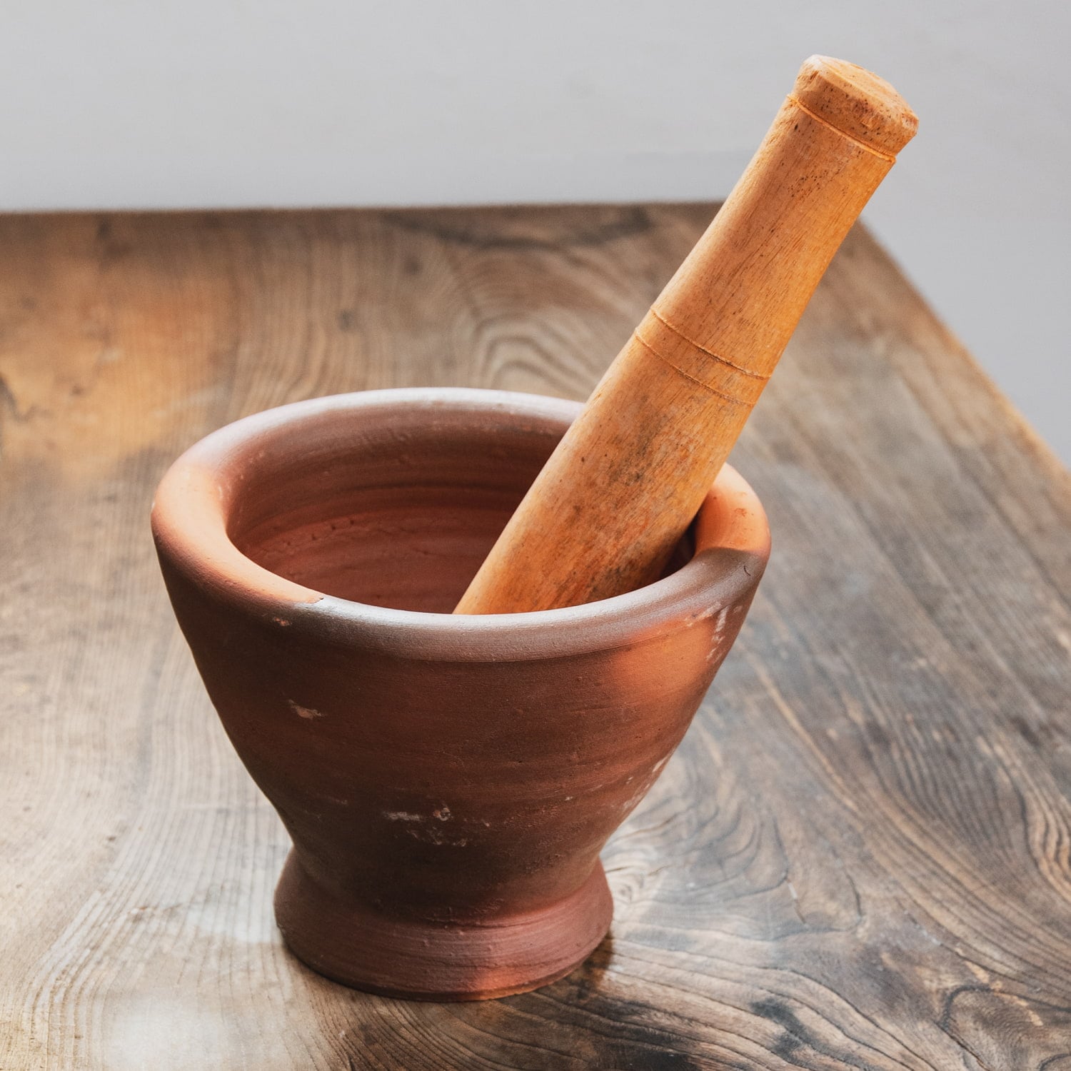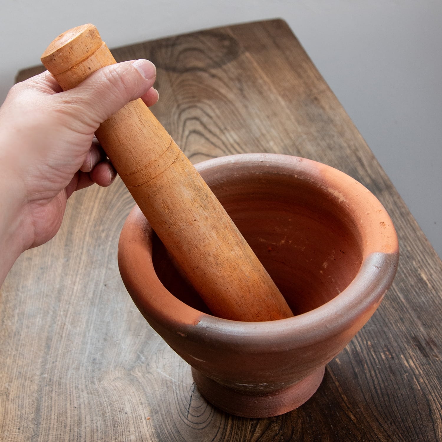 焼き締められた素焼きの質感が特徴で、使うほどに味わいが増していきます。ひとつひとつに個体差があり、手仕事ならではの雰囲気をお楽しみいただけます。本商品は陶器製のため、硬いスパイスや大量の食材を強くすり潰す用途には向いておりません。軽く叩いて和える用途でご使用ください。