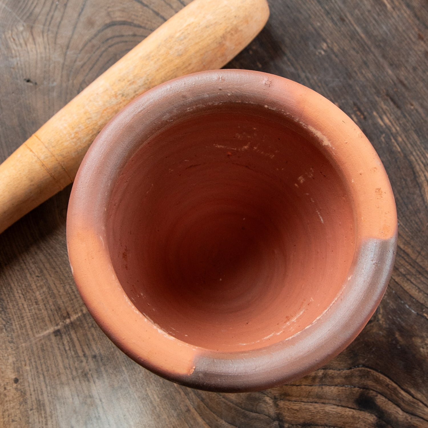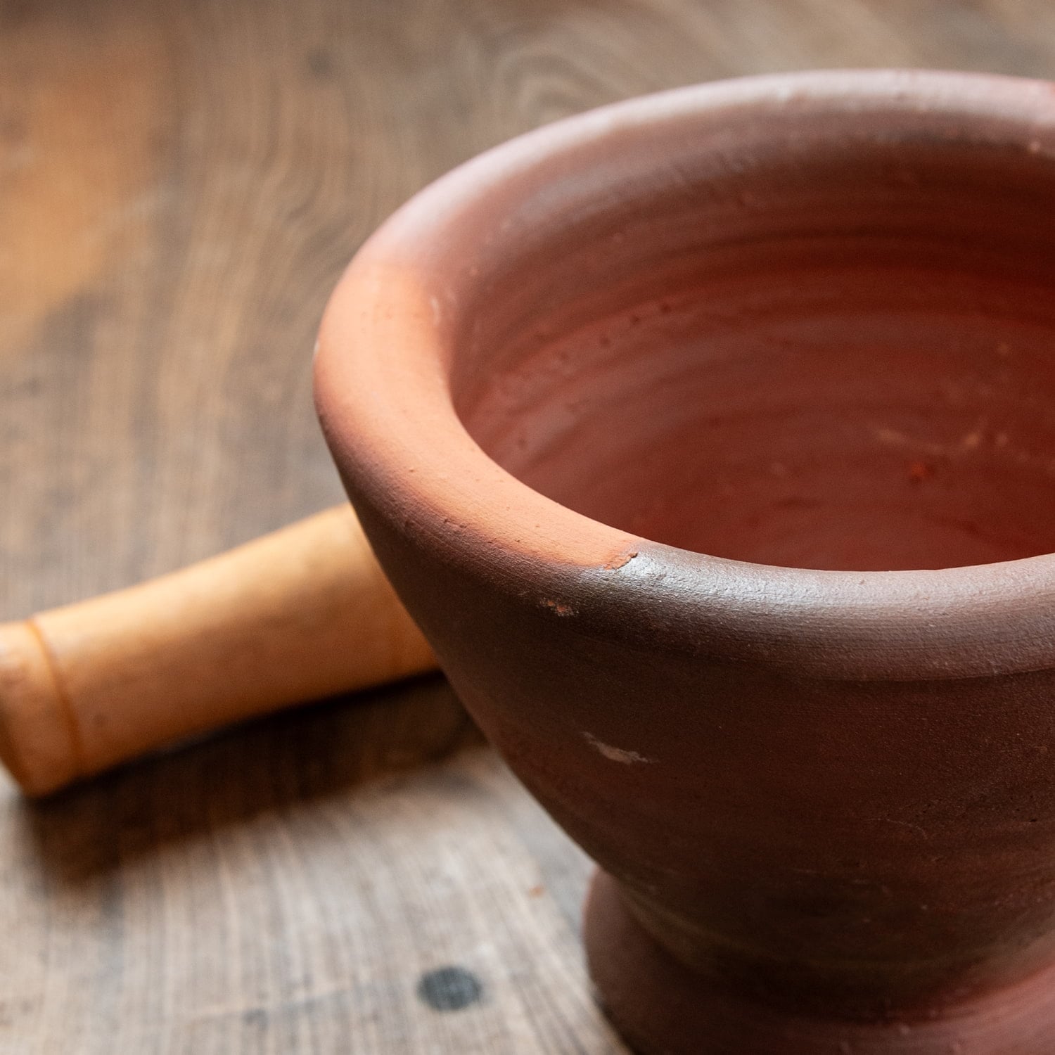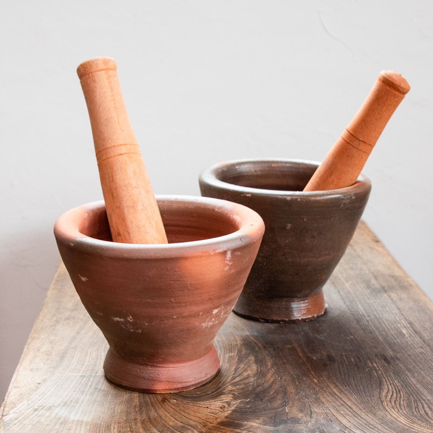 焼き締められた素焼きの質感が特徴で、使うほどに味わいが増していきます。ひとつひとつに個体差があり、手仕事ならではの雰囲気をお楽しみいただけます。本商品は陶器製のため、硬いスパイスや大量の食材を強くすり潰す用途には向いておりません。軽く叩いて和える用途でご使用ください。