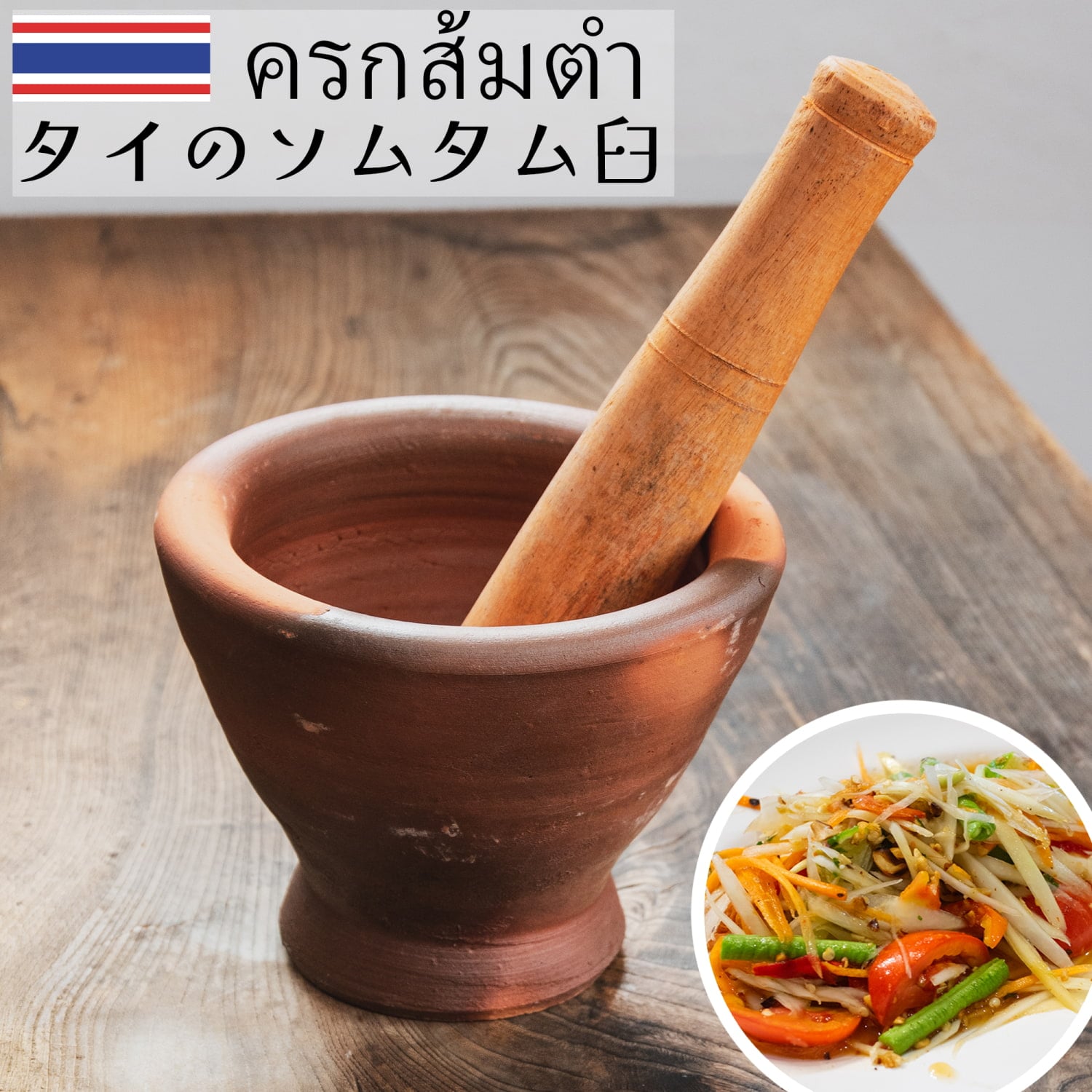 タイ料理の定番「ソムタム(青パパイヤサラダ)」を作る際に使われる、現地でも親しまれている臼と杵のセットです。タイ語で臼は「クロック」と呼ばれ、こちらは軽く叩いて材料を和えるタイプになります。■なぜ叩く?ソムタムの調理法