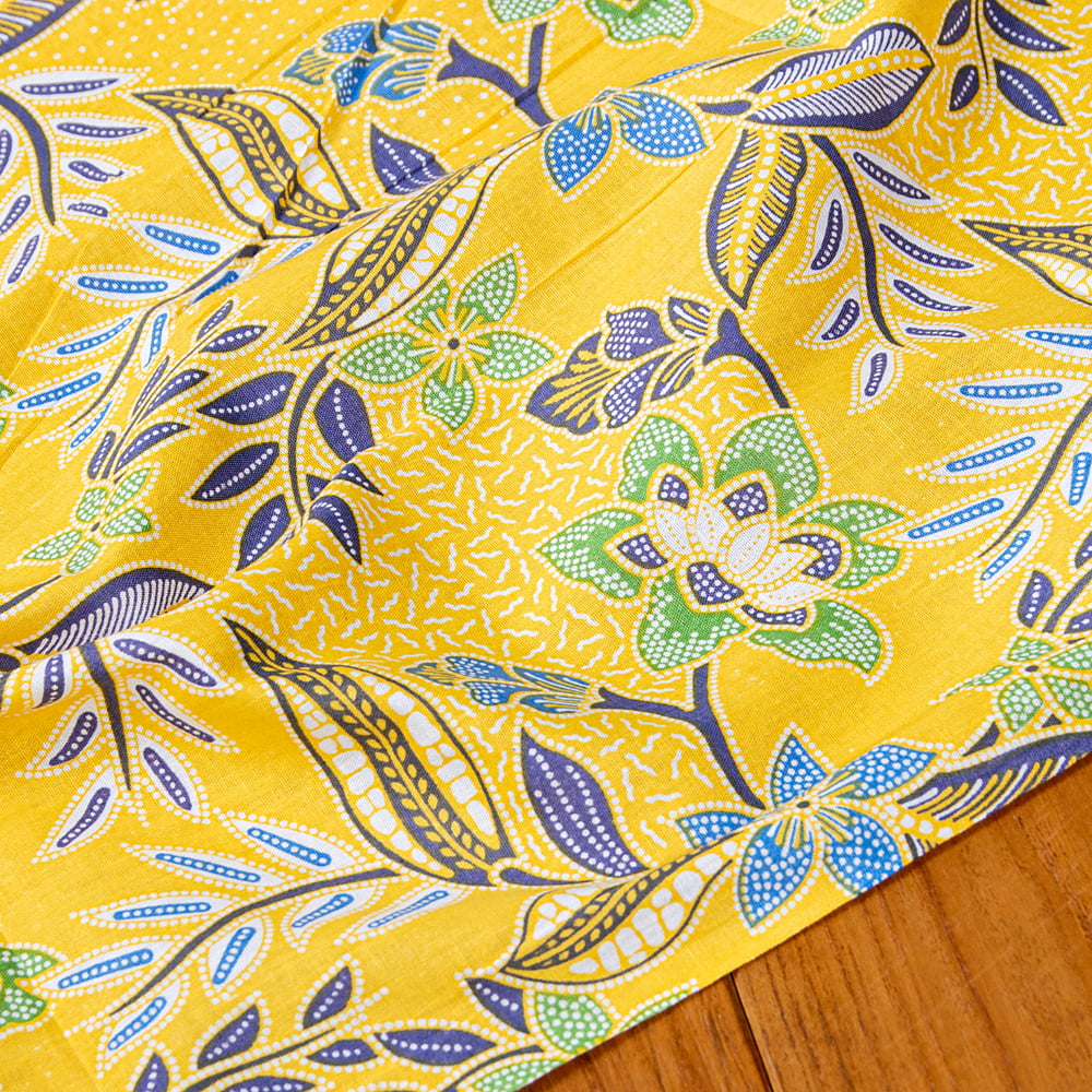 染めの部分が非常に独特なパターンを持つインドネシア伝統の染め方、ろうけつ染めをプリントして作成したアジア布のバティック。ジャワ更紗とも呼ばれています。インドネシアのバティックは、ジャワ王国の王宮文化が起源とされています。かつては、王宮の貴族のみが着用できるものでした。