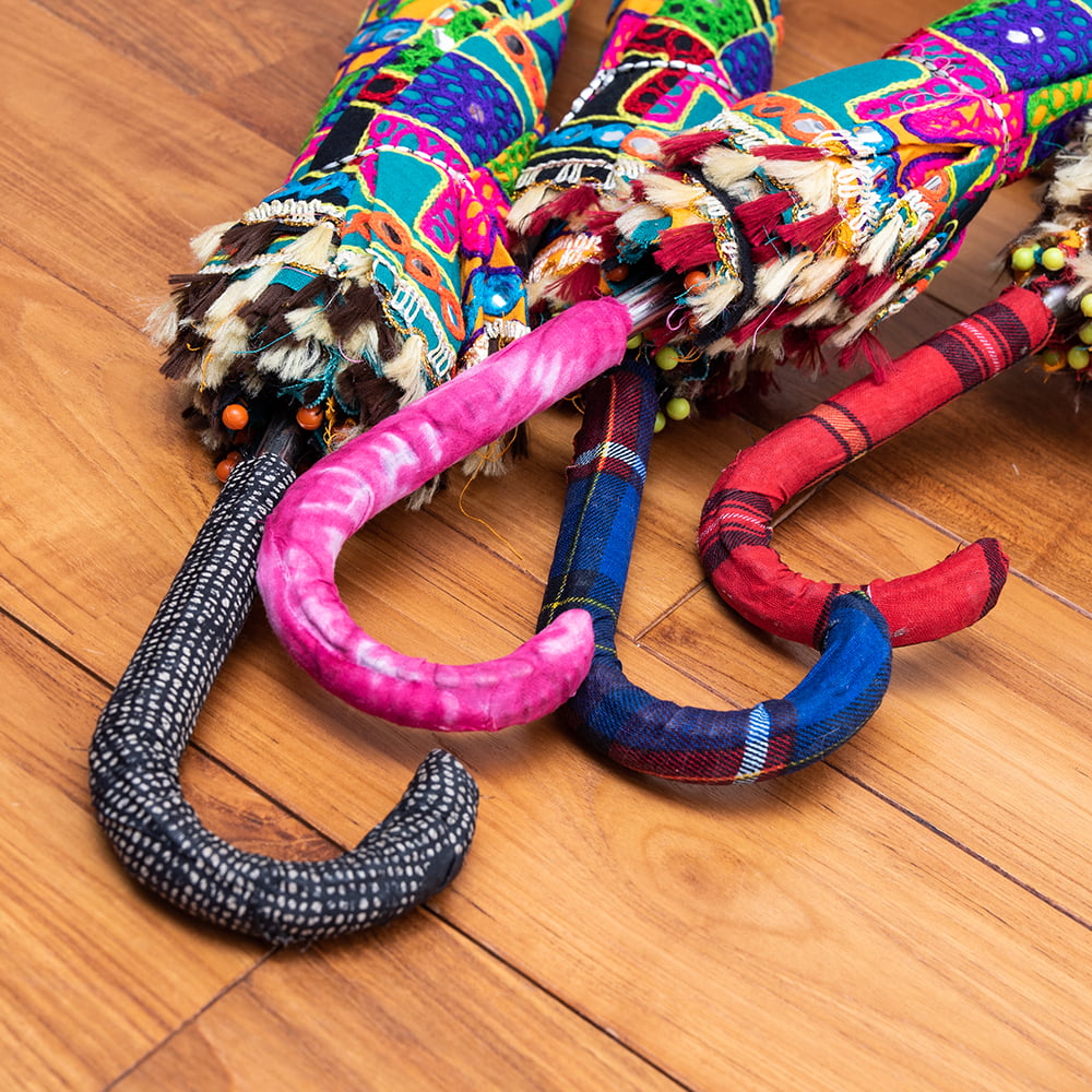 砂漠を擁するインド北西部・ラジャスタンから色とりどりの傘が届きました。コットンの上にカラフルな刺繍が走り、ミラーワークが施された、いかにもインドらしい日傘になっています。ラジャスタンはインドのなかでも特にカラフルな印象があり、町中を歩いているとこうした極彩色の傘がずらっと並べられている情景が見られます。