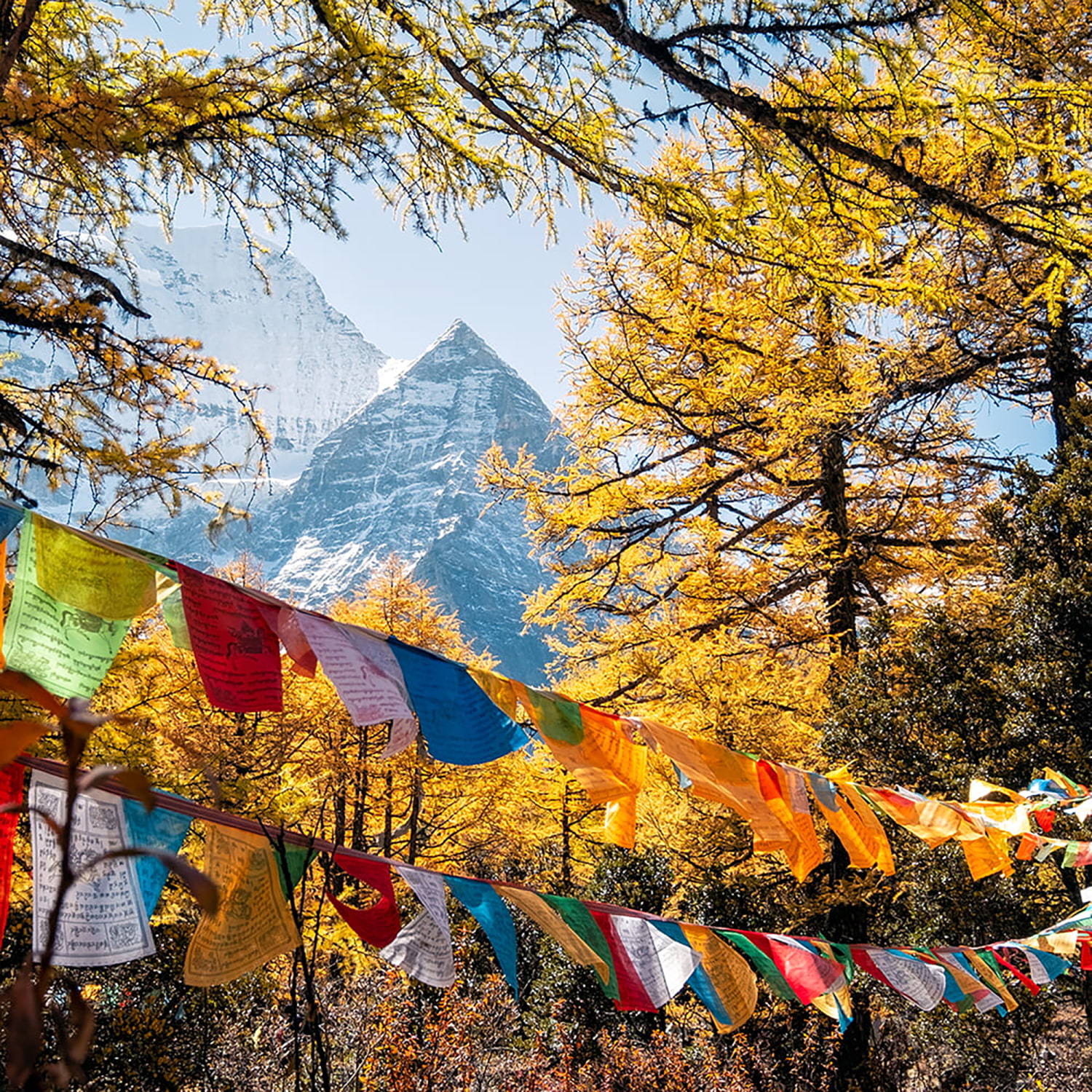 チベットやネパール、北インド地方等で、その特徴的な風景の中でも一際目を引く、タルチョーと呼ばれる5色の旗があります。このタルチョーには経文が書かれており、この旗を飾り、それが風になびく度に、読経したことになるのだそうです。