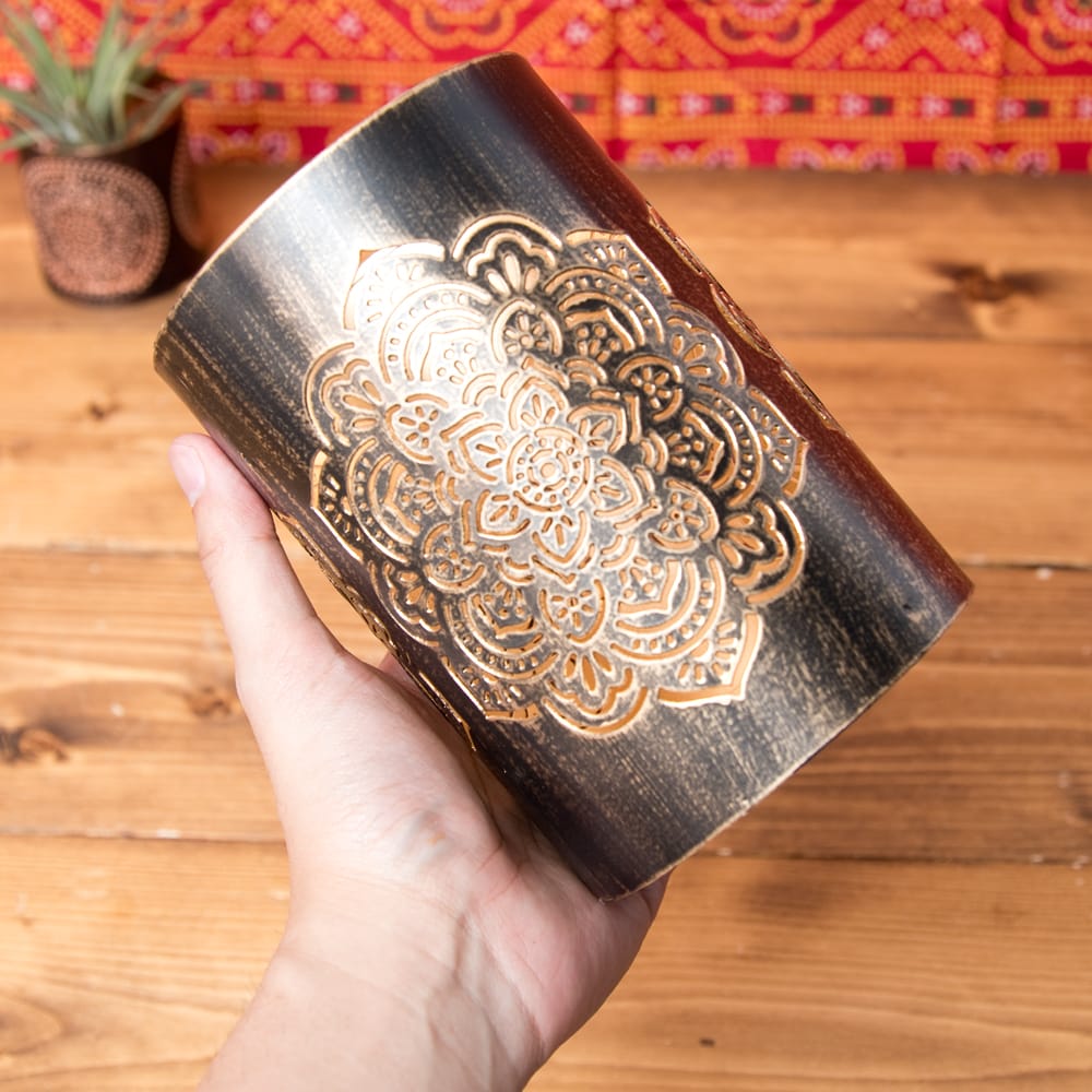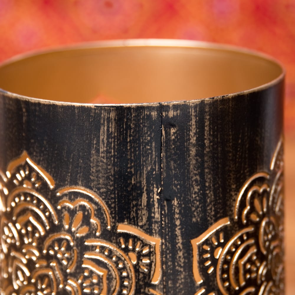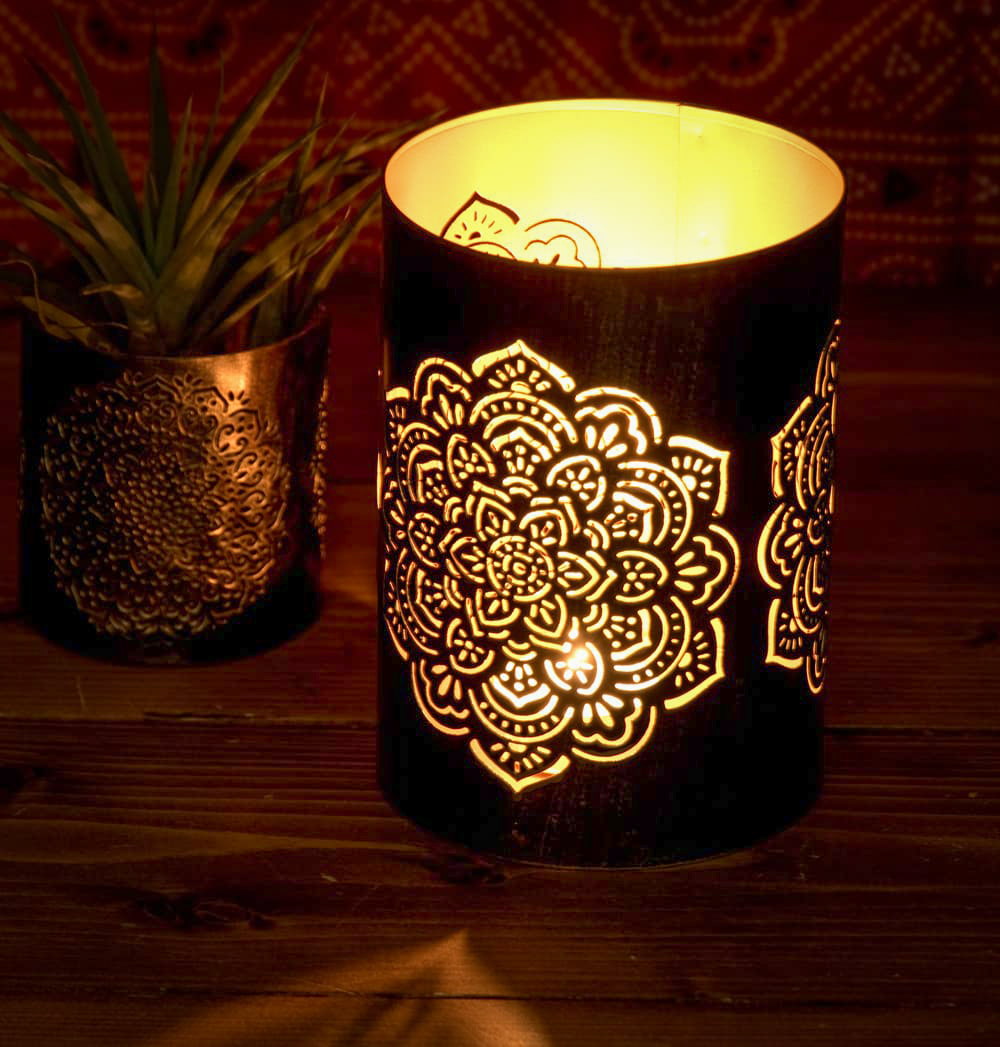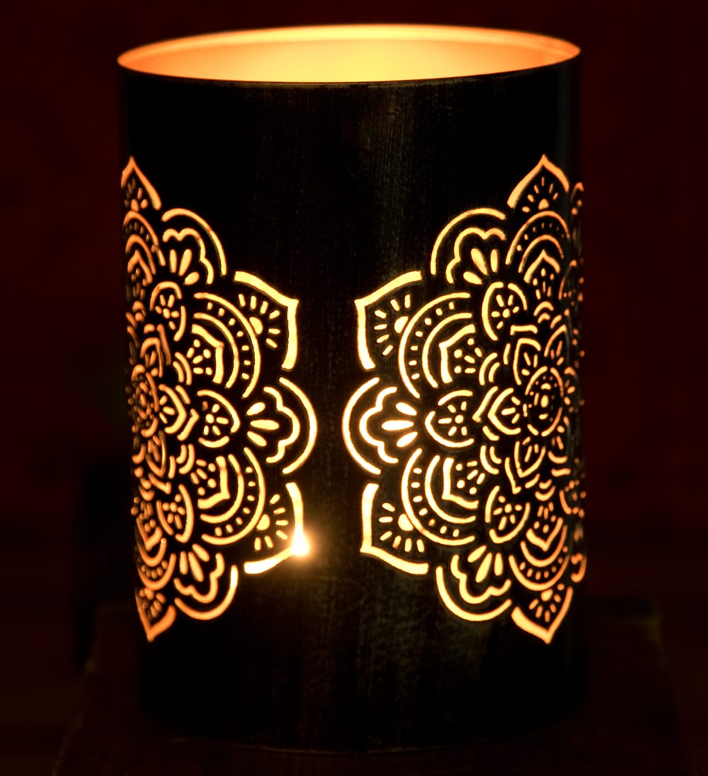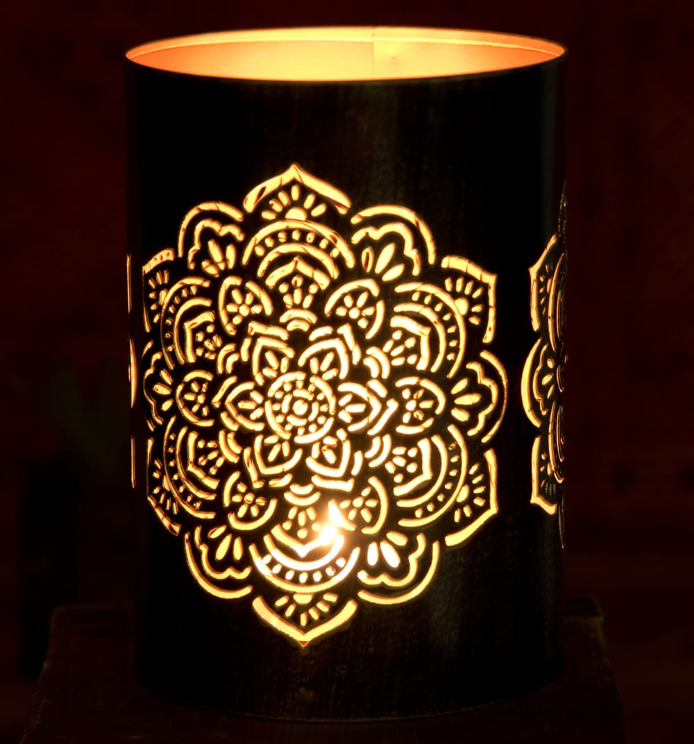 この幾何学模様の透かし彫りが美しいマンダラランプもまた、彼らの素晴らしい美意識が生み出した素敵な逸品です。黒い外側ですが、内側は金路に塗られ、美しい幾何学模様に空けられた穴からは、キャンドルを灯さずとも金色に光って見えます。