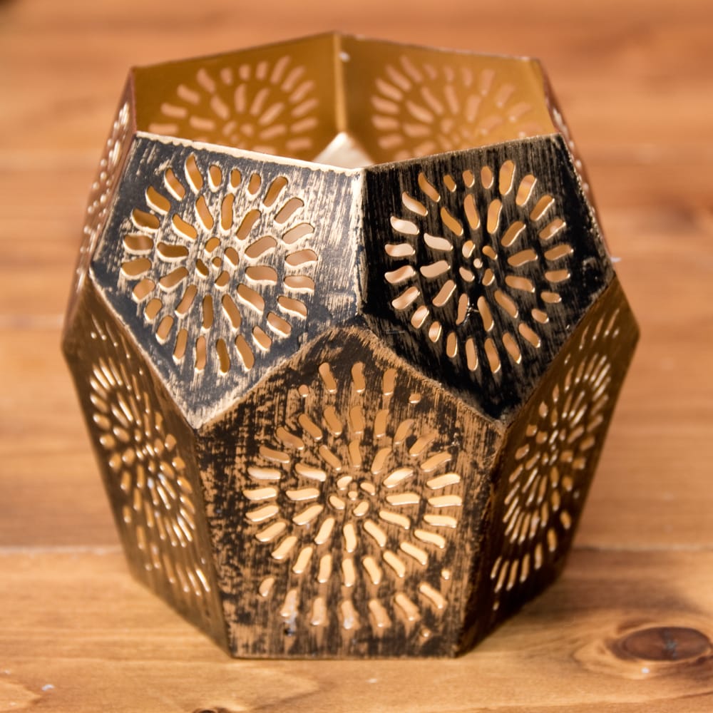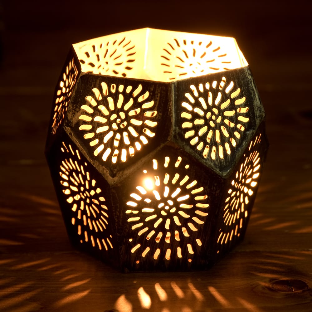 この幾何学模様の透かし彫りが美しいマンダラランプもまた、彼らの素晴らしい美意識が生み出した素敵な逸品です。黒い外側ですが、内側は金路に塗られ、美しい幾何学模様に空けられた穴からは、キャンドルを灯さずとも金色に光って見えます。