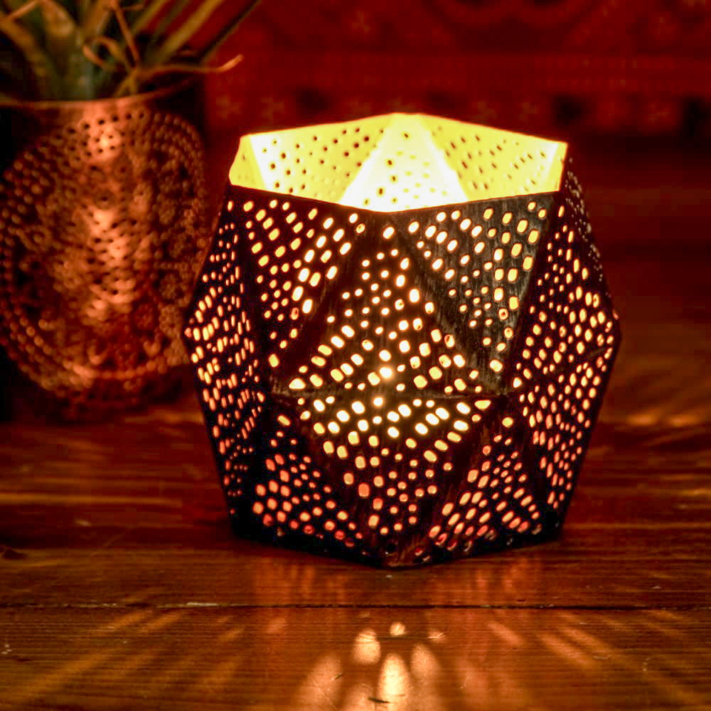 この幾何学模様の透かし彫りが美しいマンダラランプもまた、彼らの素晴らしい美意識が生み出した素敵な逸品です。黒い外側ですが、内側は金路に塗られ、美しい幾何学模様に空けられた穴からは、キャンドルを灯さずとも金色に光って見えます。