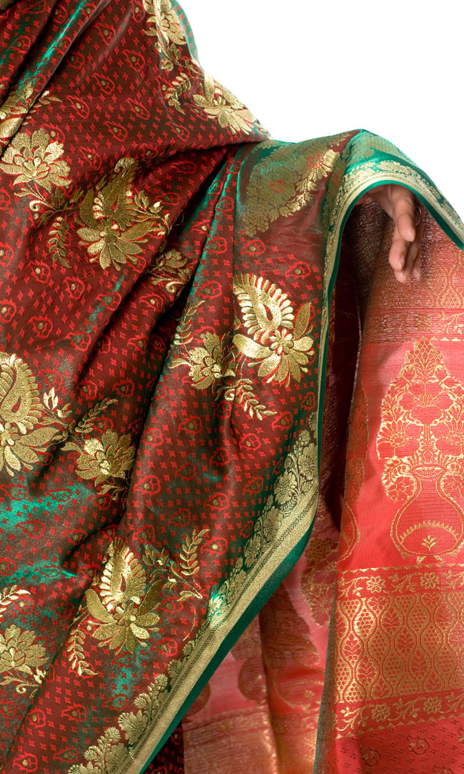 サリーはただの布ですので、完全にフリーサイズ。巻きの長さの調整をして頂ければ、安心してお楽しみ頂けます。ベナレスのインドサリー【金糸刺繍】 赤×緑の類似商品